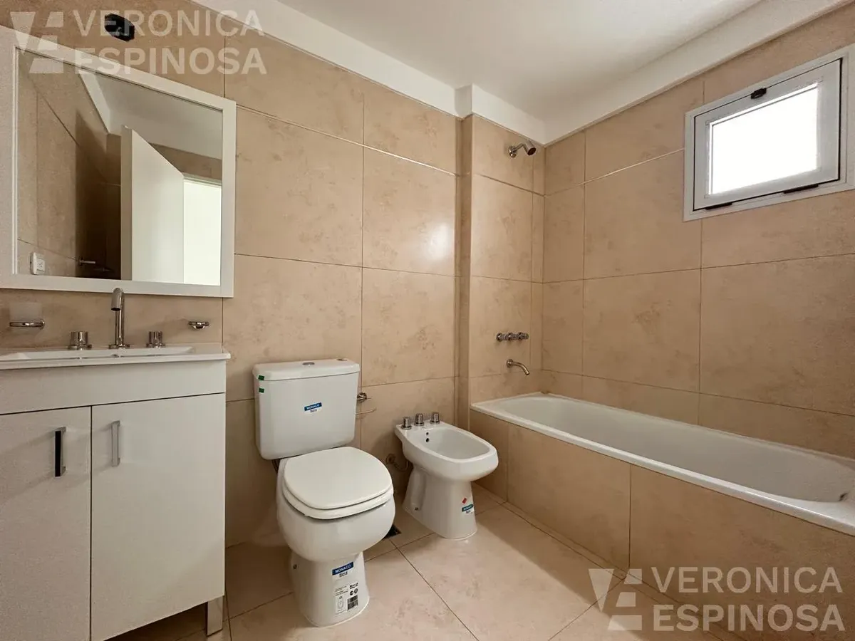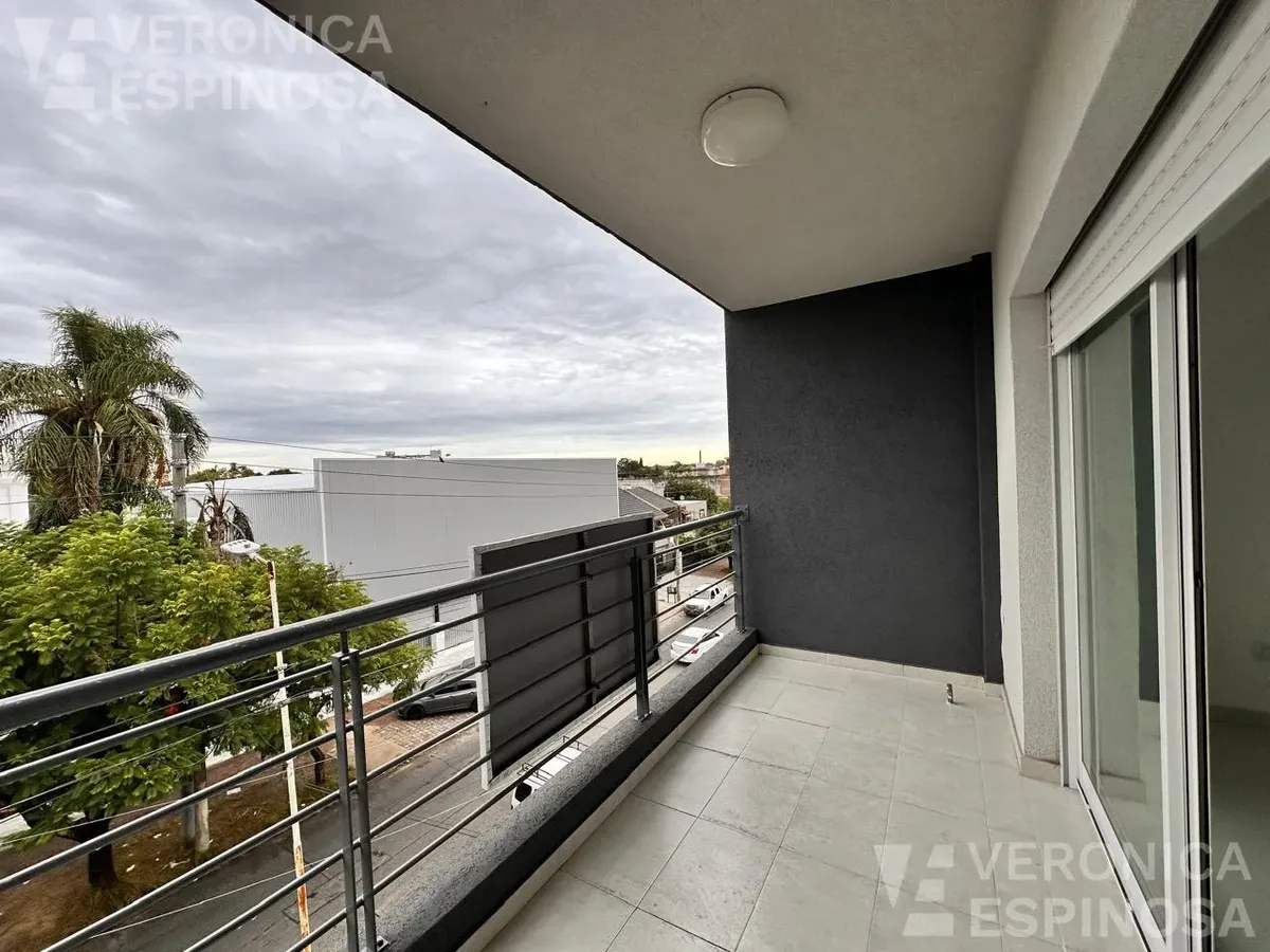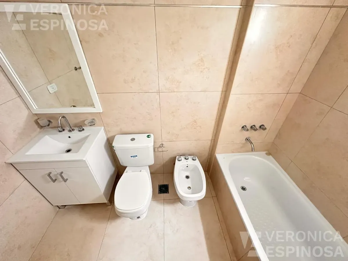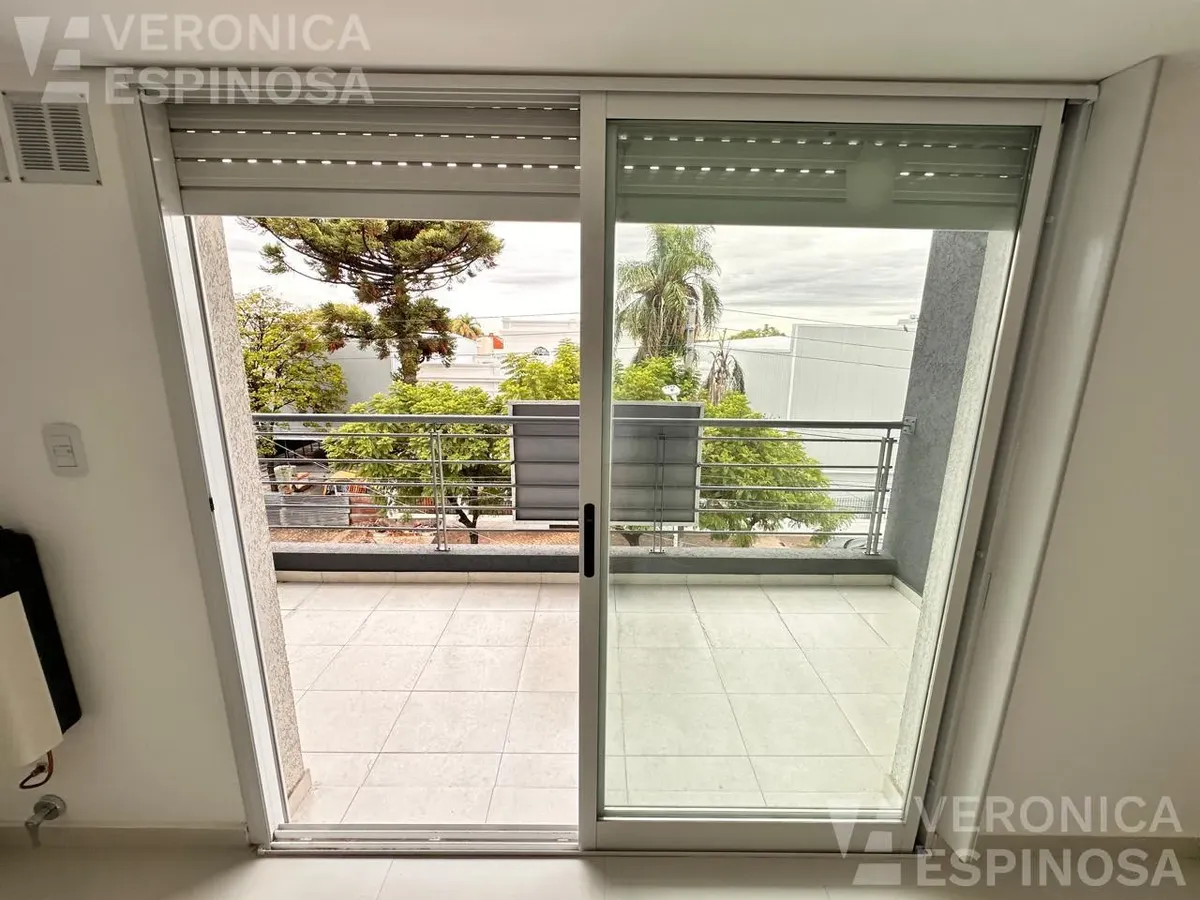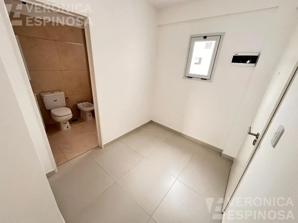 One-room apartment in Morón with an integrated kitchen, built-in base cabinets and overhead storage, a living area with access to a balcony, and a full bathroom with a bathtub. The kitchen includes a Longvie four-burner unit with oven and window/visor glass and lighting. Heating is via a balanced-flue heater, with pre-installation for air-conditioning pipework. Double-glazed windows and sliding door windows (DVH) are installed. An (assigned) parking space is included. No pets are accepted; renta