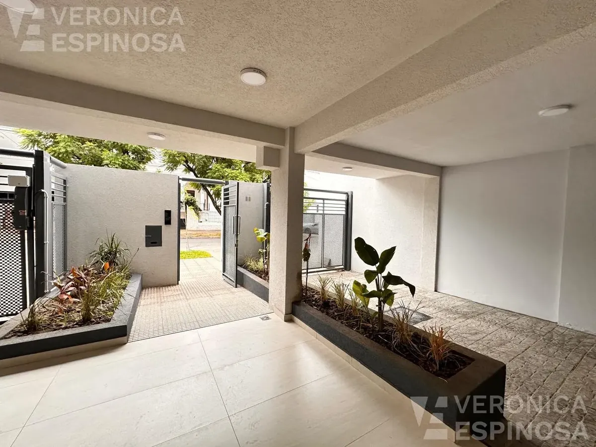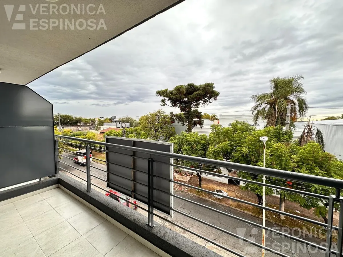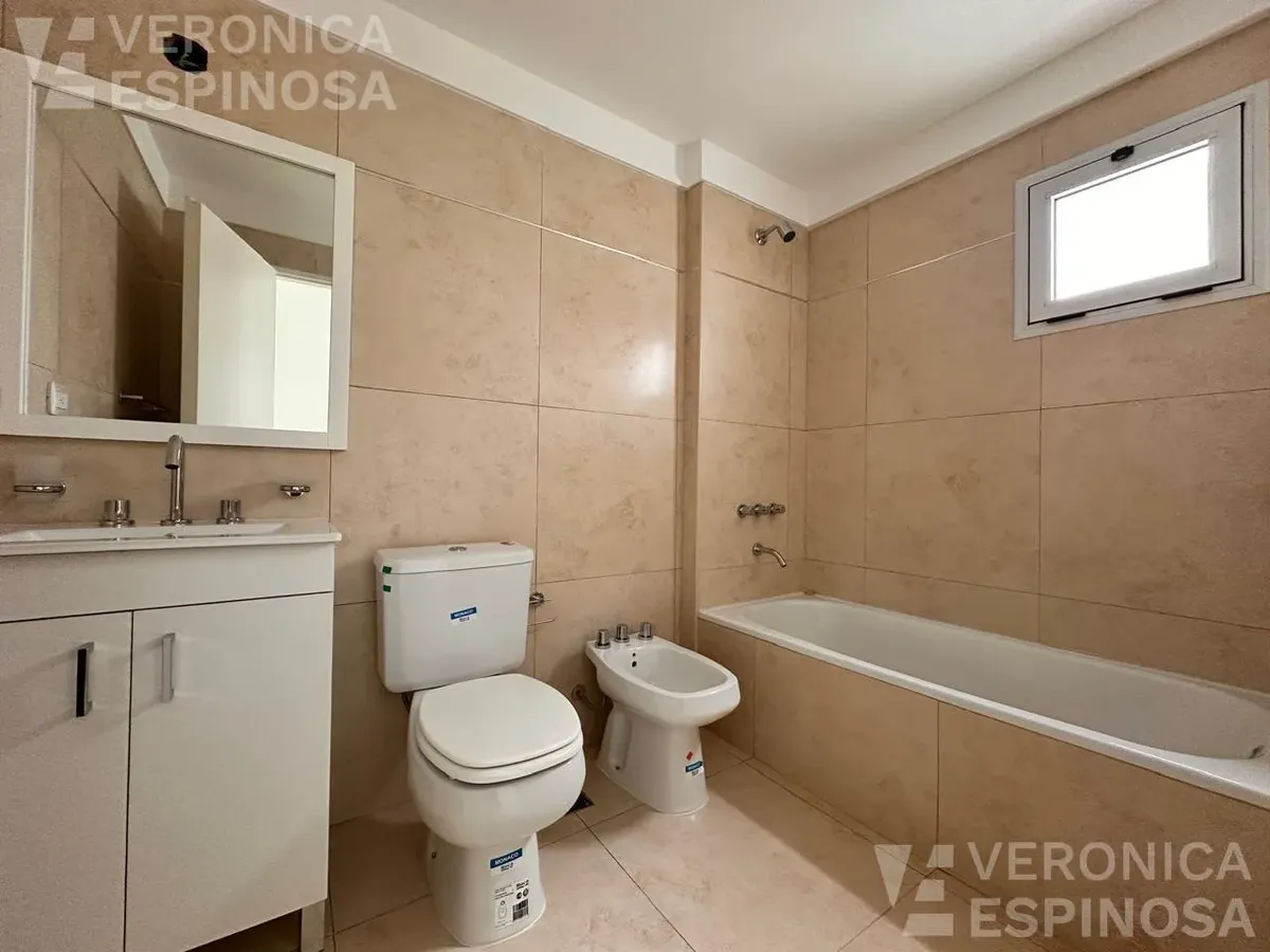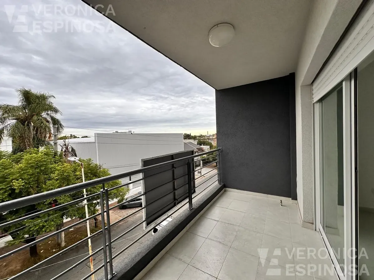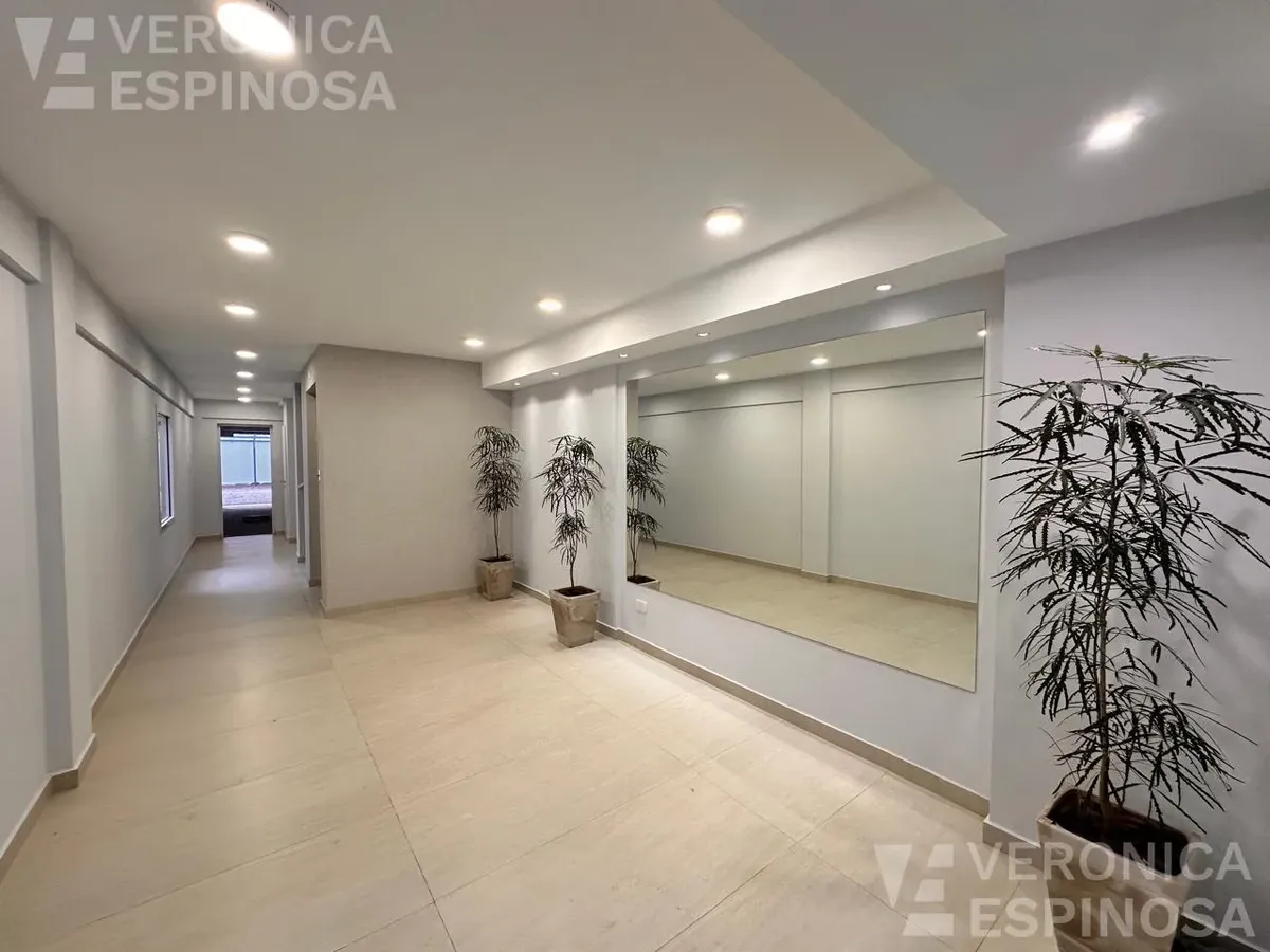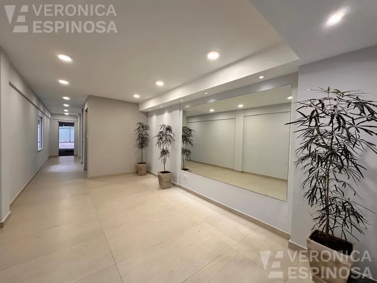 One-room apartment in Morón with an integrated kitchen, built-in base cabinets and overhead storage, a living area with access to a balcony, and a full bathroom with a bathtub. The kitchen includes a Longvie four-burner unit with oven and window/visor glass and lighting. Heating is via a balanced-flue heater, with pre-installation for air-conditioning pipework. Double-glazed windows and sliding door windows (DVH) are installed. An (assigned) parking space is included. No pets are accepted; renta