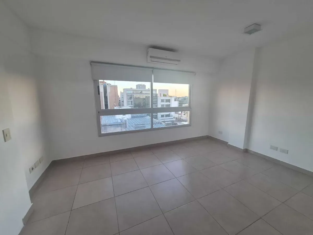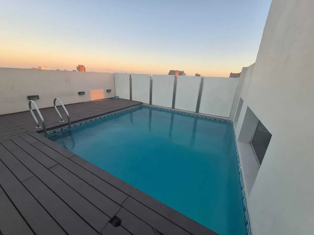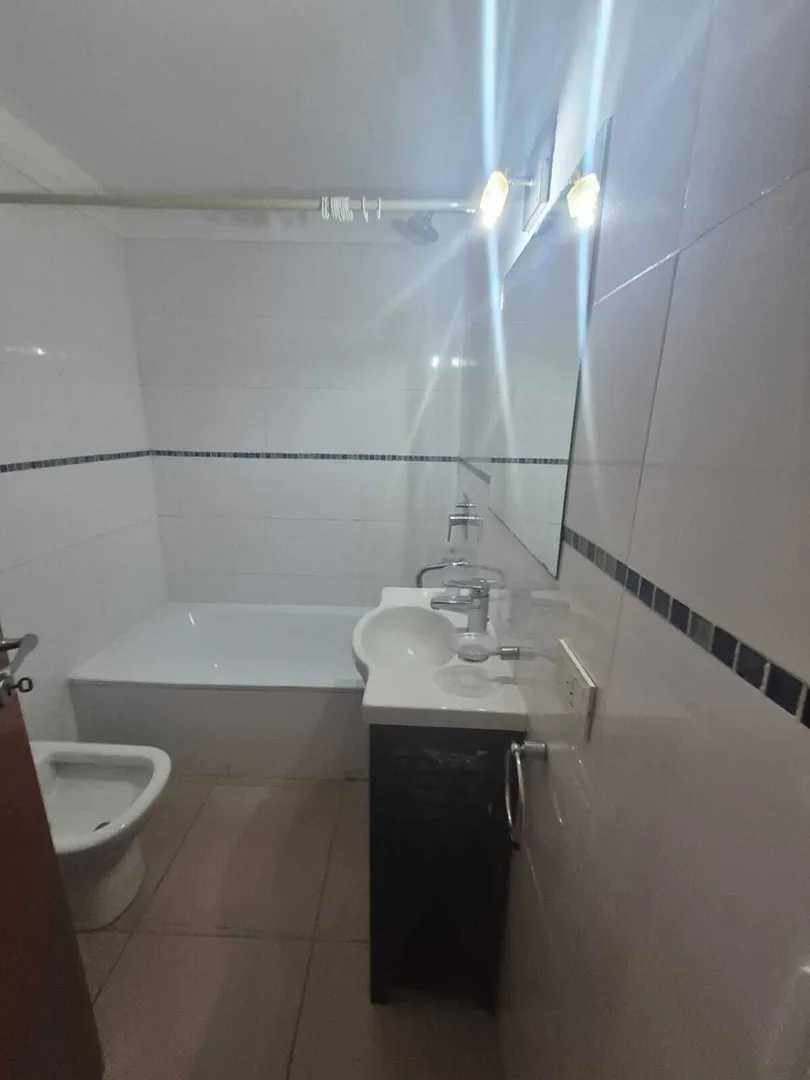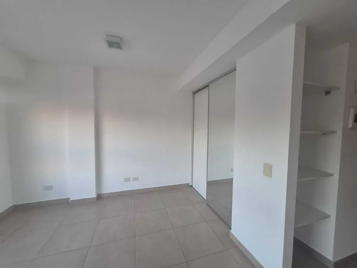 Studio apartment for rent in Castelar Norte. Main room with built-in mirrored closet and an air-conditioning unit installed. Separate equipped kitchen and a full bathroom with bathtub. The building has a communal room (SUM), laundry facilities and a rooftop pool with a deck. No assigned parking space. Pets are not accepted. Rent is $569.000 and building fees (expensas) are $150.000, with quarterly adjustment by IPC.