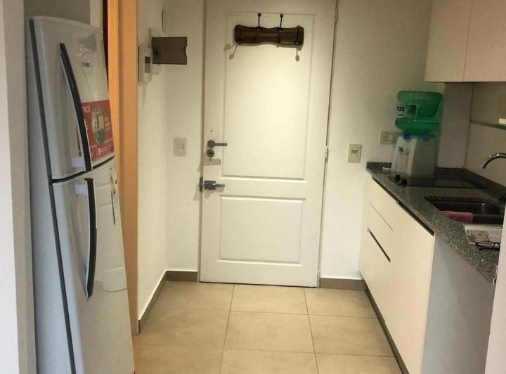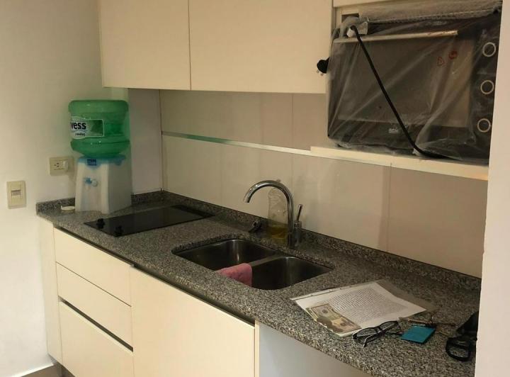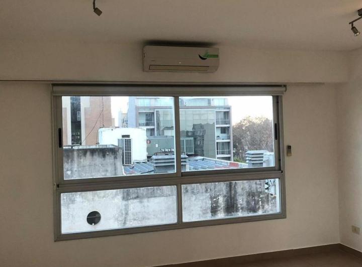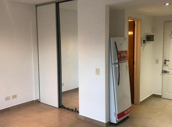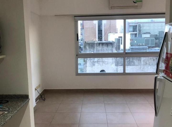 Studio apartment for rent in Castelar Centro, Morón. It has a fully equipped kitchen, a full bathroom, a built-in wardrobe and air-conditioning units. The building has communal facilities including a laundry area with washing and drying machines and a grill, with low building fees.