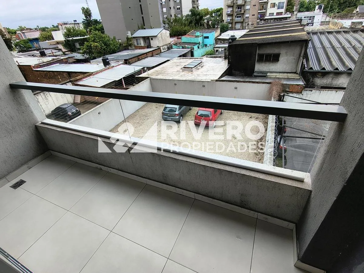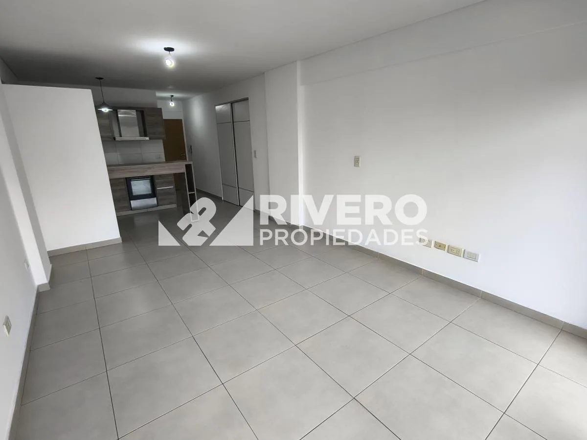 Divisible studio apartment. The kitchen is fully equipped with a breakfast bar, upper cabinets and base units. There is a hallway with a built-in closet with interior fittings and a bathroom with a bathtub. The listing mentions an installation for a washing machine and a balcony described as large. No pets are accepted. Rental term is 2 years, with rent increases every 3 months linked to ICL. Building fees (expensas) may vary.