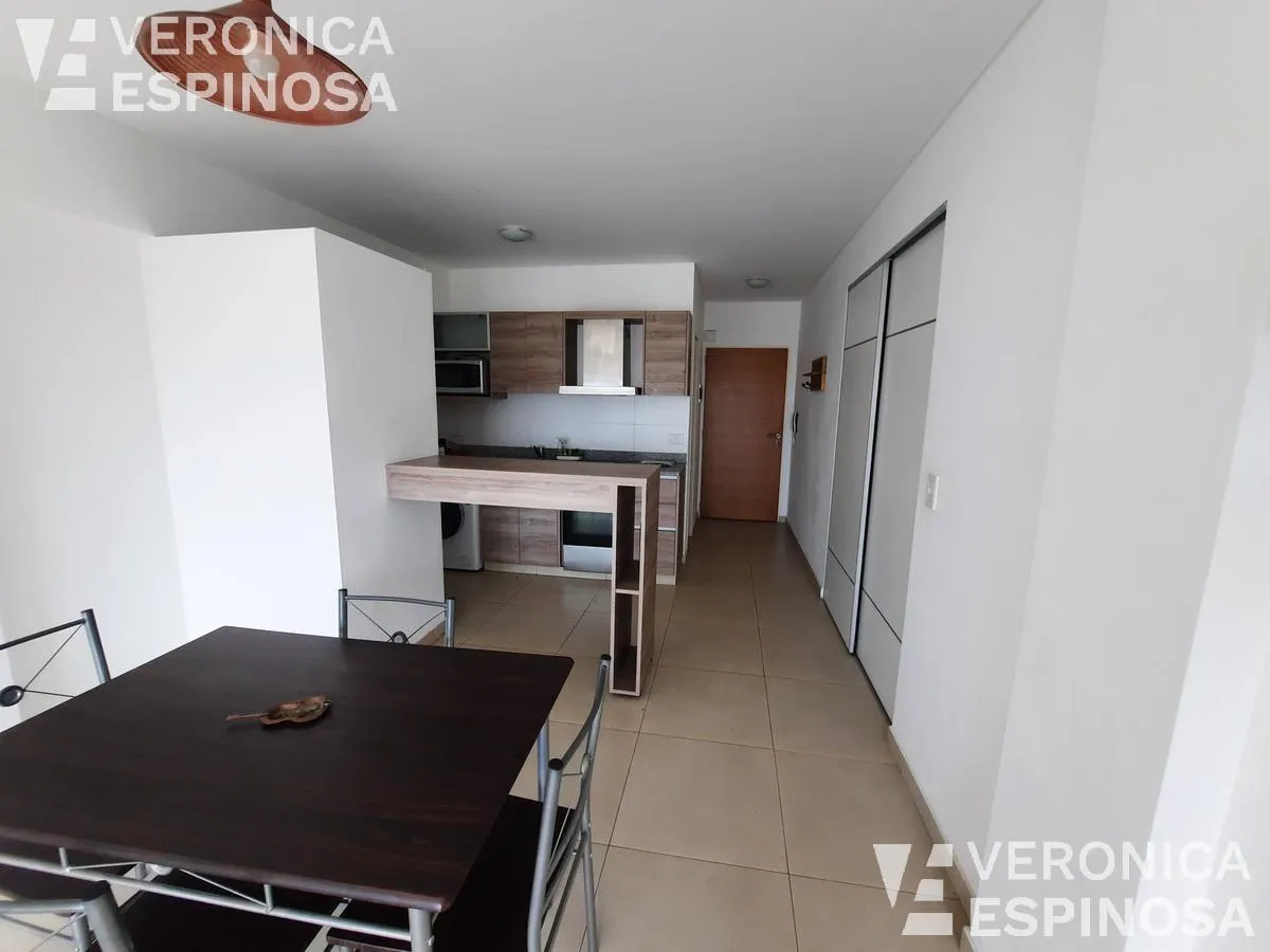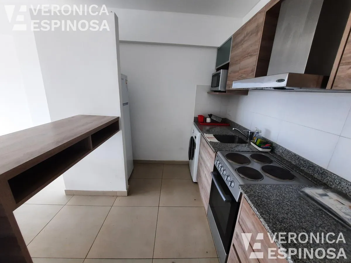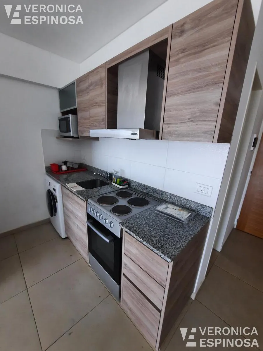 Studio apartment for rent in Morón Norte, located on Calle Cnel. Machado 1045. The unit includes a balcony, an integrated kitchen with upper and lower cabinets, granite countertop, stainless-steel sink and single-lever faucet, a dining area, and a full bathroom with bathtub. It is delivered equipped with a fridge, microwave, electric stove with oven, washing machine, dining table with four chairs, and air conditioning. Professional use permitted.
