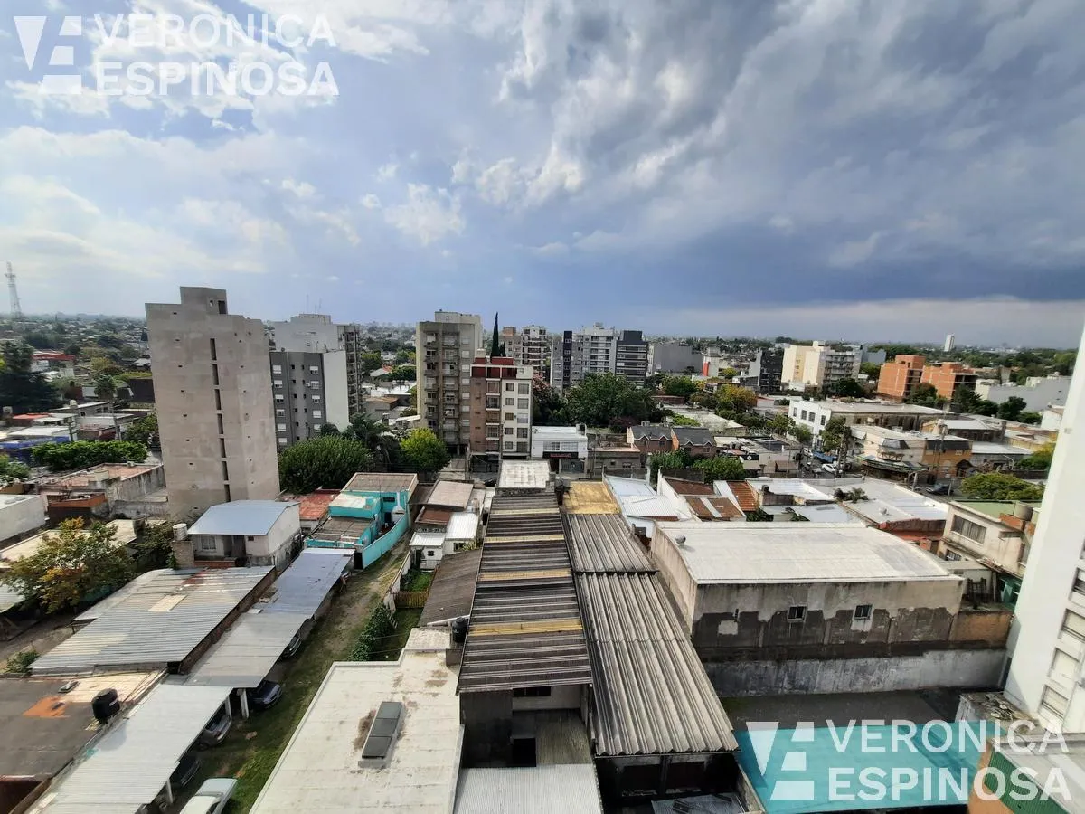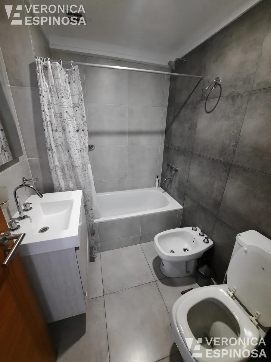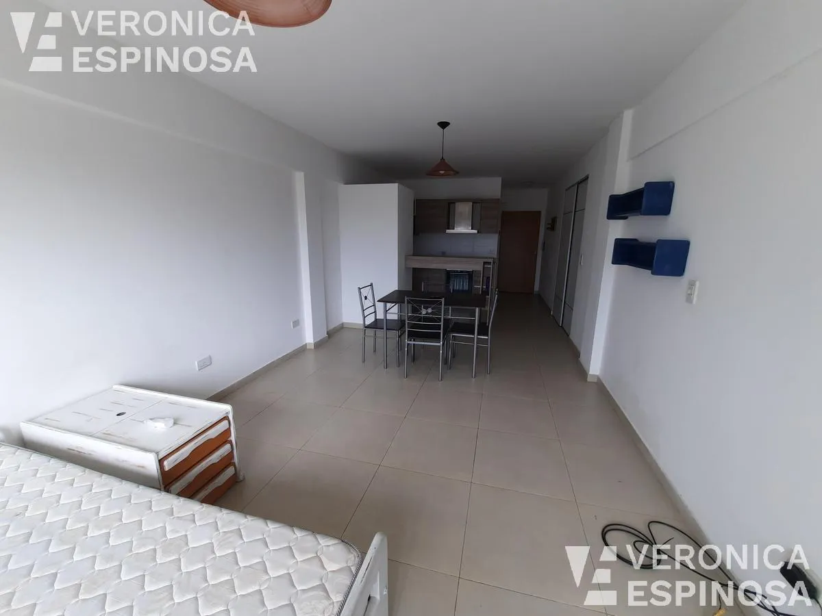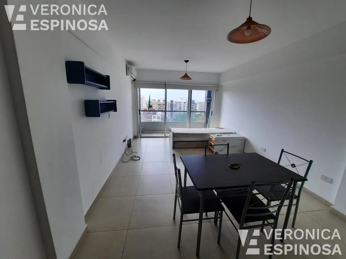 Studio apartment for rent in Morón Norte, located on Calle Cnel. Machado 1045. The unit includes a balcony, an integrated kitchen with upper and lower cabinets, granite countertop, stainless-steel sink and single-lever faucet, a dining area, and a full bathroom with bathtub. It is delivered equipped with a fridge, microwave, electric stove with oven, washing machine, dining table with four chairs, and air conditioning. Professional use permitted.