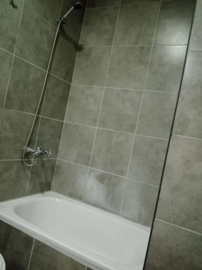Unfurnished studio apartment with a balcony. The kitchen has white melamine cabinetry, white ceramic finishes and a marble-effect countertop. The bathroom is fully tiled and includes a bathtub and mirror, with two melamine sliding-door wardrobes. The building is protected with an electric fence. A residents’ communal room on the roof includes a grill, a table for 12 guests, a bathroom, and air conditioning; it also lists a hotplate, sink and refrigerator. The building is about 200 metres from Sa
