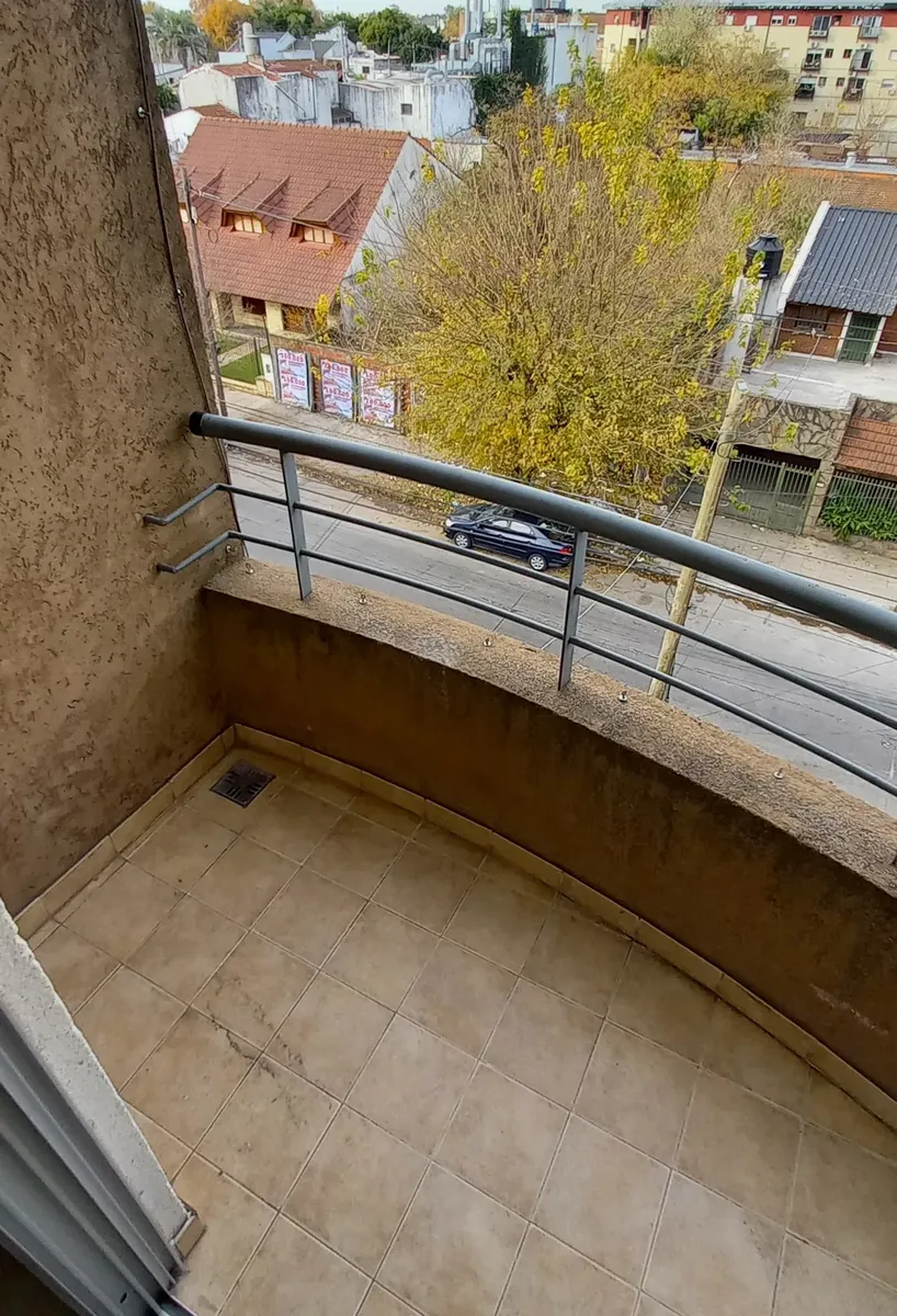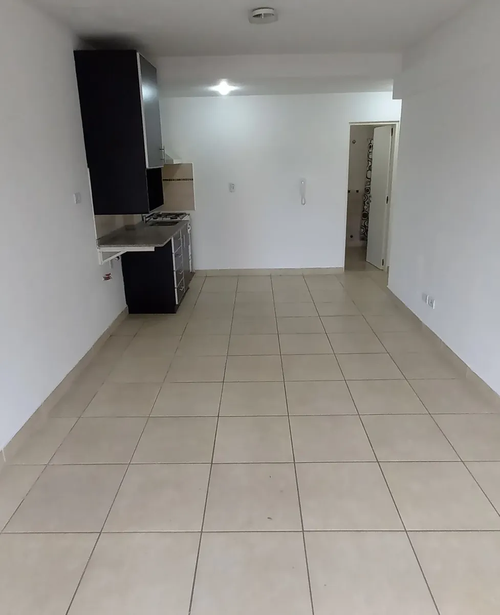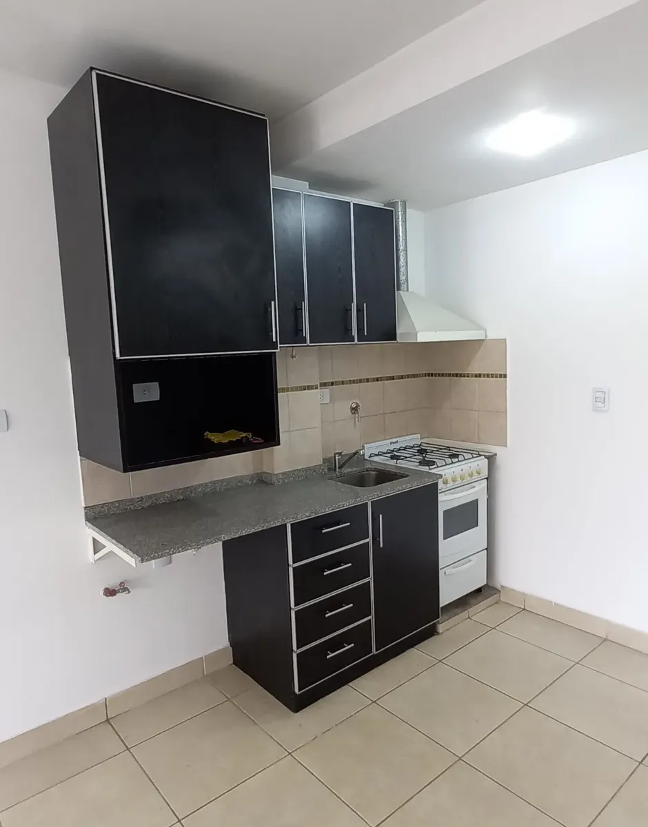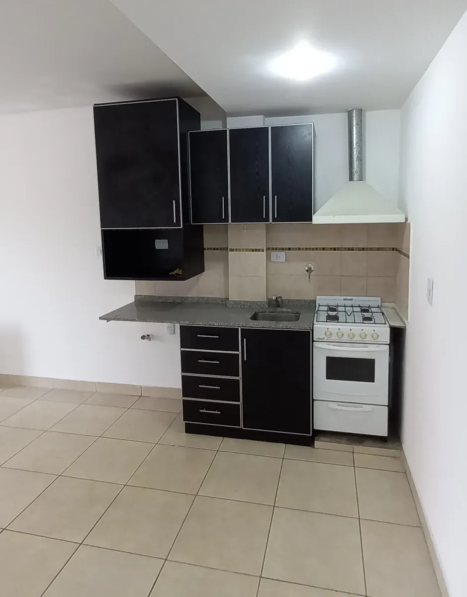 Studio apartment in Morón, courtyard-facing (contrafrente) with a balcony. It has a kitchenette with gas cooking appliances, an electric water heater (termotanque), a complete bathroom with a bathtub, and a wall-mounted balanced-flue heater. A continuous balcony includes a connection for a washing machine; there is access to a shared terrace for hanging laundry and grilling, plus an uncovered parking space. Up to 2 occupants, no pets.