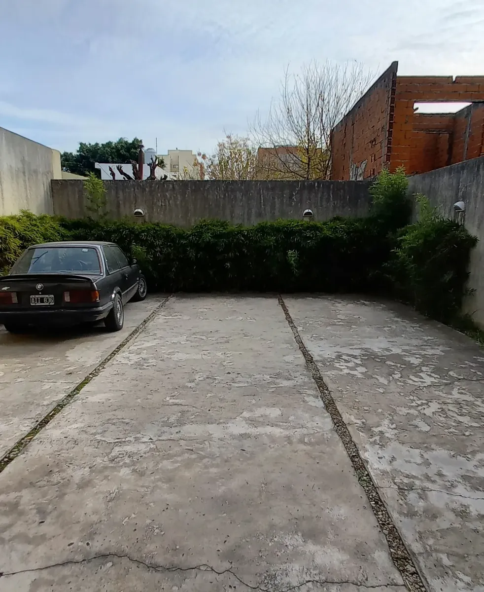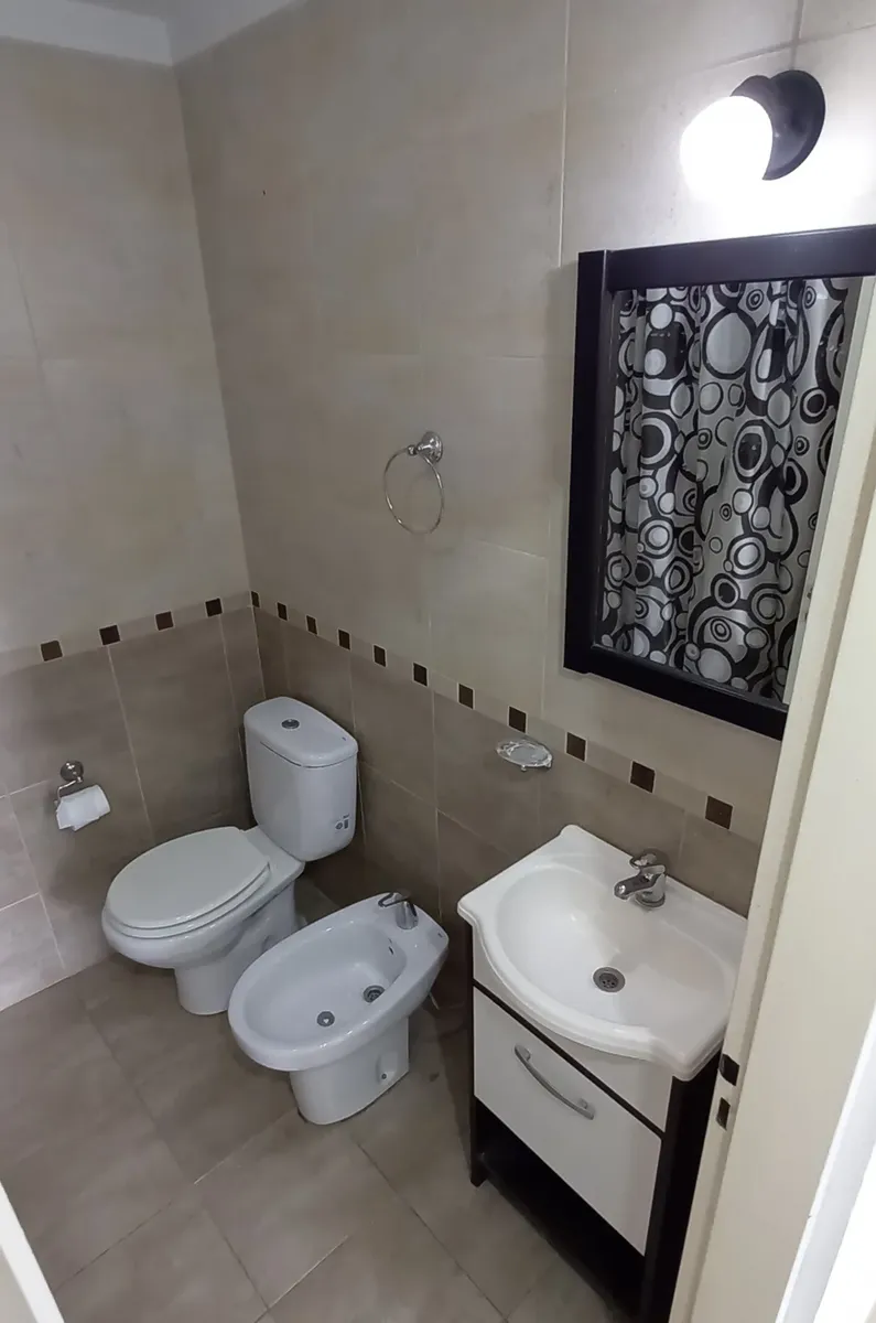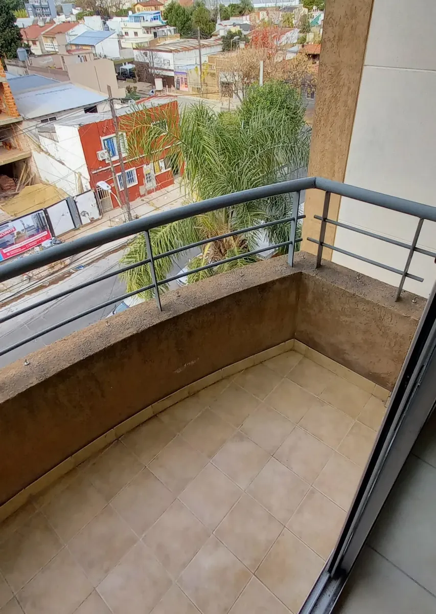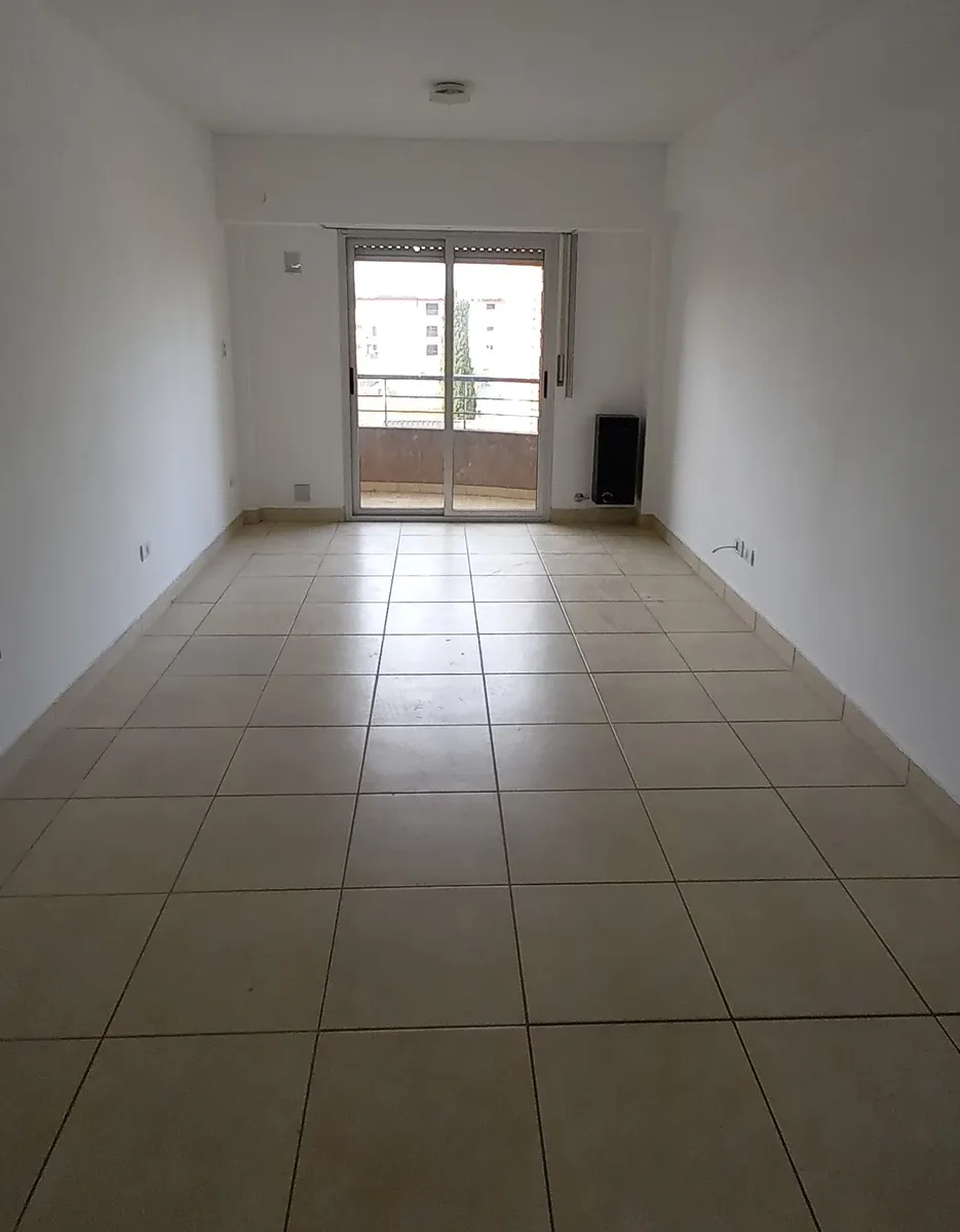 Studio apartment in Morón, courtyard-facing (contrafrente) with a balcony. It has a kitchenette with gas cooking appliances, an electric water heater (termotanque), a complete bathroom with a bathtub, and a wall-mounted balanced-flue heater. A continuous balcony includes a connection for a washing machine; there is access to a shared terrace for hanging laundry and grilling, plus an uncovered parking space. Up to 2 occupants, no pets.