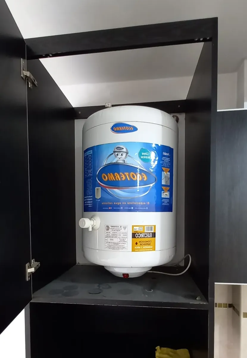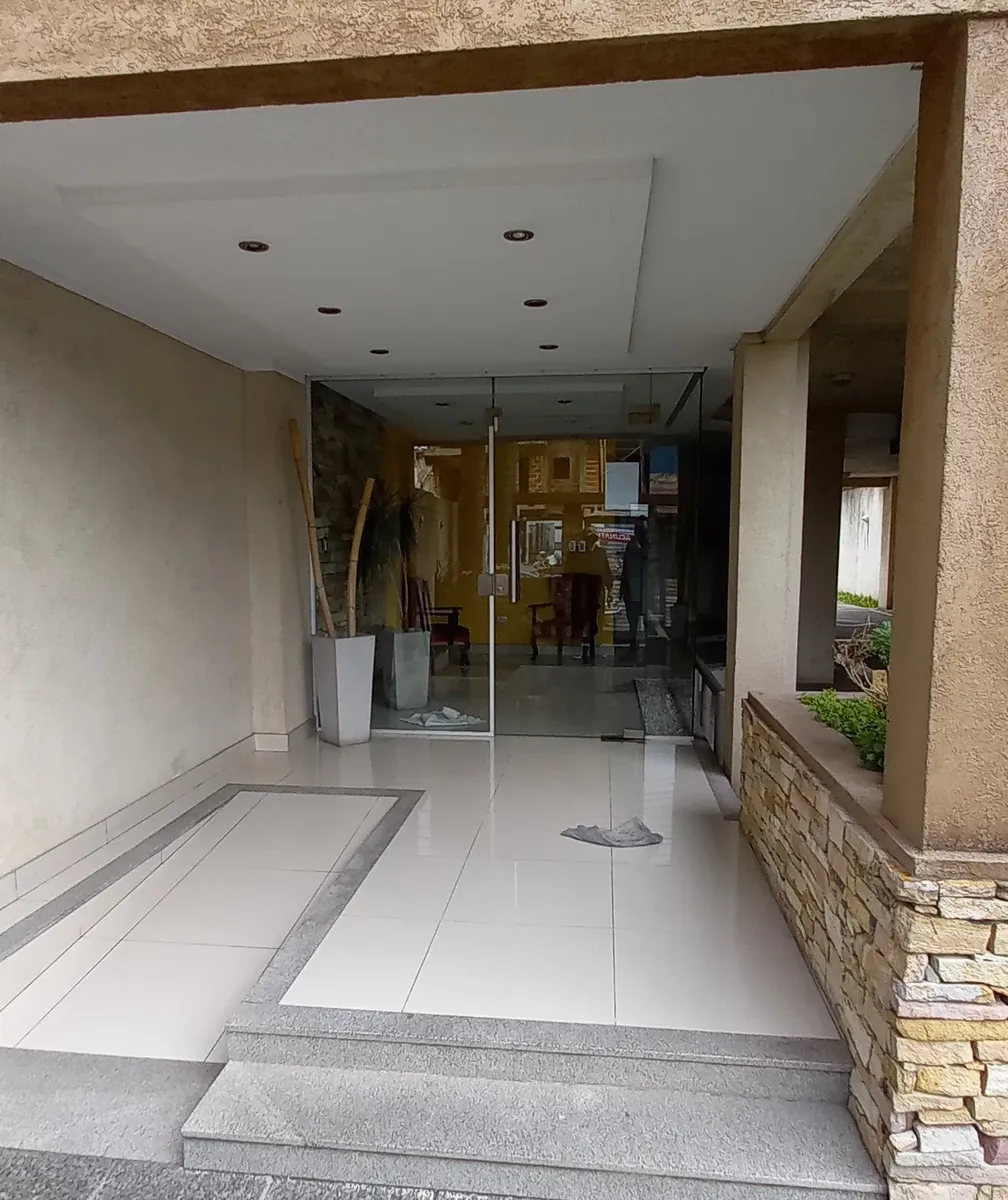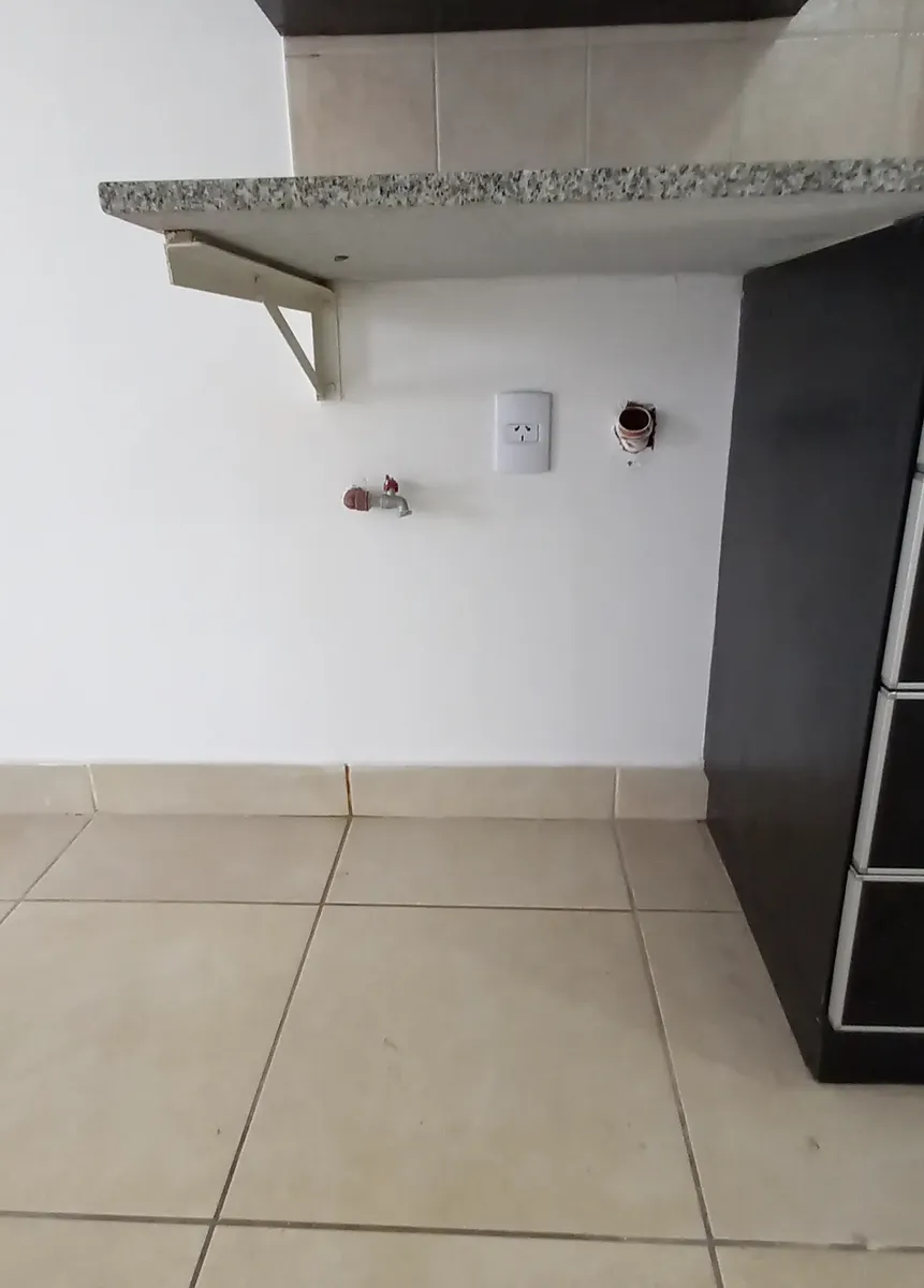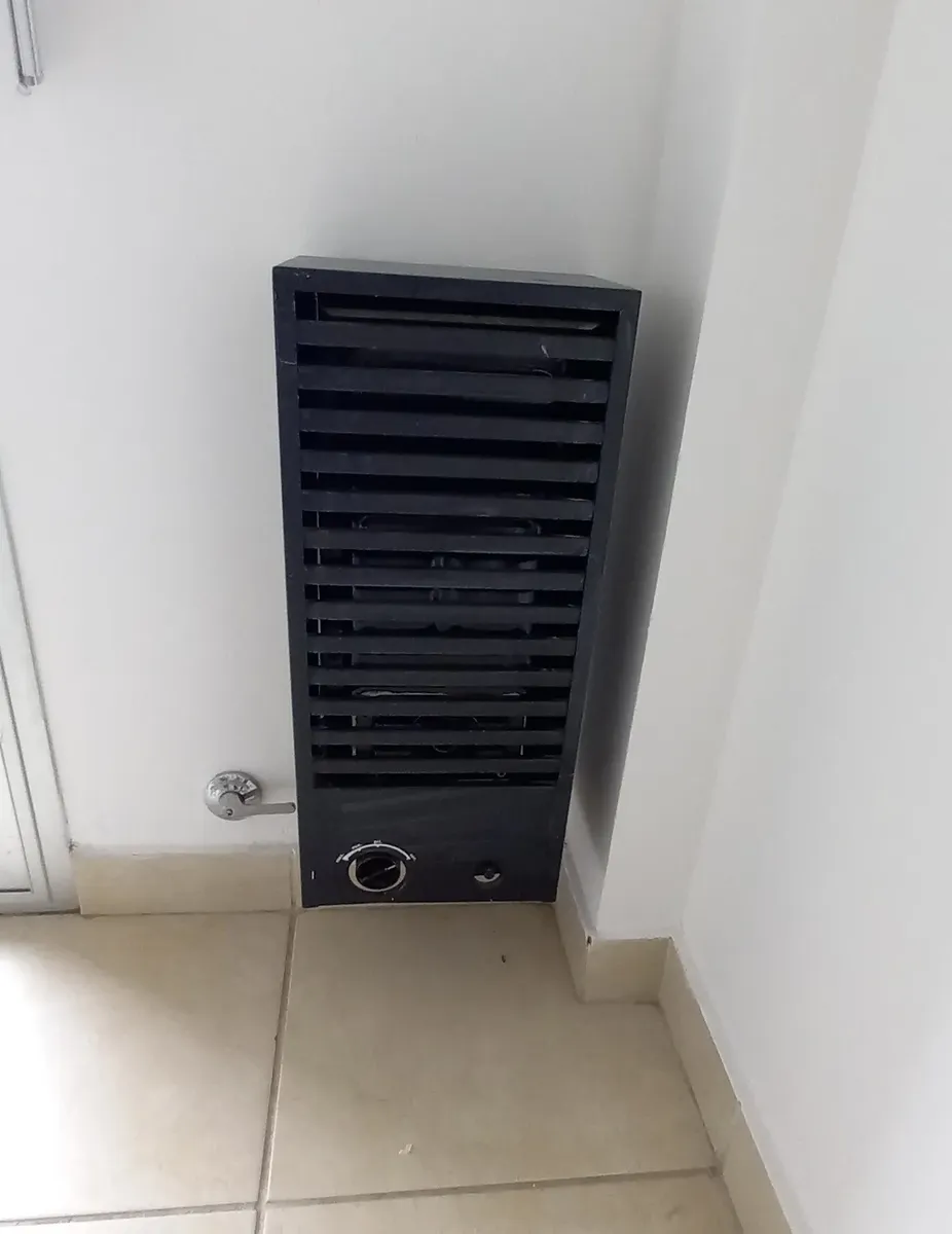 Studio apartment in Morón, courtyard-facing (contrafrente) with a balcony. It has a kitchenette with gas cooking appliances, an electric water heater (termotanque), a complete bathroom with a bathtub, and a wall-mounted balanced-flue heater. A continuous balcony includes a connection for a washing machine; there is access to a shared terrace for hanging laundry and grilling, plus an uncovered parking space. Up to 2 occupants, no pets.
