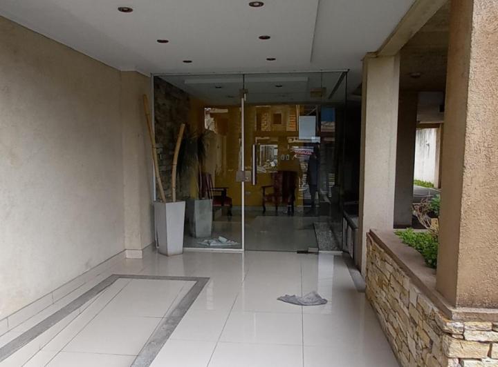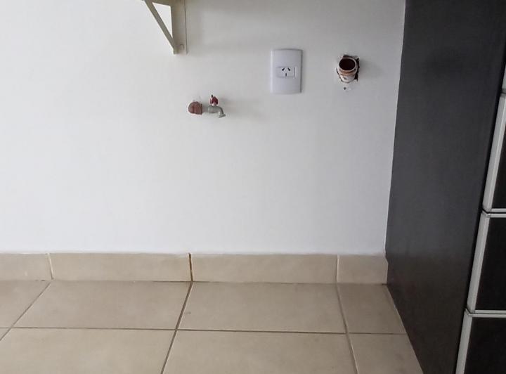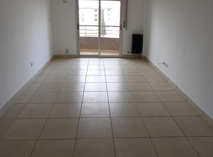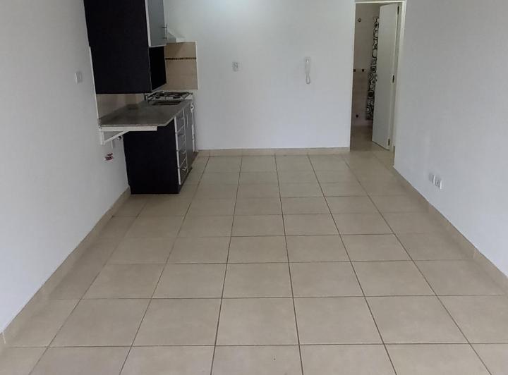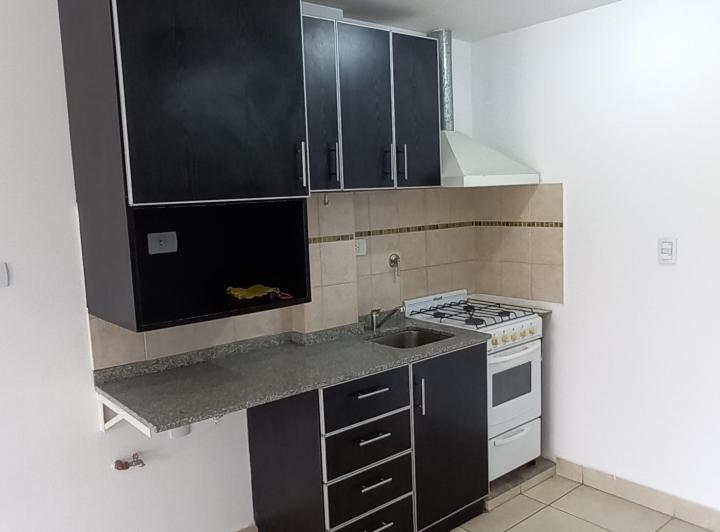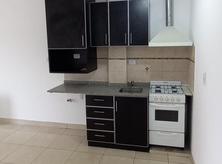 Studio apartment in Morón, courtyard-facing (contrafrente) on the upper floor with a continuous balcony. Unfurnished kitchen with complete fixtures, a gas cooker and an electric hot-water tank; a installed balanced-flue heater. Full bathroom with a bathtub, laundry connection for a washing machine, and shared roof terrace with space for hanging clothes and grills available; an assigned uncovered parking space. Maximum occupancy is 2 people, no pets.