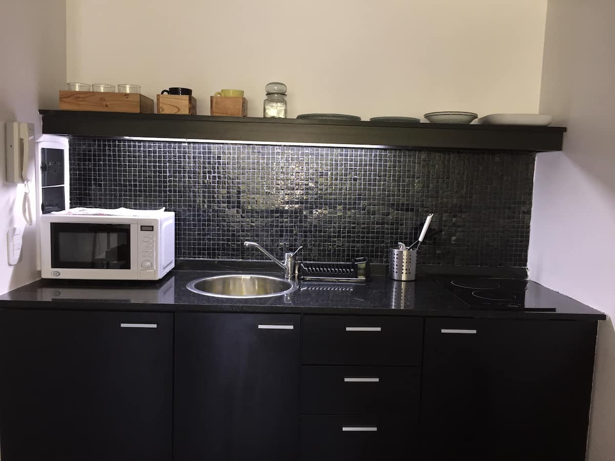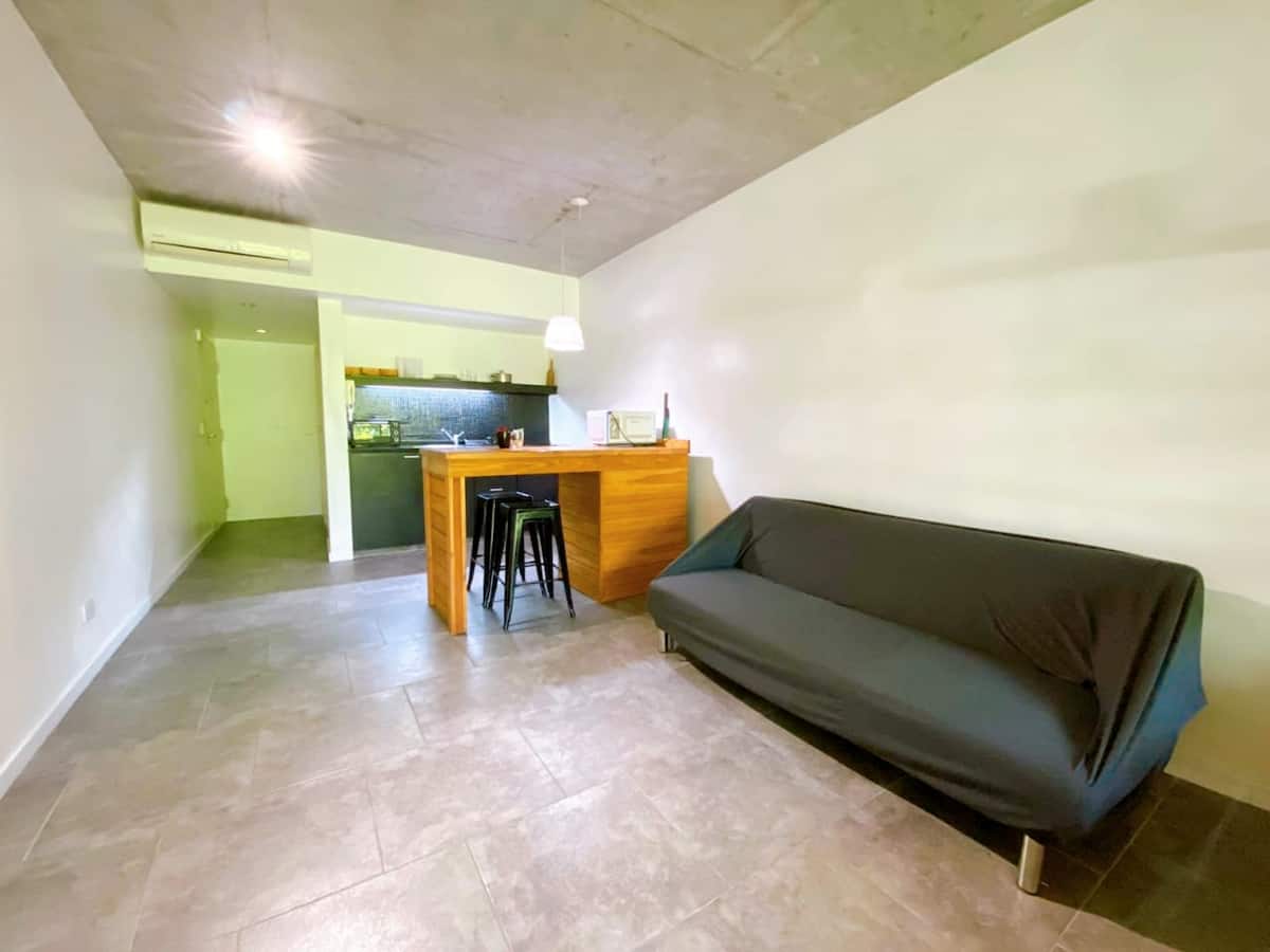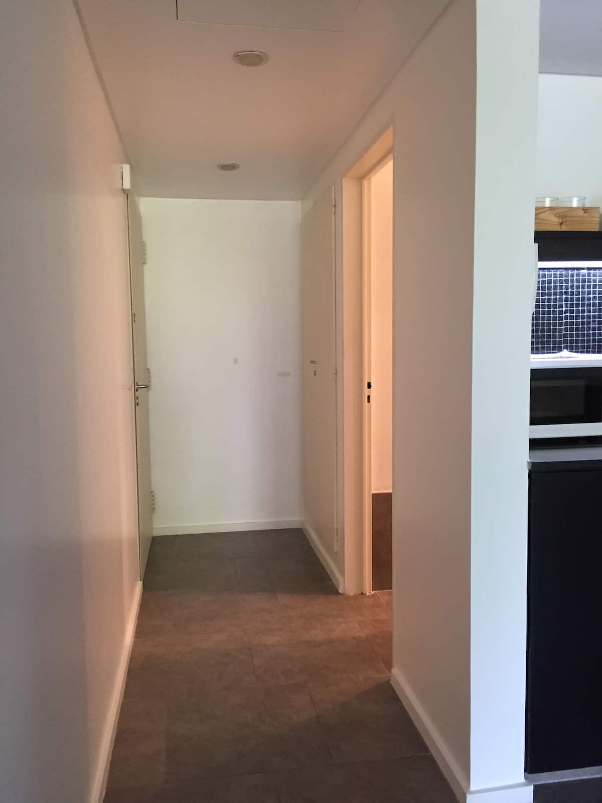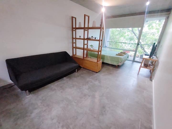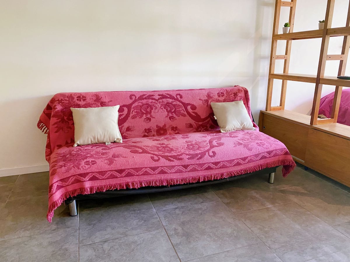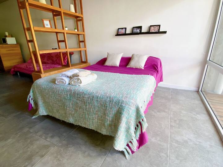 Large studio apartment for 2 or 3 people on the 2nd floor with a front balcony. Fully equipped with kitchen utensils, bedding, a kettle, electric oven, electric stovetop, and an under-counter refrigerator with freezer. Includes WiFi internet and cable TV.
