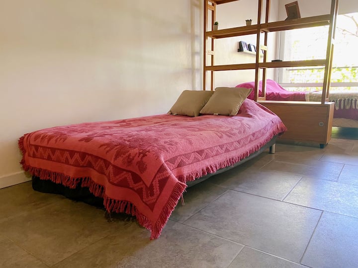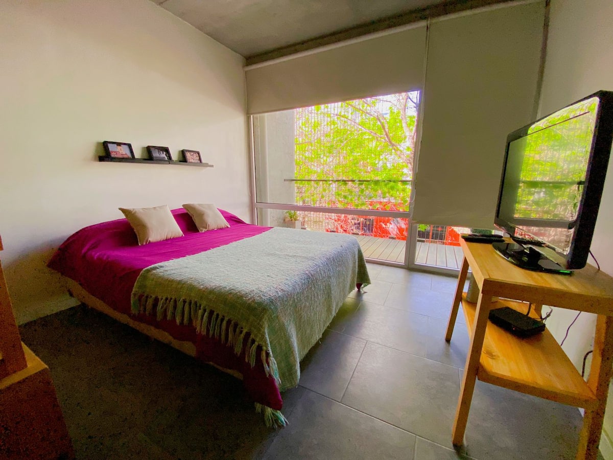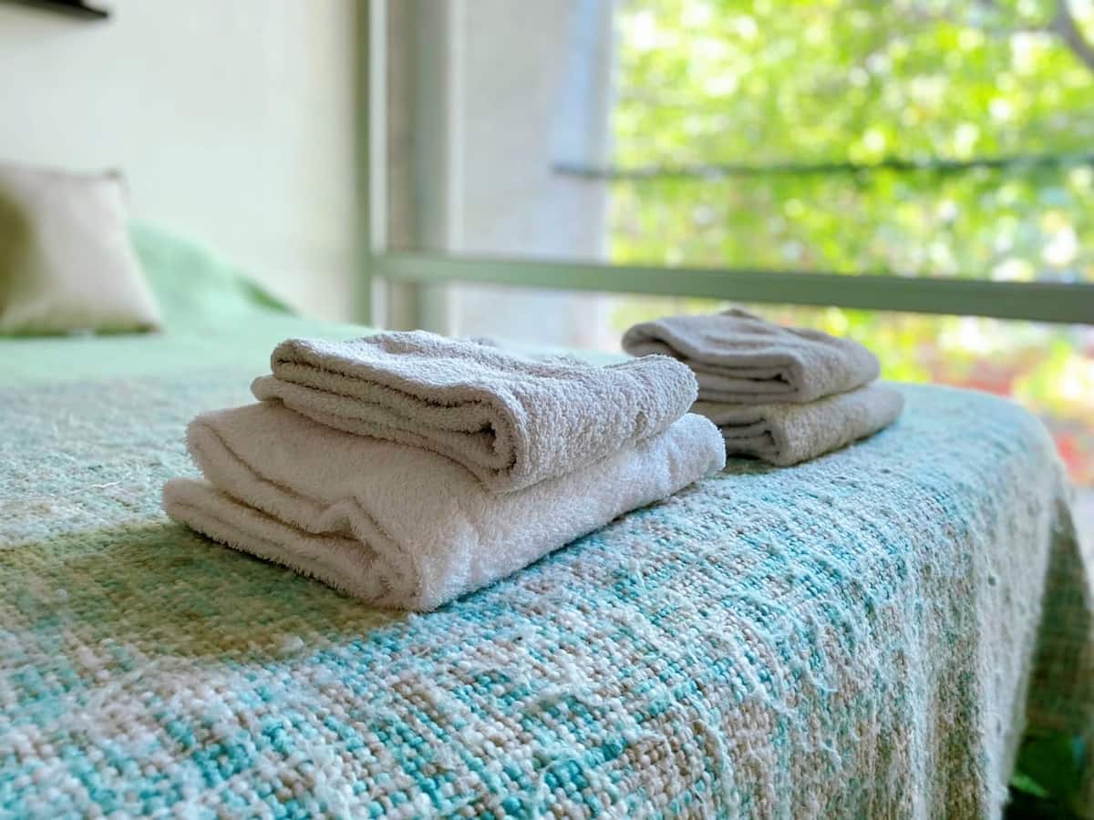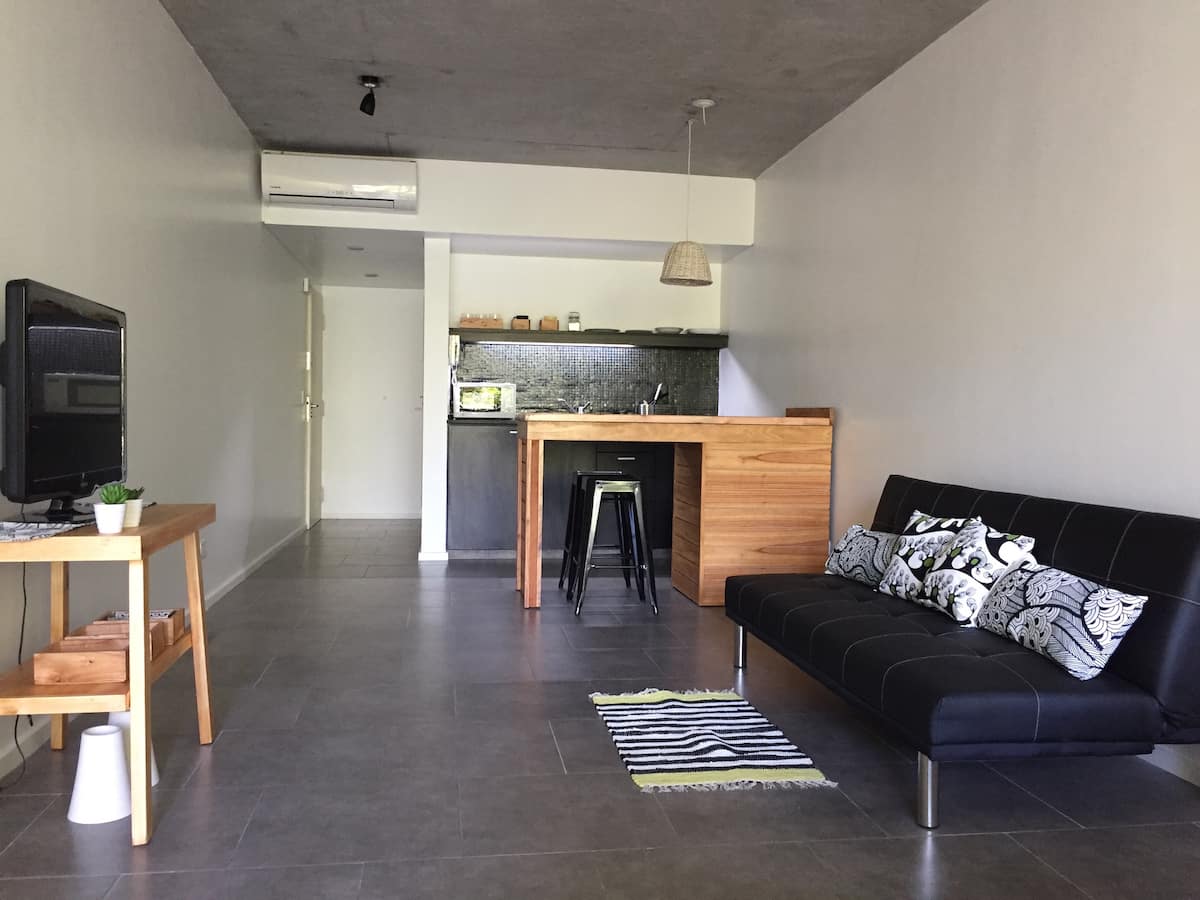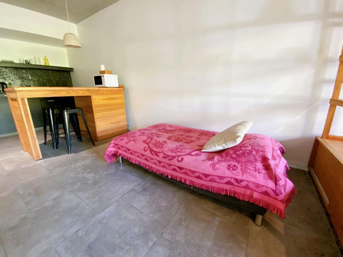 Large studio apartment for 2 or 3 people on the 2nd floor with a front balcony. Fully equipped with kitchen utensils, bedding, a kettle, electric oven, electric stovetop, and an under-counter refrigerator with freezer. Includes WiFi internet and cable TV.