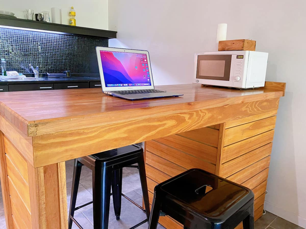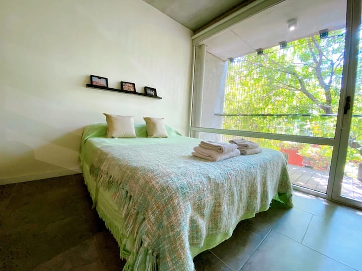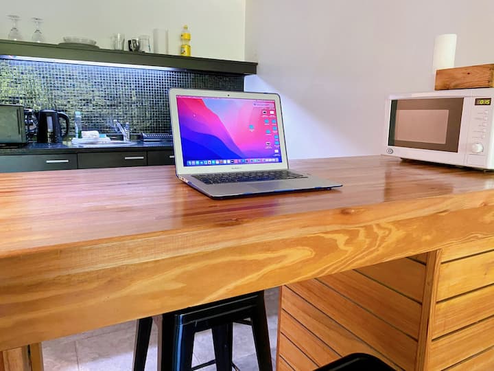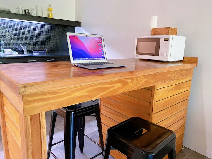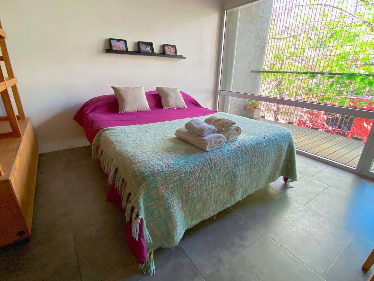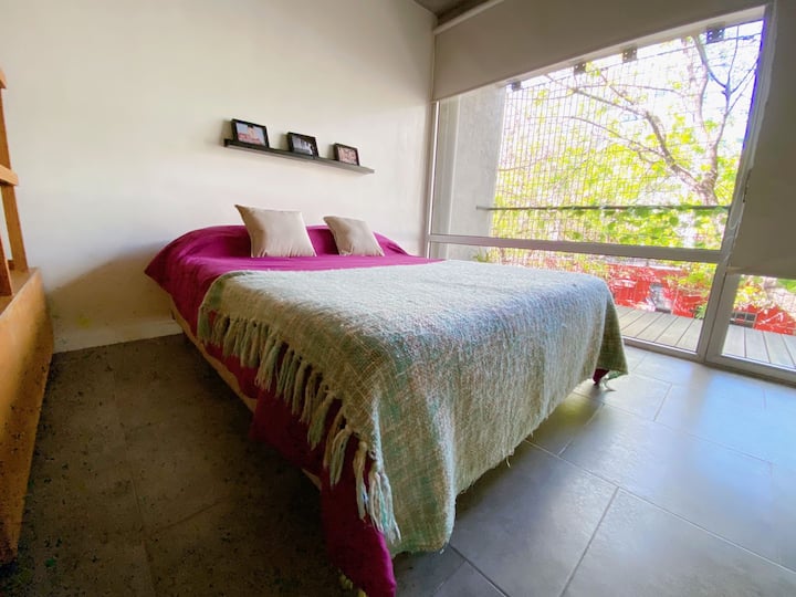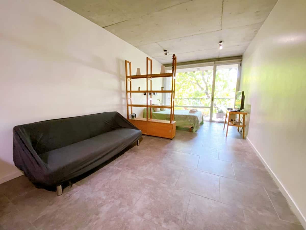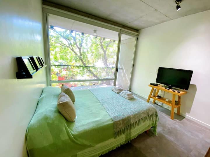 Large studio apartment for 2 or 3 people on the 2nd floor with a front balcony. Fully equipped with kitchen utensils, bedding, a kettle, electric oven, electric stovetop, and an under-counter refrigerator with freezer. Includes WiFi internet and cable TV.