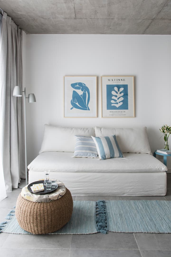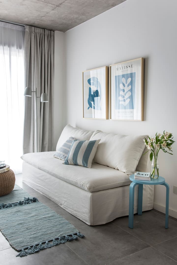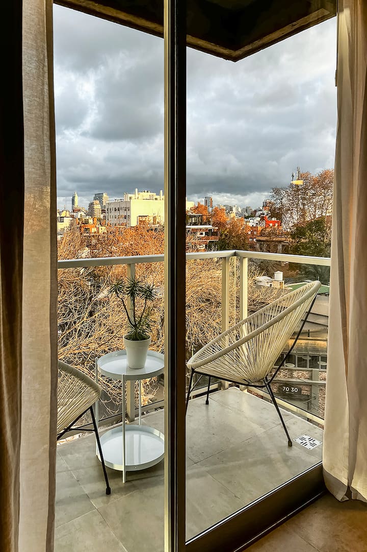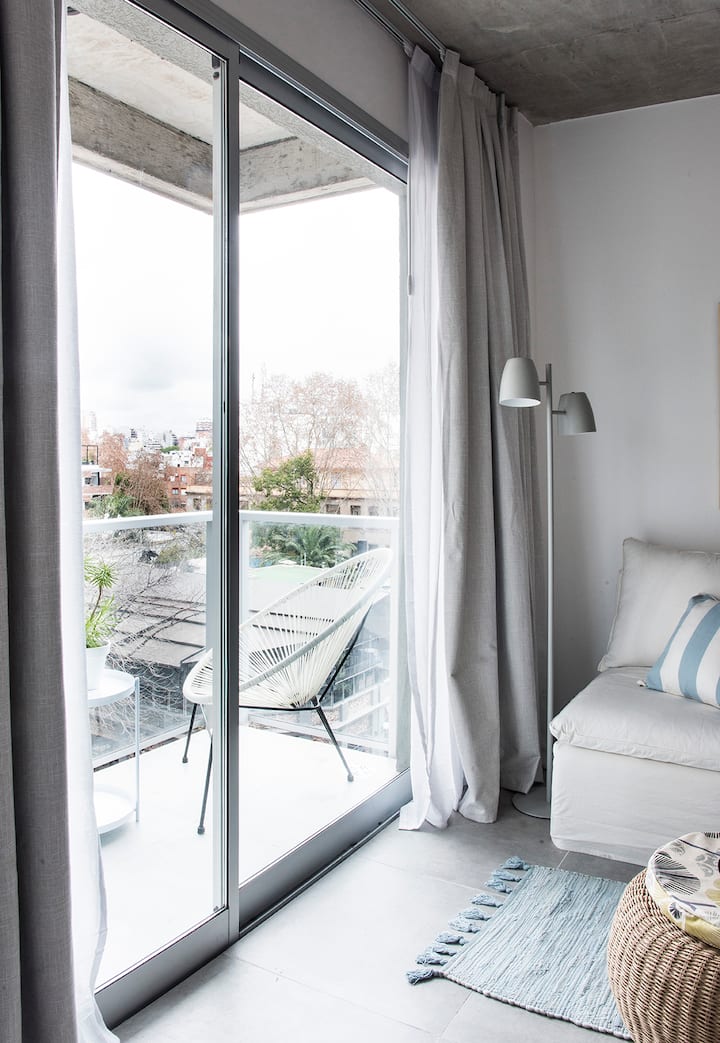 Furnished and equipped studio apartment in Núñez, with a balcony. Designed by Ricardo and Ana. The listing mentions Wi-Fi and access to bars, restaurants and shops near Av. Del Libertador, with a train station about 300 metres away.