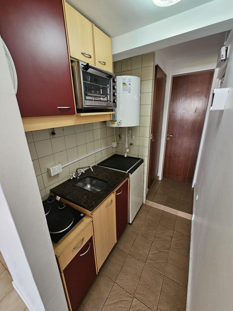 Studio apartment on the 3rd floor, street-facing, with an entry hall and a bright living area opening to a 4 m² balcony. The kitchen has upper cabinets, a two-burner electric cooktop, a minibar fridge and an electric oven. Refurbished bathroom with a standing shower. Total area 27 m² (23 m² covered). Building fees are ARS 100,000 and include caysa; ABL is approximately ARS 13,000. Suitable for professional use; rental contract is for 2 years with quarterly adjustments based on IPC. Requires a pr