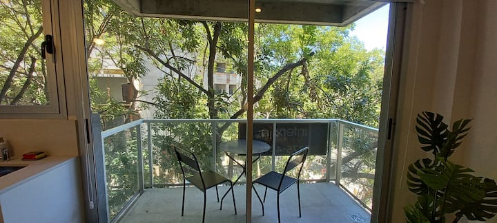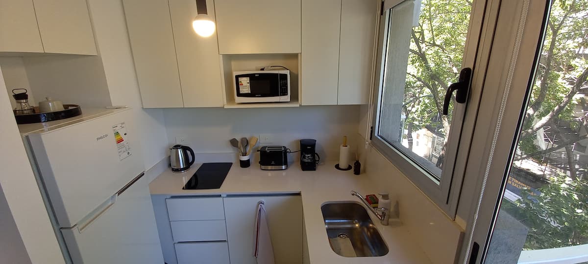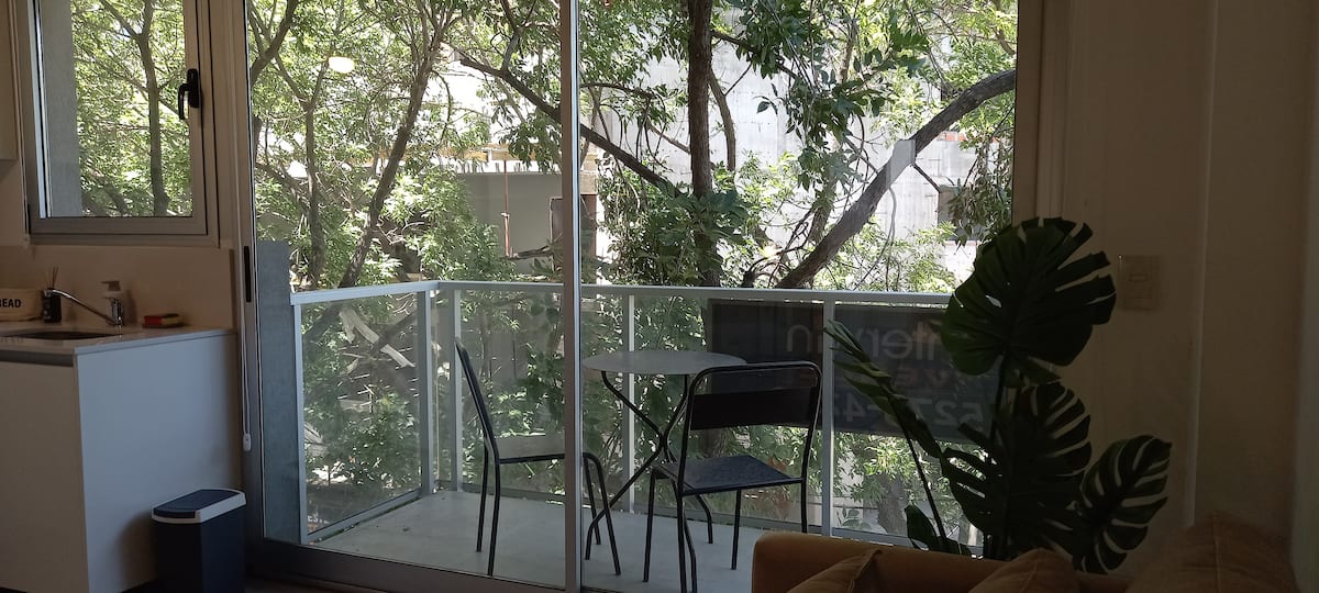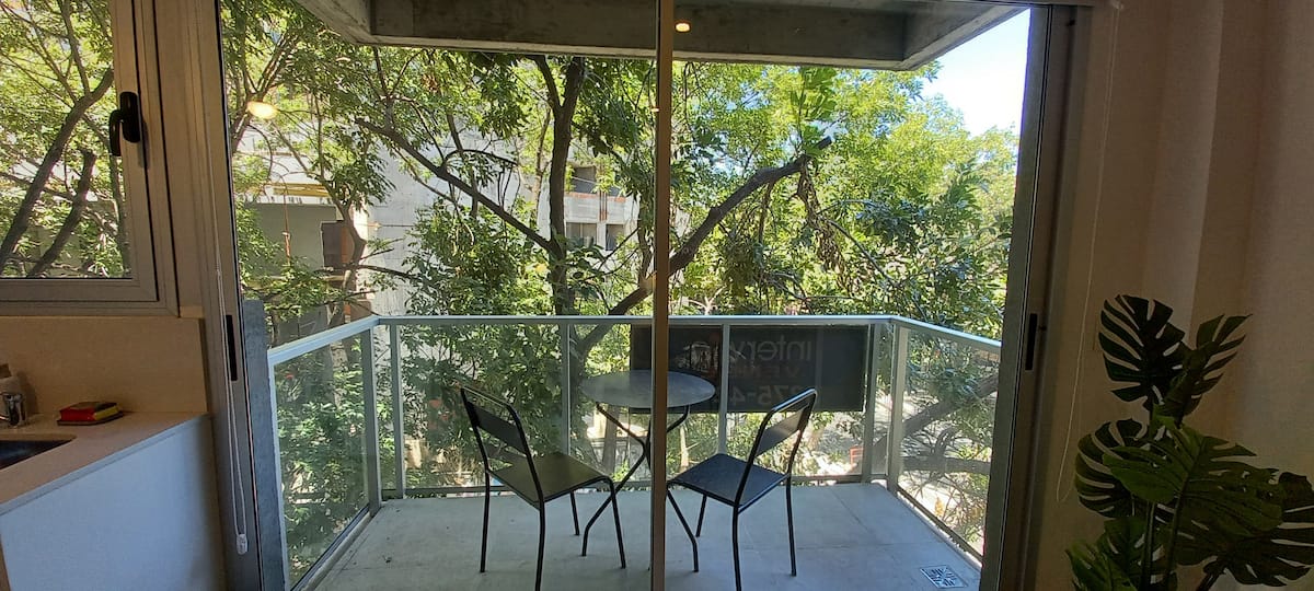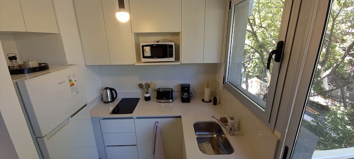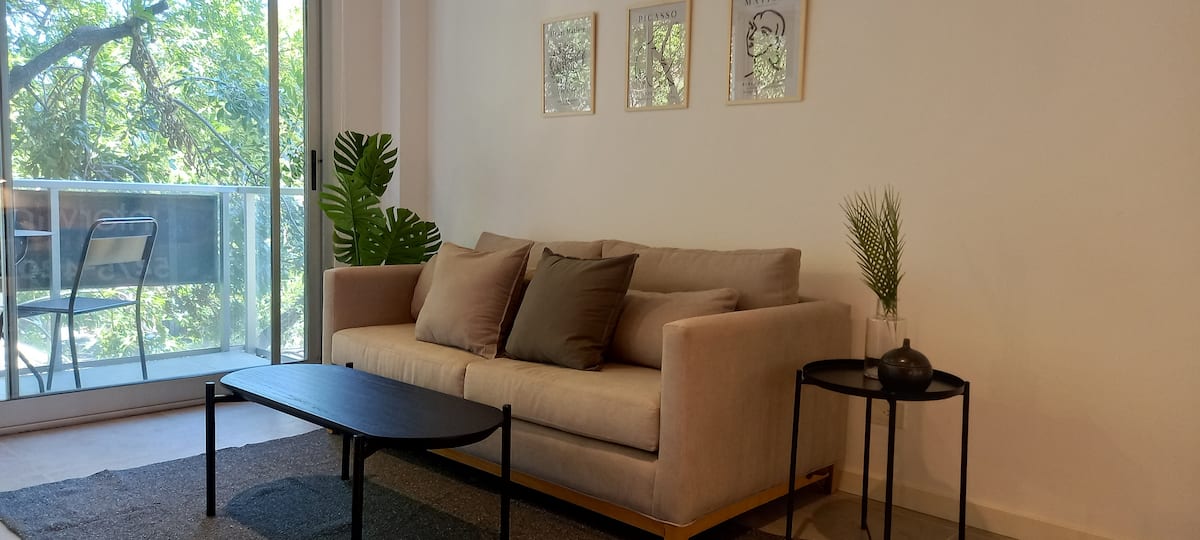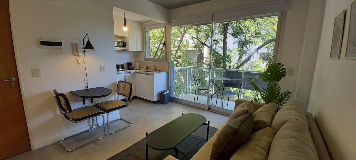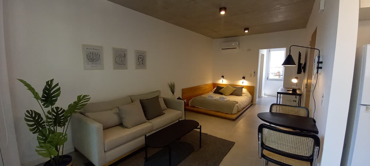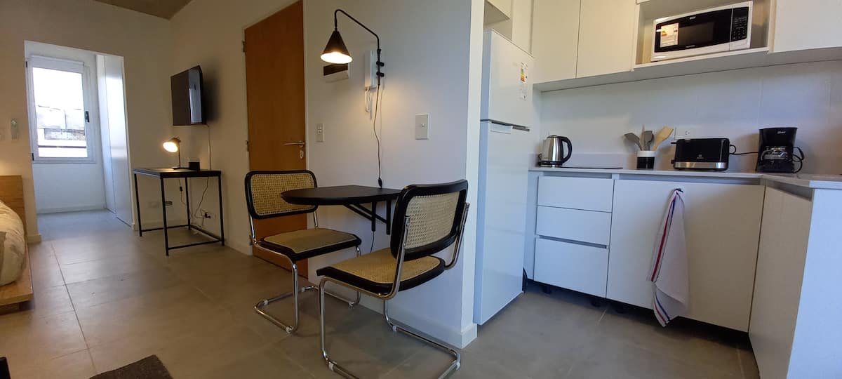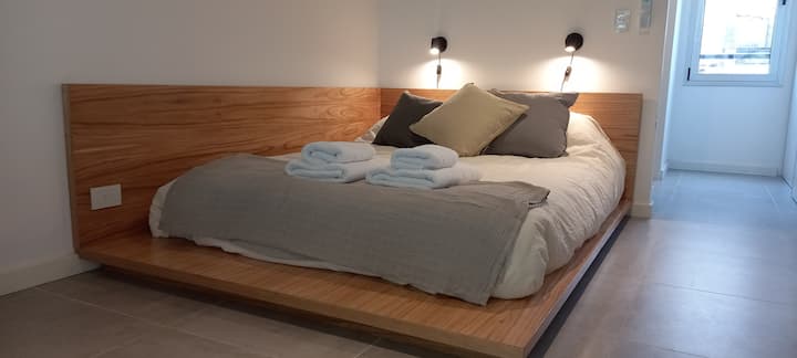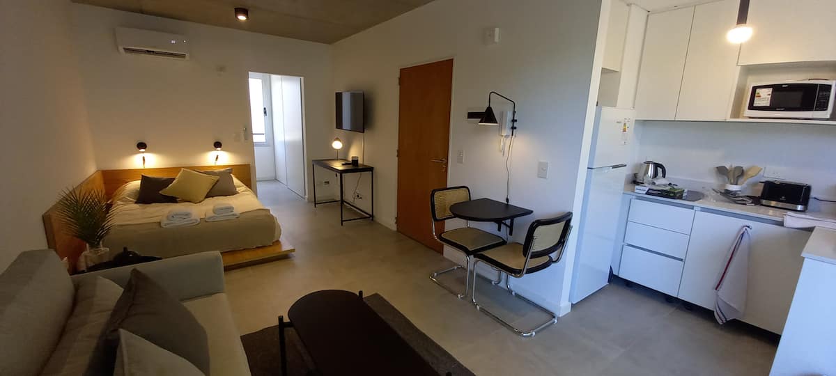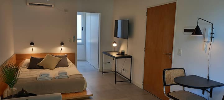Studio apartment in Núñez with a balcony. Equipped with a queen-size bed (1.60 m x 2 m) on a wooden platform at floor level, double-door wardrobe, desk workspace, smart TV, dining table for 2, and a 2-seat sofa. Kitchen includes a fridge with freezer, microwave, 2 electric hotplates, kettle, toaster, and coffee maker, plus dinnerware and utensils; bathroom has a bidet, toilet and shower. Air conditioning (heating and cooling), WiFi and blackout curtains are included. The apartment is 120 metres