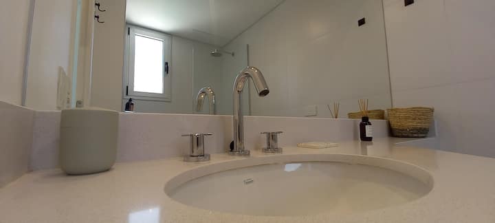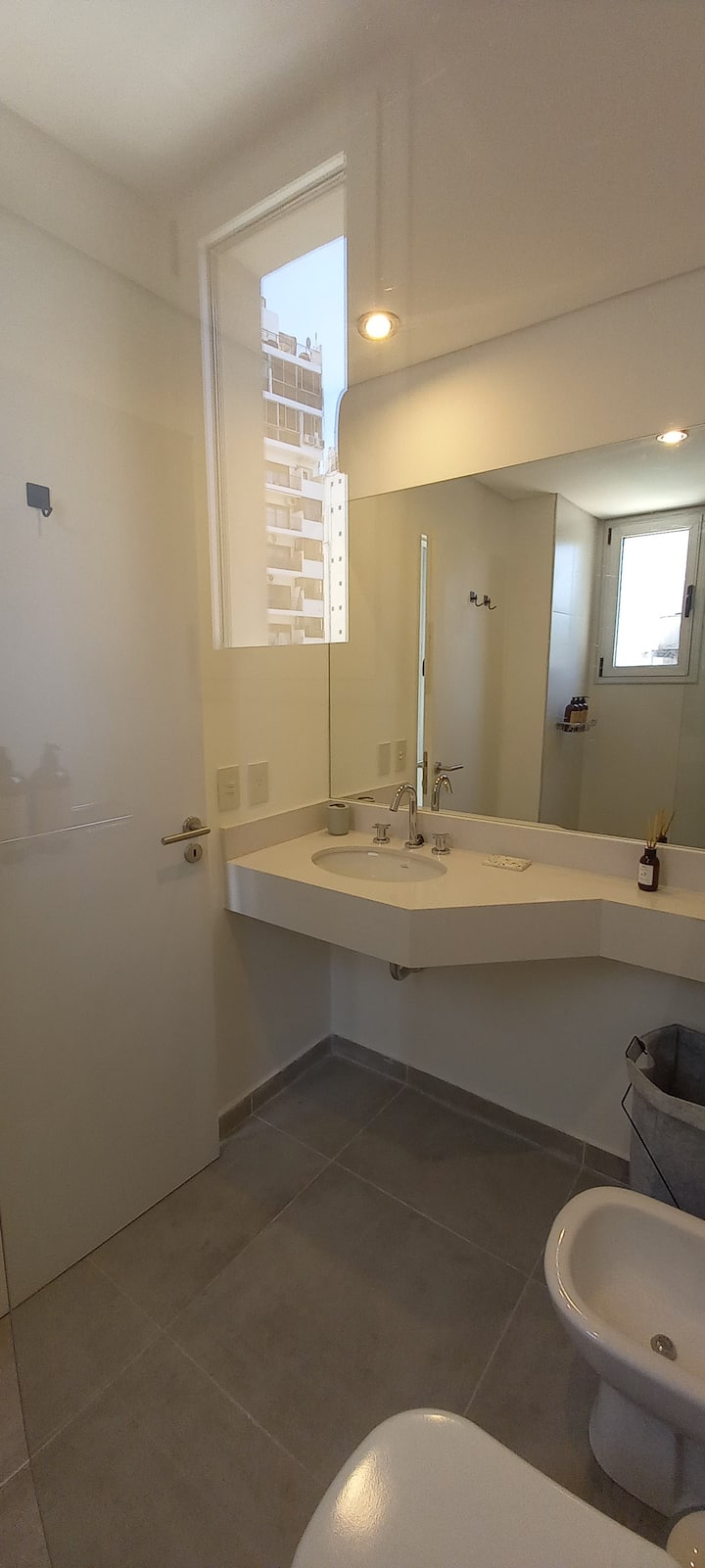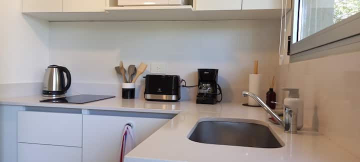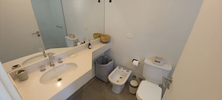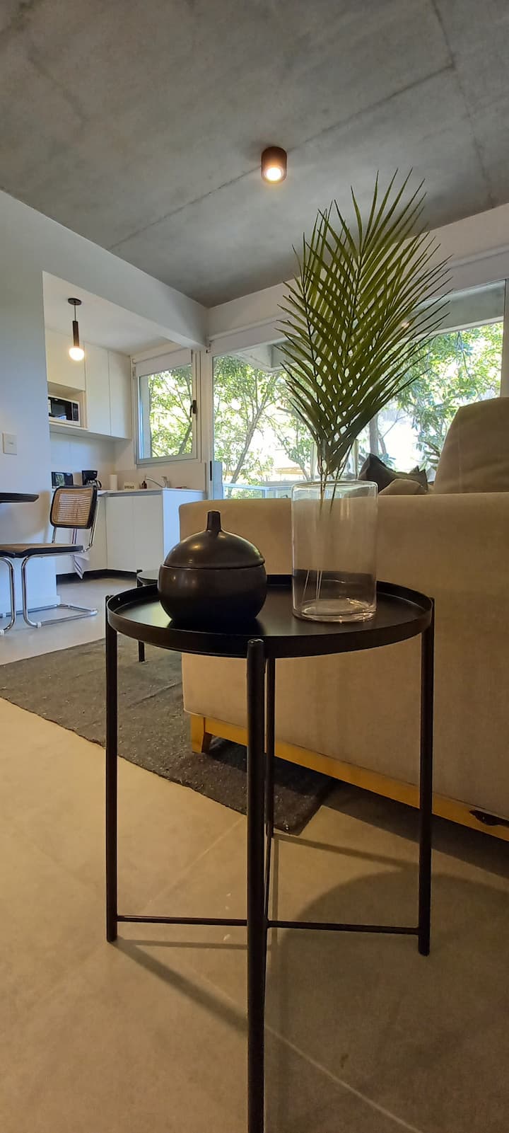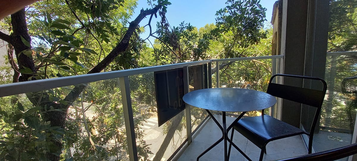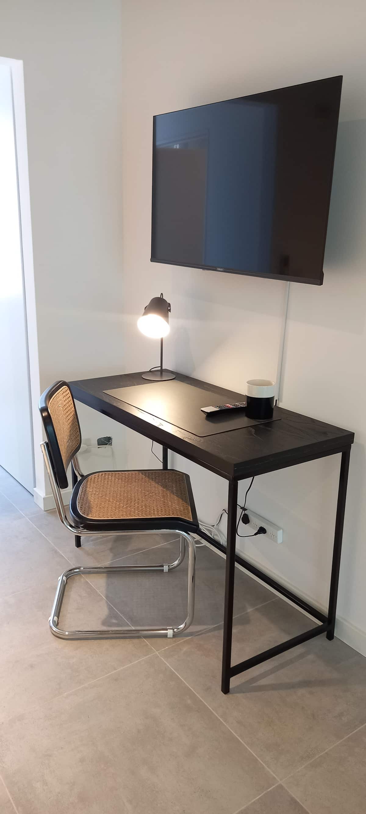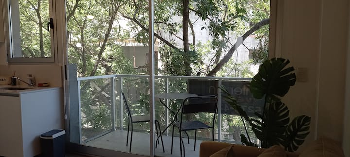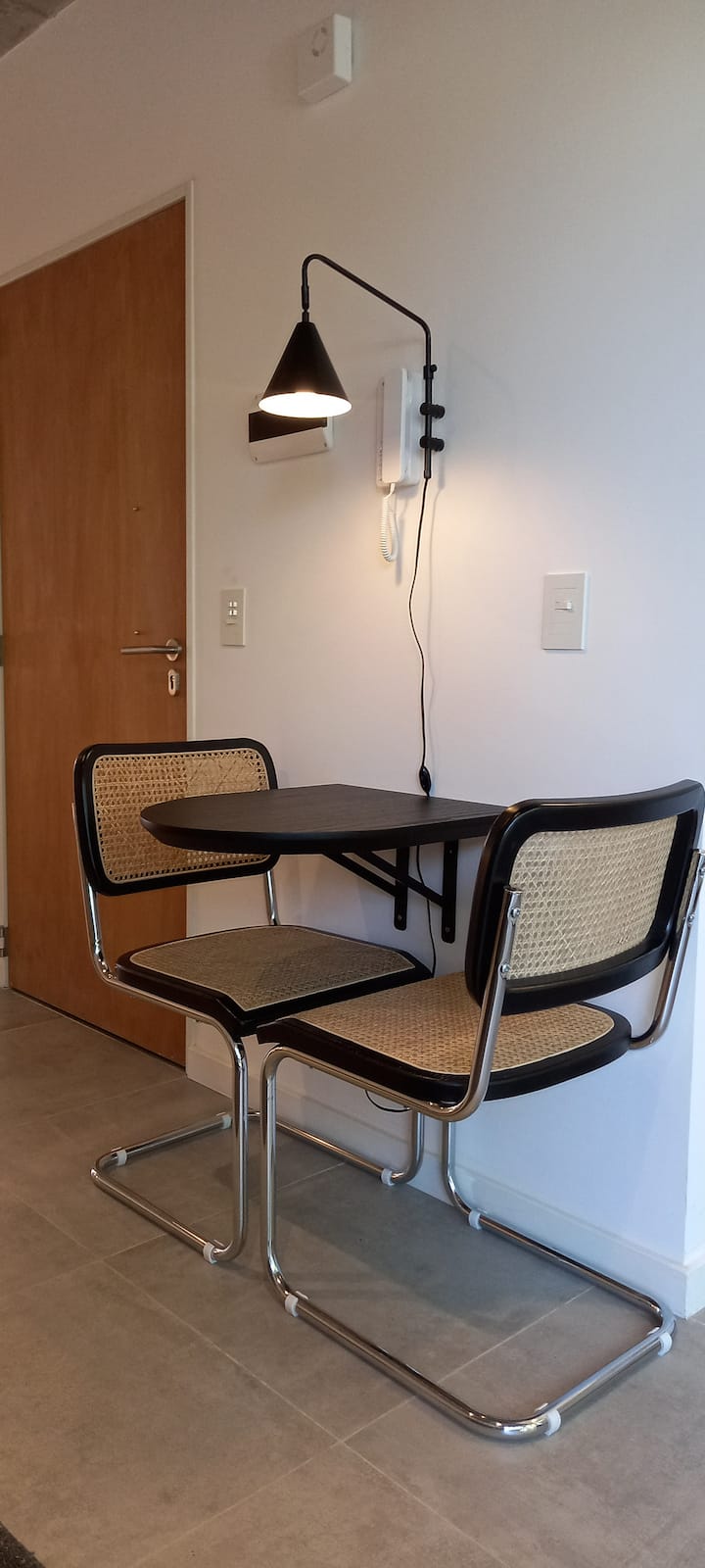 Studio apartment in Núñez with a balcony. Equipped with a queen-size bed (1.60 m x 2 m) on a wooden platform at floor level, double-door wardrobe, desk workspace, smart TV, dining table for 2, and a 2-seat sofa. Kitchen includes a fridge with freezer, microwave, 2 electric hotplates, kettle, toaster, and coffee maker, plus dinnerware and utensils; bathroom has a bidet, toilet and shower. Air conditioning (heating and cooling), WiFi and blackout curtains are included. The apartment is 120 metres