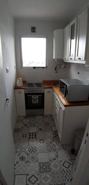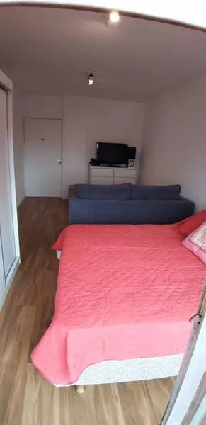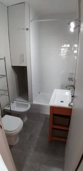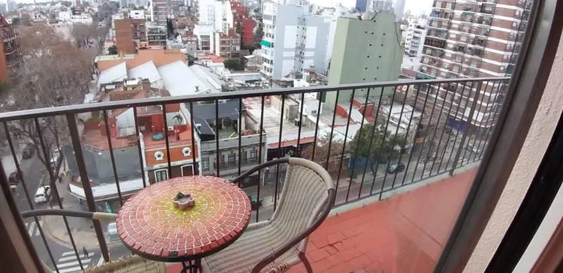 Furnished studio apartment on the 9th floor, street-facing in Núñez, with a balcony. It has an independent kitchen, a bathroom with shower, and an electric hot-water tank (individual). The unit includes electric cooking and heating/cooling air conditioning (hot and cold), a sliding closet, and a kitchen window for ventilation.