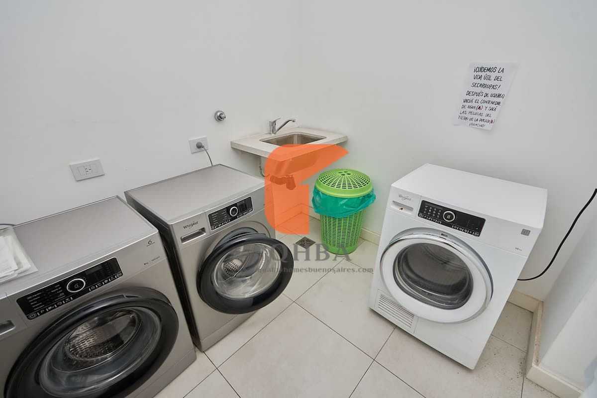 Modern studio on the border of Belgrano and Núñez, furnished for short and long stays. The building has common laundry facilities. Interior features include a small desk area, Nespresso machine, toaster, and air conditioning. The listing states there is no gym on site, with discounts potentially available with a gym in front of the building.