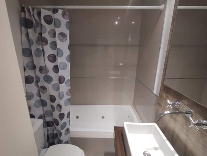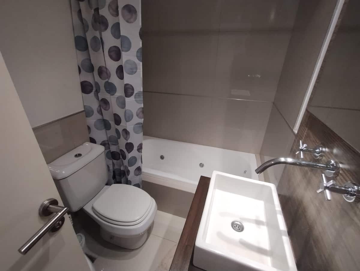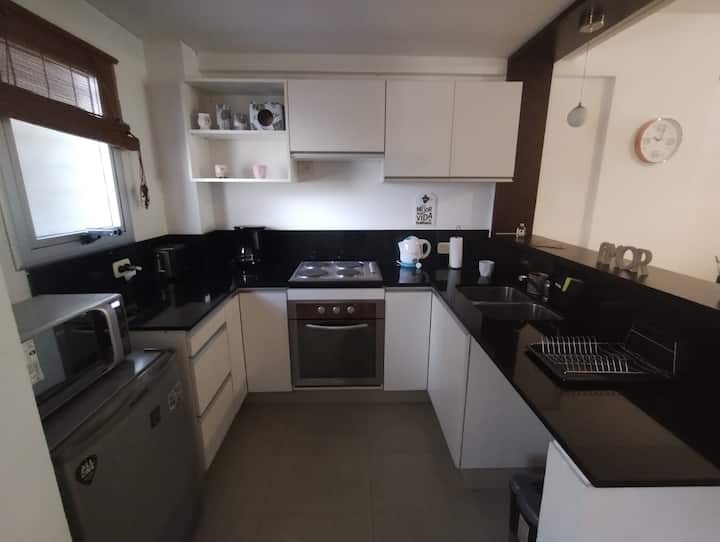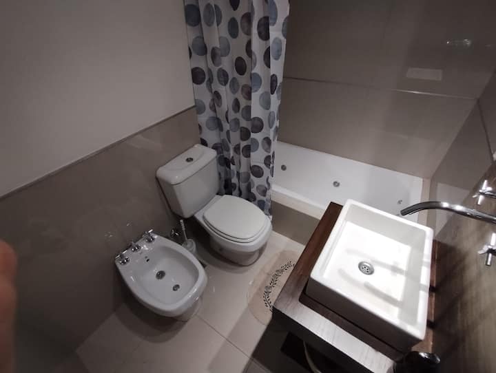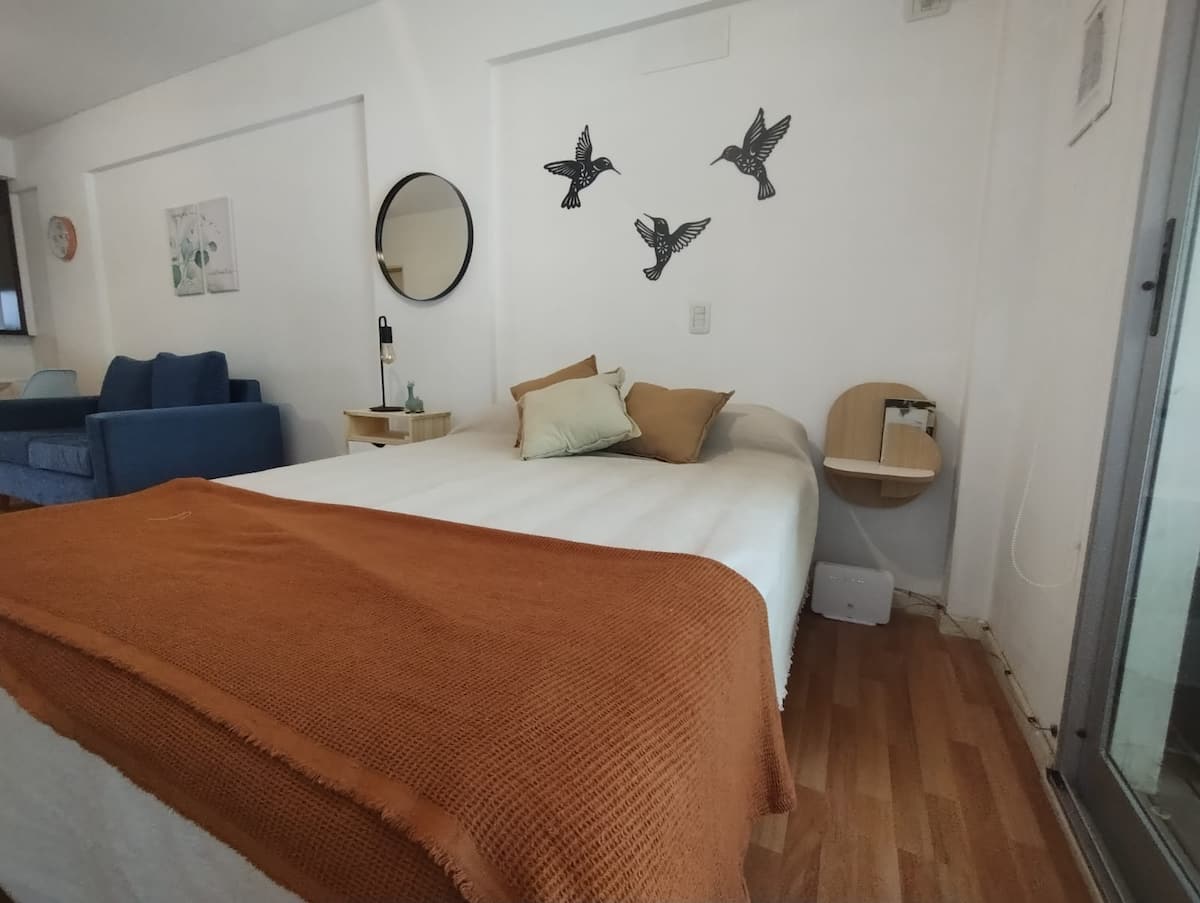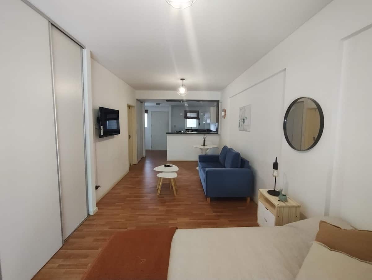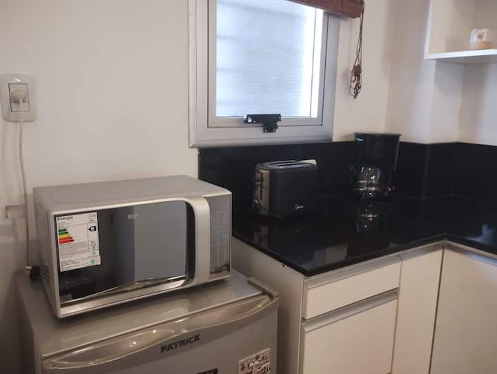 Modern studio apartment with a balcony in Núñez. The unit includes a kitchen with a refrigerator, stove, microwave, toaster, coffee maker and electric kettle, and a living/bedroom area with two large closets, a double bed, an armchair and a 43-inch smart TV. The bathroom has a bathtub with jacuzzi, and the balcony is screened and has a grill. Two blocks from Av. Cabildo, 10 blocks from Congreso de Tucumán (Subte Línea D station) and 5 blocks from Núñez station (Mitre Train), near Dot Baires Shop