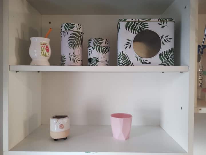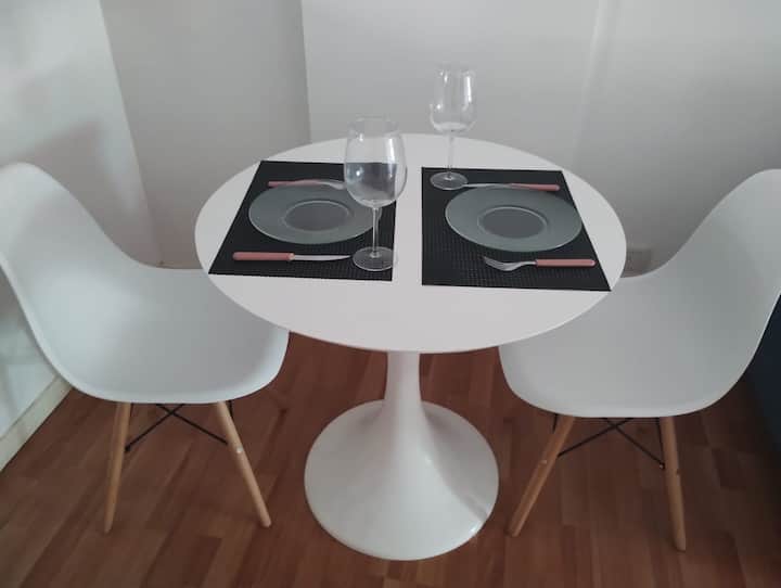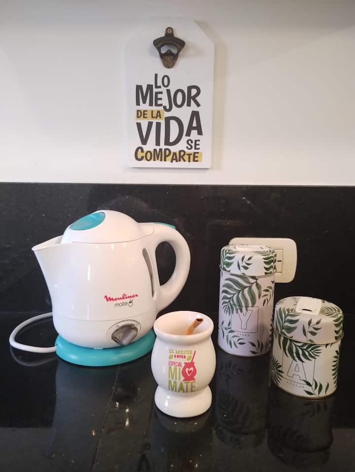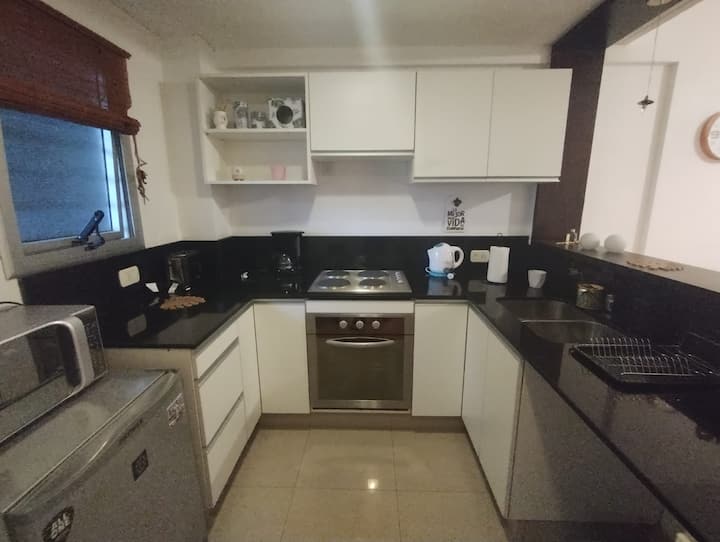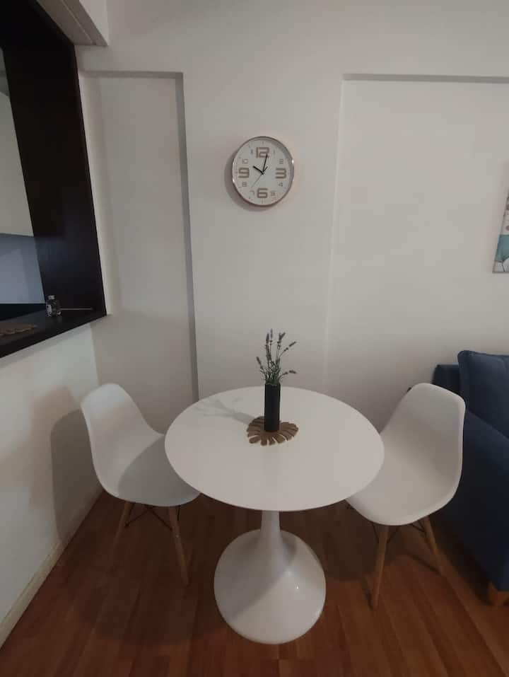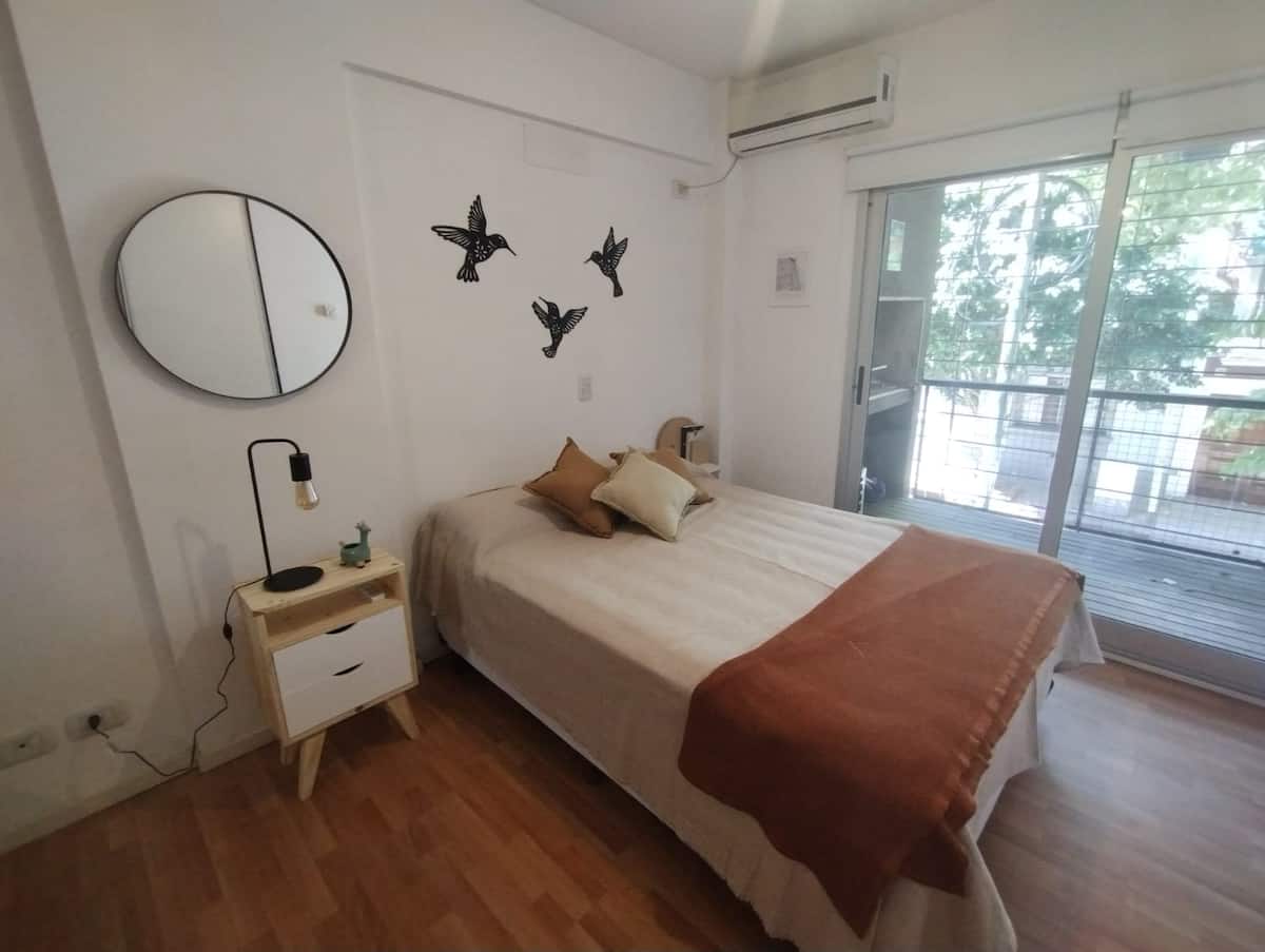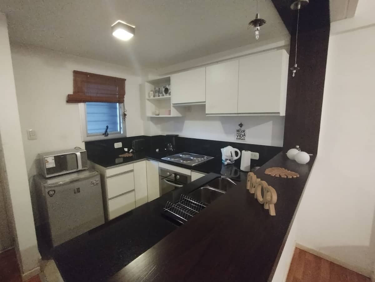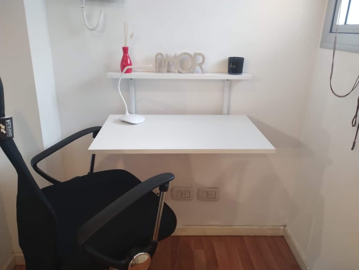 Modern studio apartment with a balcony in Núñez. The unit includes a kitchen with a refrigerator, stove, microwave, toaster, coffee maker and electric kettle, and a living/bedroom area with two large closets, a double bed, an armchair and a 43-inch smart TV. The bathroom has a bathtub with jacuzzi, and the balcony is screened and has a grill. Two blocks from Av. Cabildo, 10 blocks from Congreso de Tucumán (Subte Línea D station) and 5 blocks from Núñez station (Mitre Train), near Dot Baires Shop