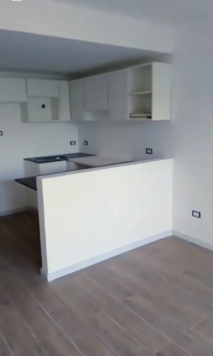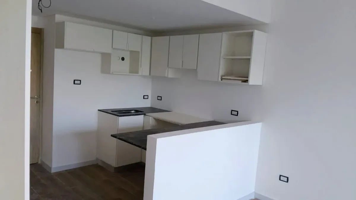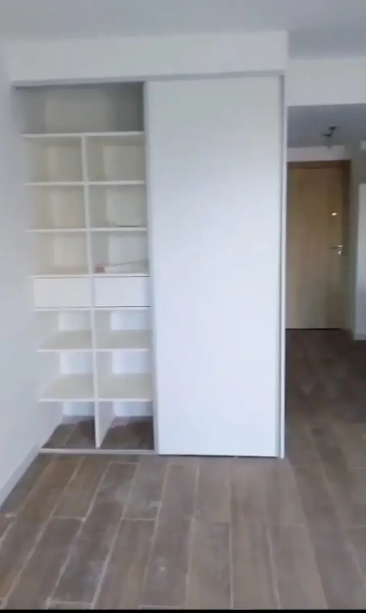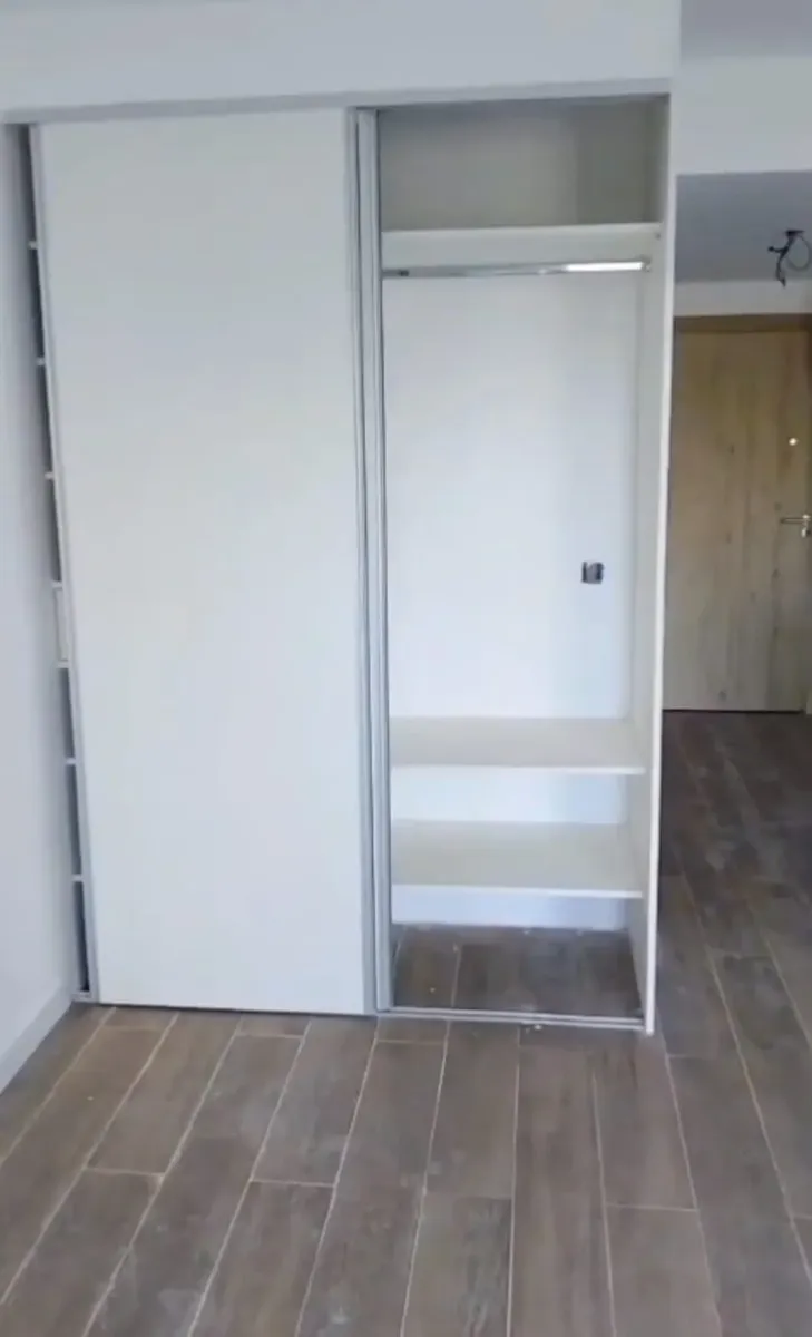 New studio apartment with a combined living-dining area and an integrated kitchen. The main room has floor-to-ceiling windows for access to the outside and natural light. The kitchen includes upper and lower storage units, a countertop, space for appliances, and a breakfast bar. The bathroom has a bathtub, bidet, vanity with storage, and a toilet; built-in wardrobe with sliding doors and internal shelving. Floors are finished with wood-look flooring throughout.