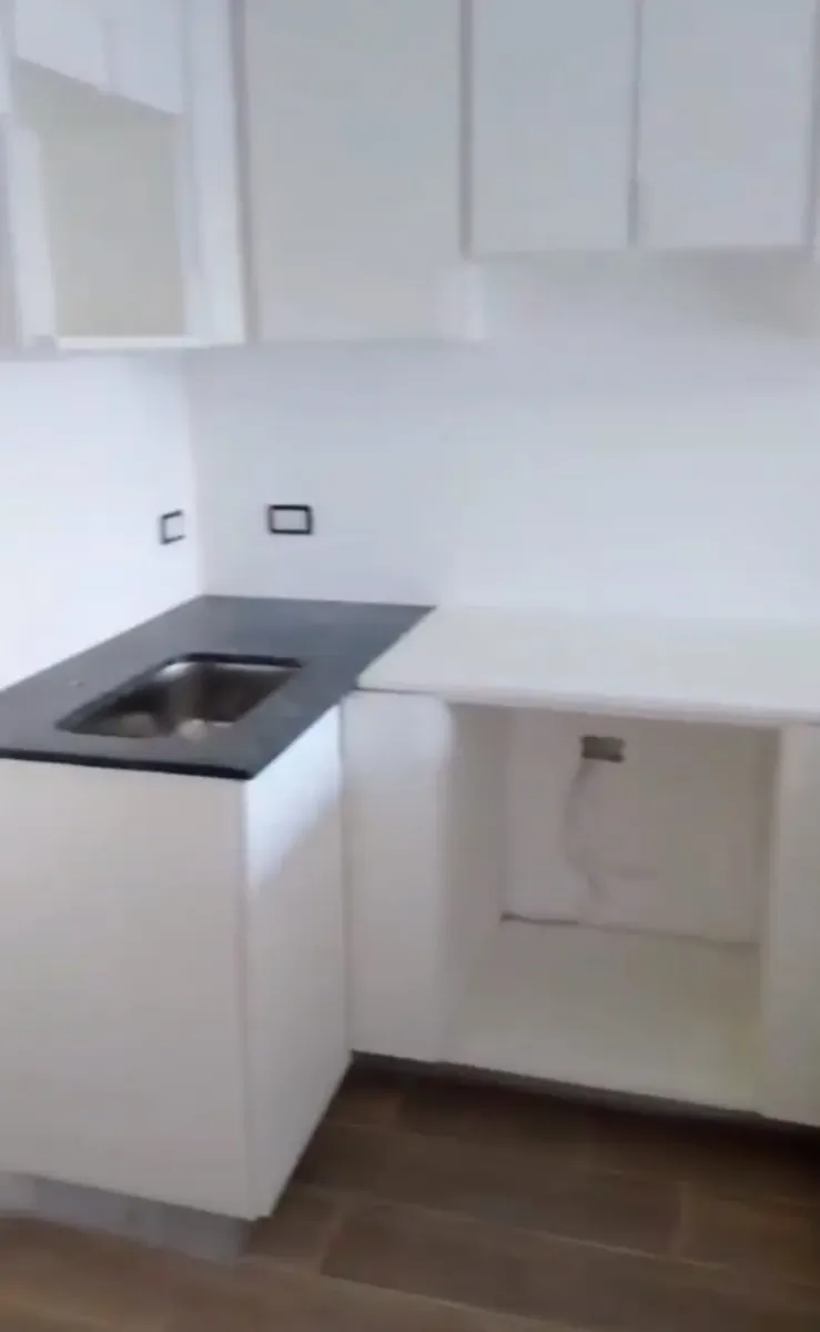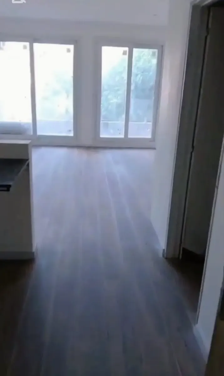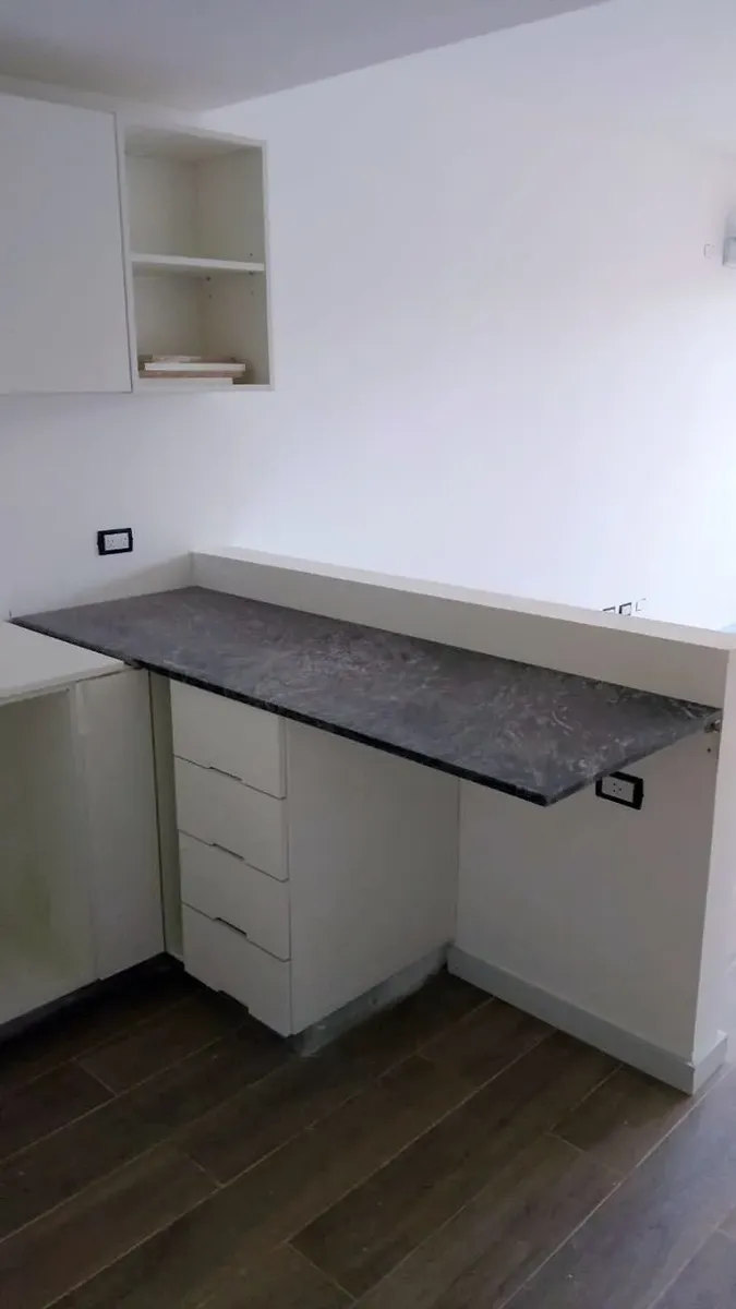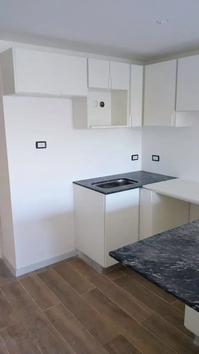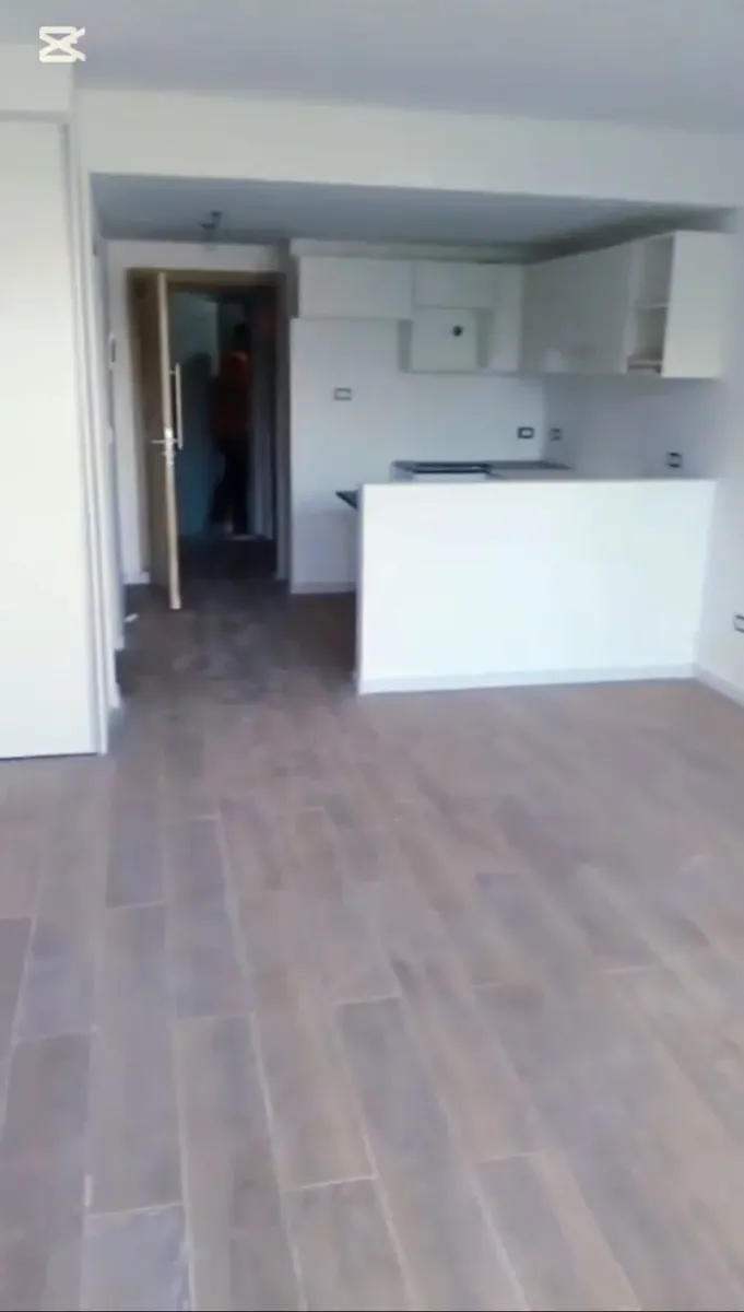New studio apartment with a combined living-dining area and an integrated kitchen. The main room has floor-to-ceiling windows for access to the outside and natural light. The kitchen includes upper and lower storage units, a countertop, space for appliances, and a breakfast bar. The bathroom has a bathtub, bidet, vanity with storage, and a toilet; built-in wardrobe with sliding doors and internal shelving. Floors are finished with wood-look flooring throughout.