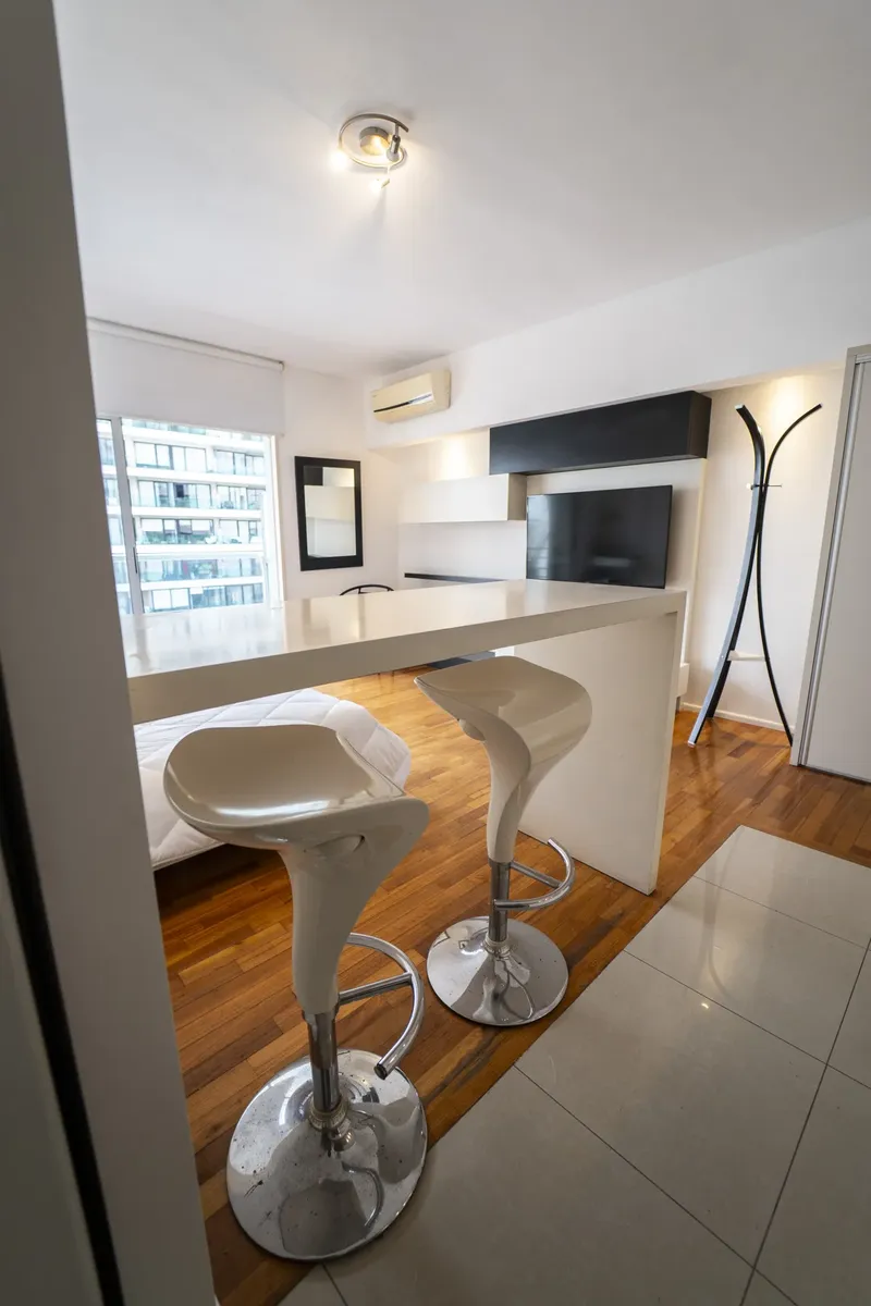 Temporary studio apartment with 34.06 m² covered and 2.36 m² semi-covered on the 5th floor, courtyard-facing (contrafrente). Furnished and fully equipped, with a balcony and capacity for 1 person. Building amenities include a pool, SUM and laundry; building fees are included in the rent. Not suitable for pets. Rent is USD 670 plus charges.