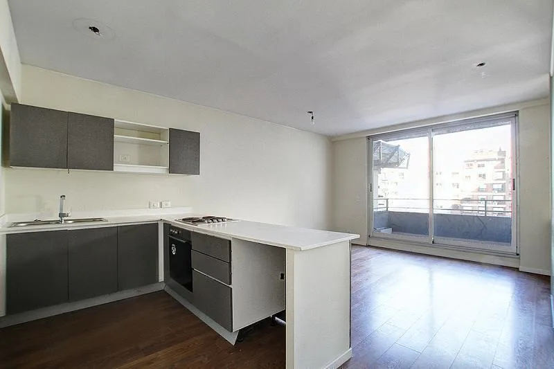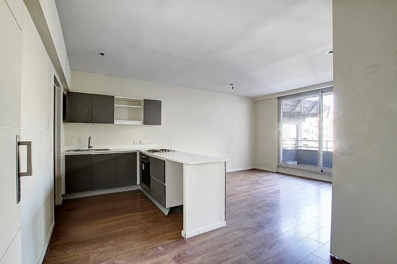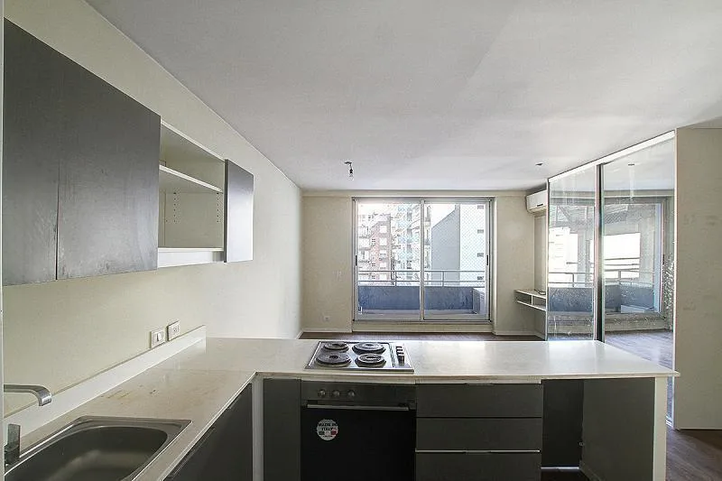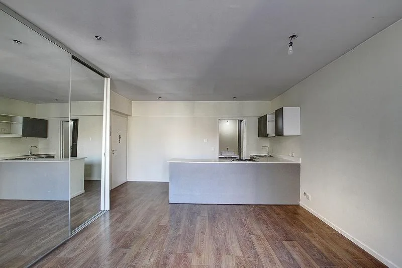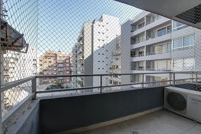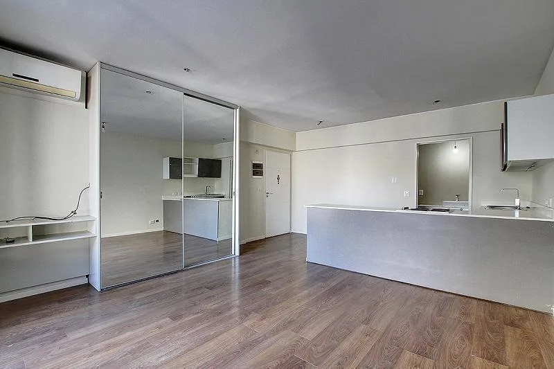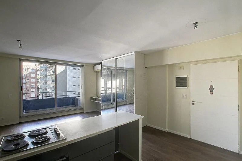 Studio apartment for rent in a tower, 38 m². Integrated kitchen, large built-in wardrobe, and a balcony with open views over the pool. The building, 15 years old, has a pool with solarium, communal room (SUM), laundry facilities and security. Rent includes a quarterly adjustment based on demonstrated income, with a capital guarantee or rental insurance bond (caución).