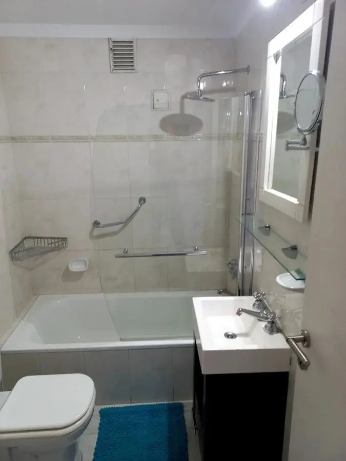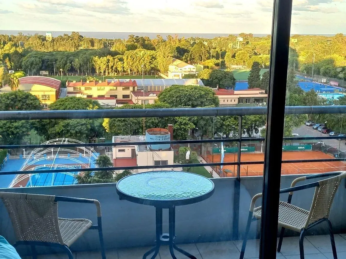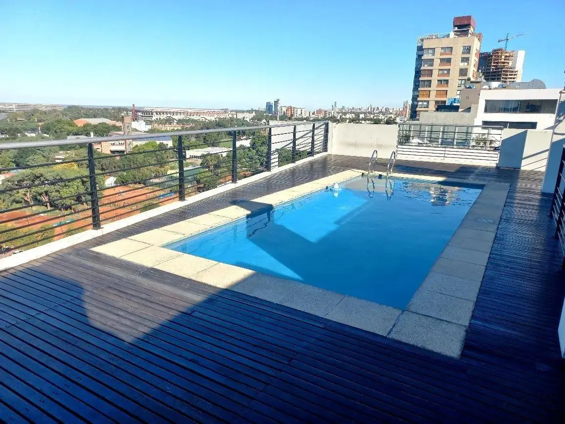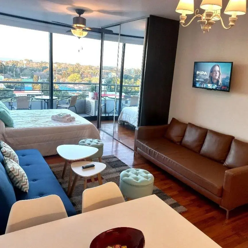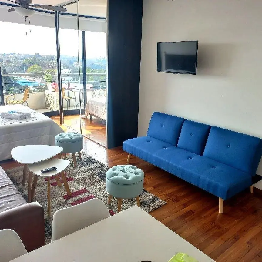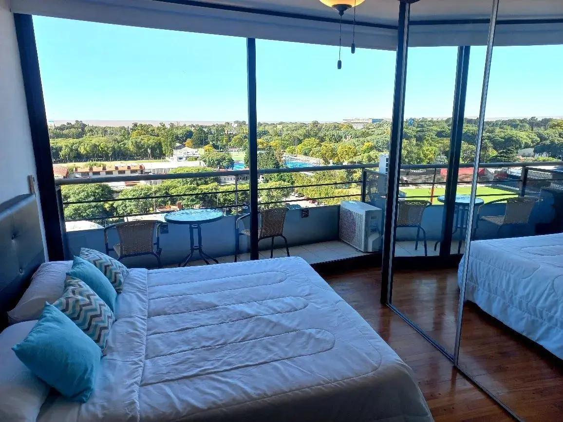Studio apartment in Núñez with a balcony and panoramic views towards the Río de la Plata. The unit is fully equipped, with double bed, seating and dining set, Smart TV, mirrored wardrobe fronts and hot-and-cold split air conditioning. The kitchen is integrated and includes a fridge with freezer, electric oven, two-burner cooktop, electric kettle and toaster, as well as complete tableware; the bathroom has a bathtub. The building has a pool with a solarium. Rental rate applies to stays longer tha