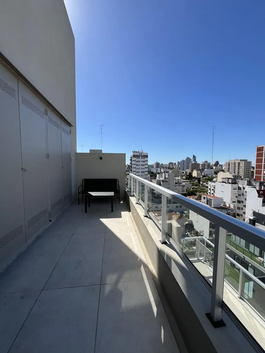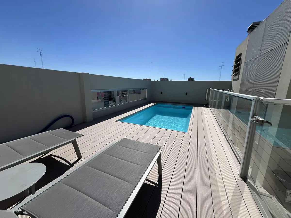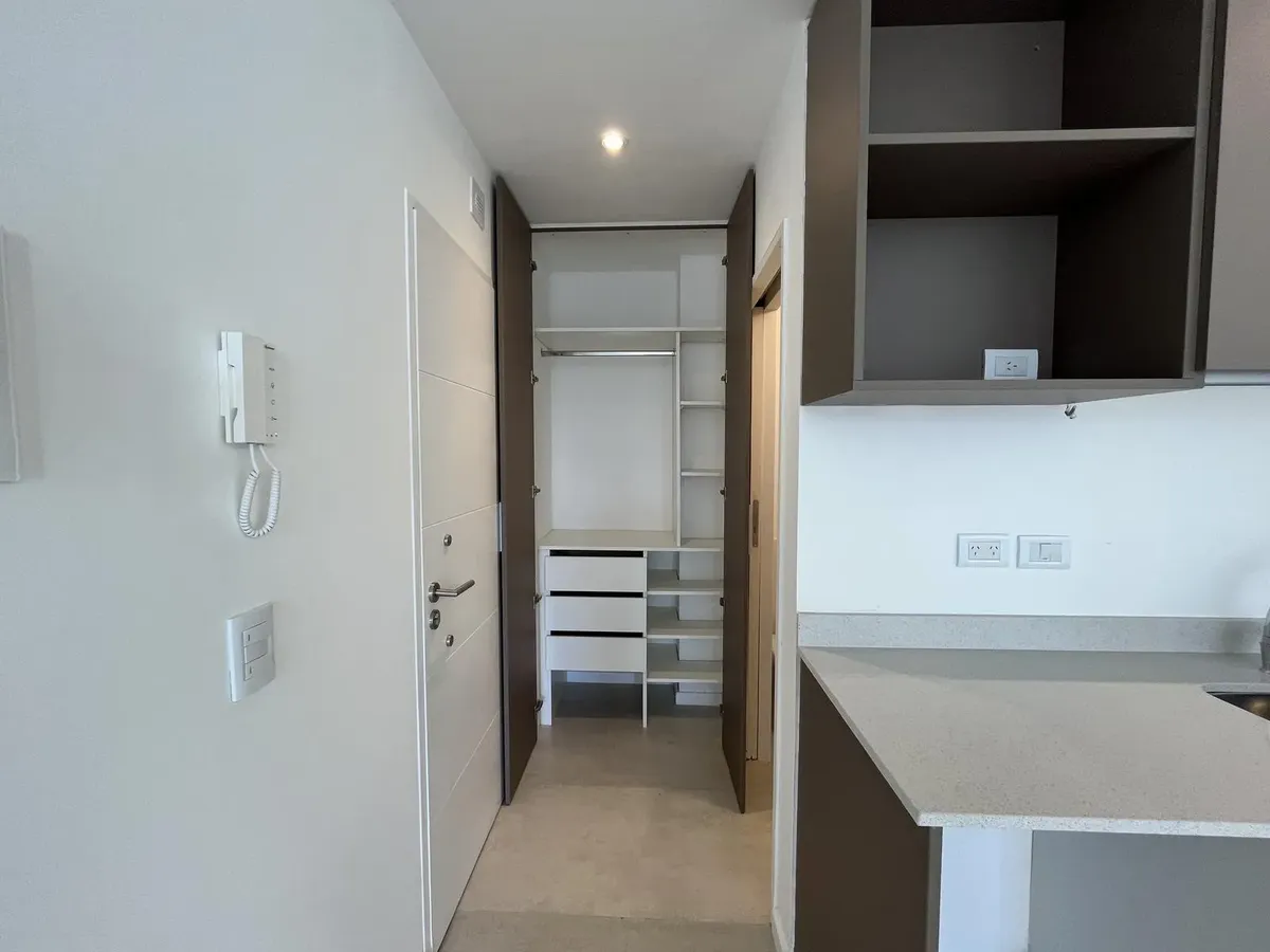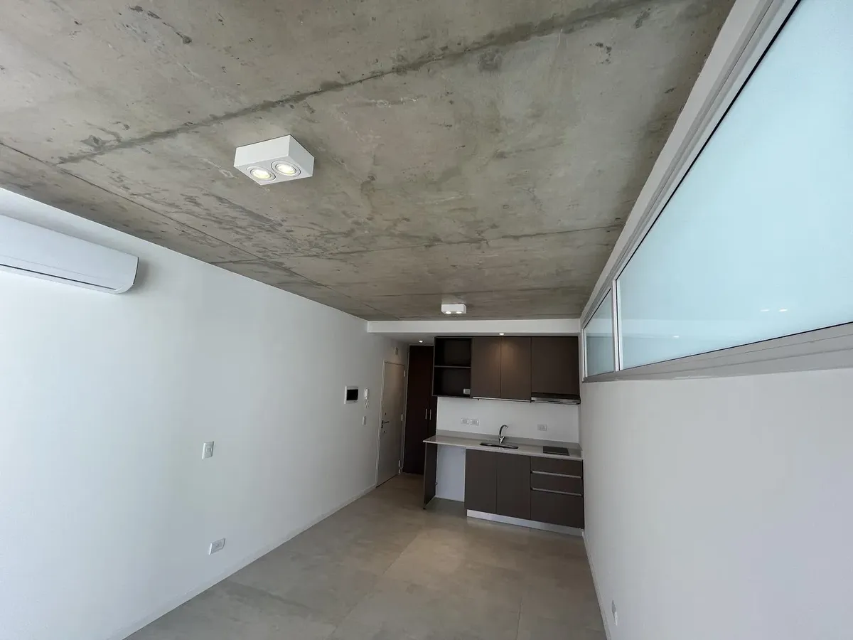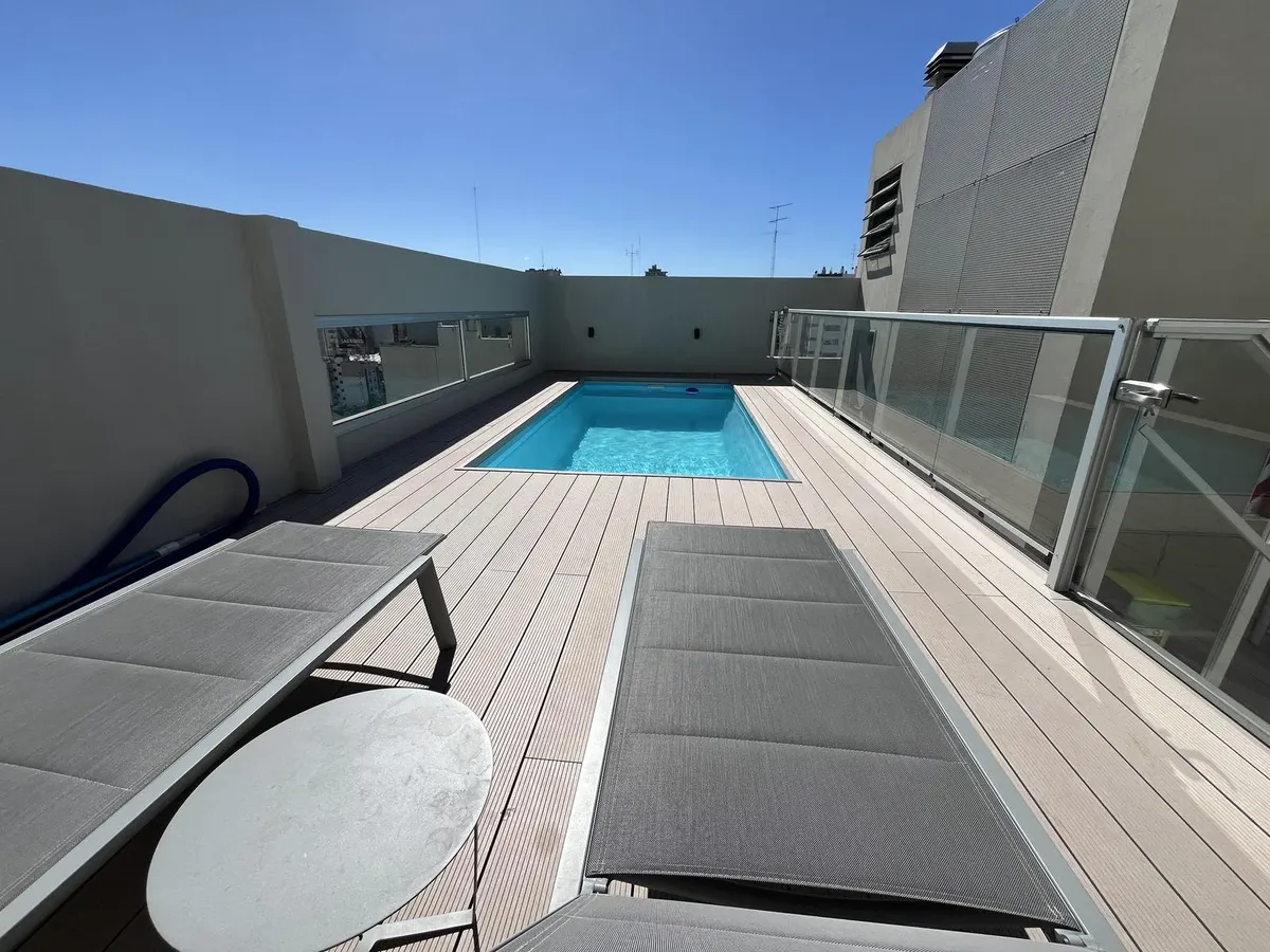 Studio apartment for rent in Núñez, at Av. Cabildo and close to the head of Línea D of the Buenos Aires Underground. The unit has reverse-cycle air conditioning (cold/hot), full-height closet, and double-glazed windows (DVH), with finishes described as ready to move in. The building has a roof terrace with a grill, laundry facilities, solarium, a pool, plus a bicycle storage area and a storage room (baulera). Building fees, taxes and utilities are approximate.