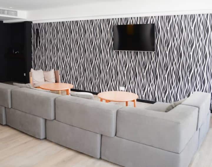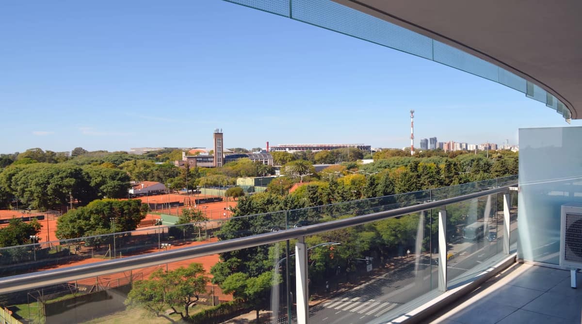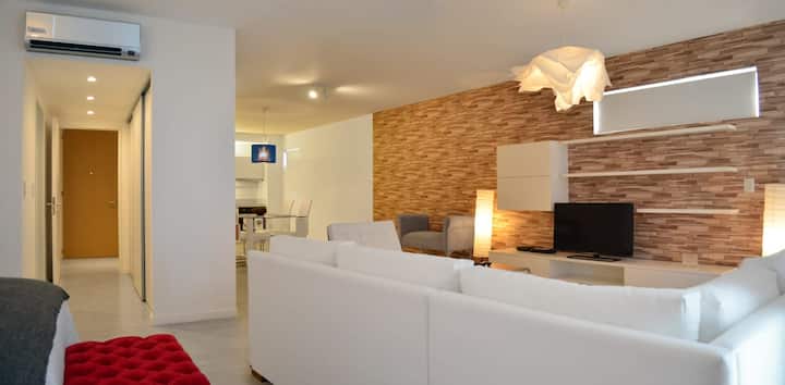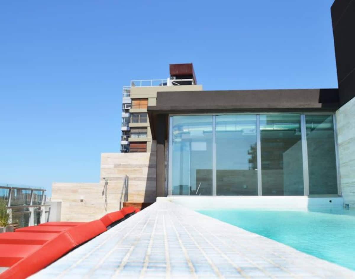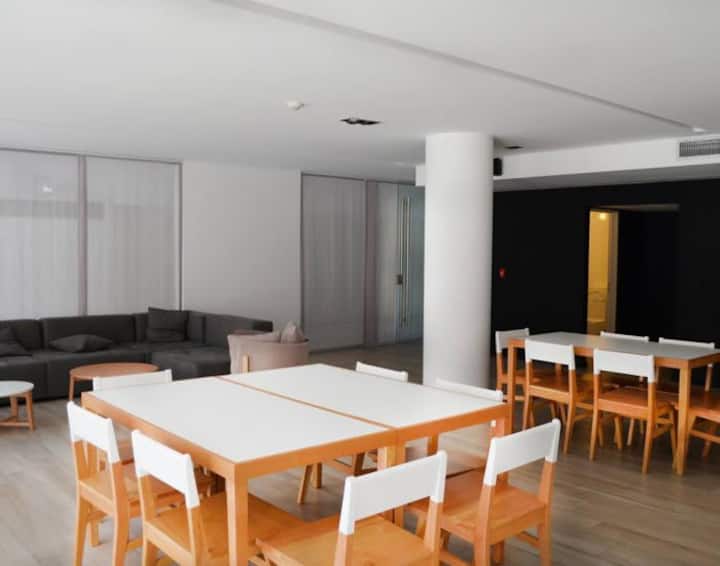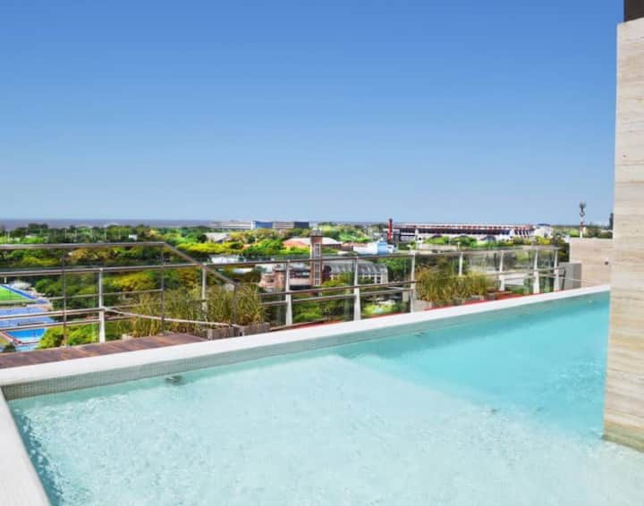 Studio apartment of 89 m² in a newly built building designed by local architect Sergio Smolkin. Open-plan unit with large windows, a balcony, a fully equipped kitchen with a marble countertop, and a king-size bed. The building has two rooftop pools, a gym, laundry facilities, and a BBQ grill.