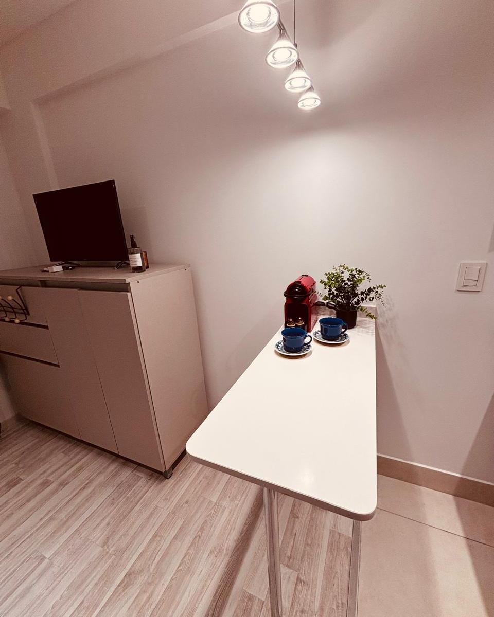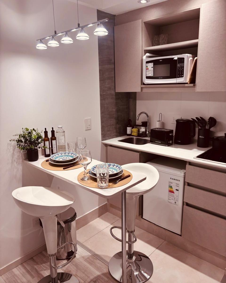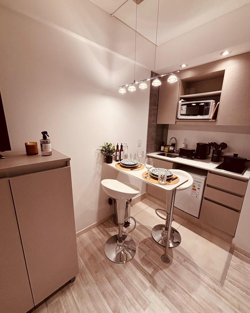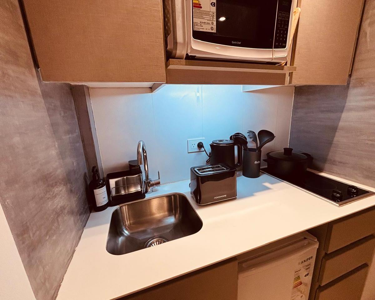 Studio apartment in Núñez, Buenos Aires. The air-conditioned unit includes 1 bedroom, cable TV, and a kitchen with a refrigerator and microwave. Building amenities include an outdoor pool, a terrace, 24-hour reception, and free Wi-Fi throughout. Aeroparque Jorge Newbery is 7 km away; Estadio River Plate is 1.9 km away.
