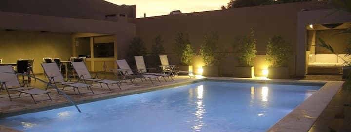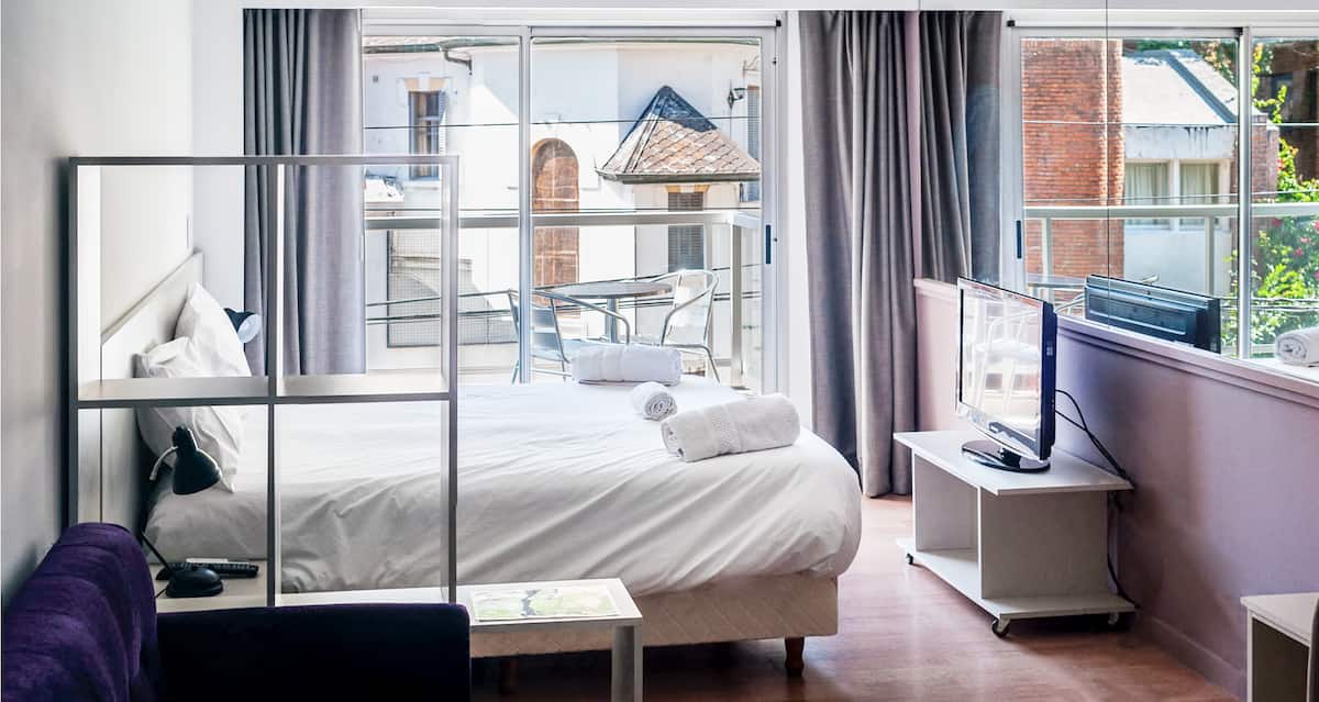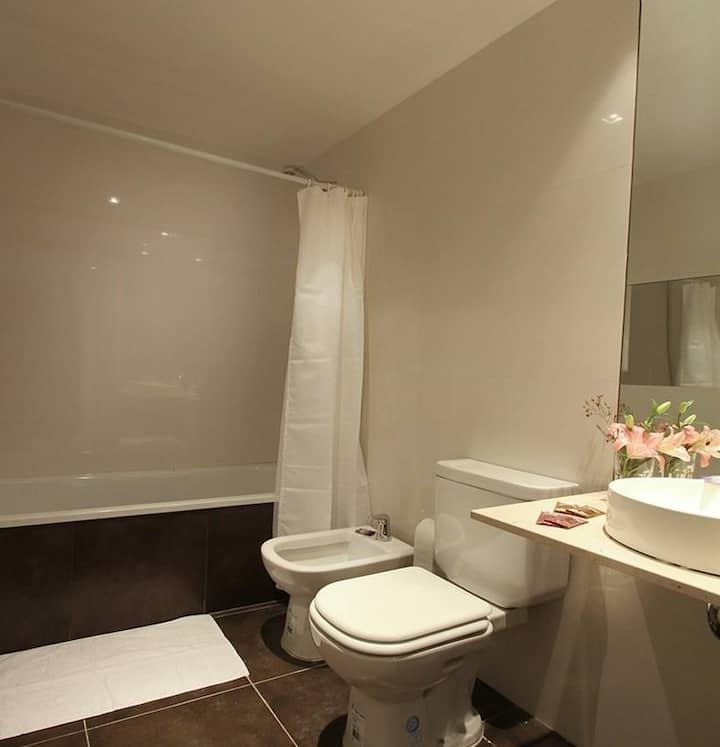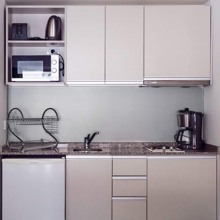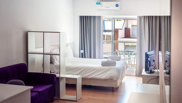 Studio apartment in Palermo, in a new building. The unit has a balcony, a full bathroom, and a kitchen. It is equipped with cable TV, Wi-Fi internet and air conditioning, and the bedding includes a queen-size bed (which can be split into two single beds) plus a double sofa bed. The building has a laundry room, swimming pool (available from 30 November), gym, a grill area, and 24-hour security. Check-in is from 3:00 pm and check-out is until 11:00 am.
