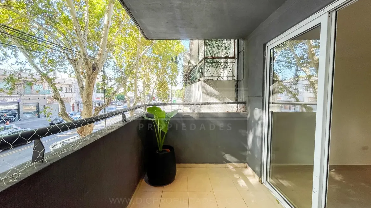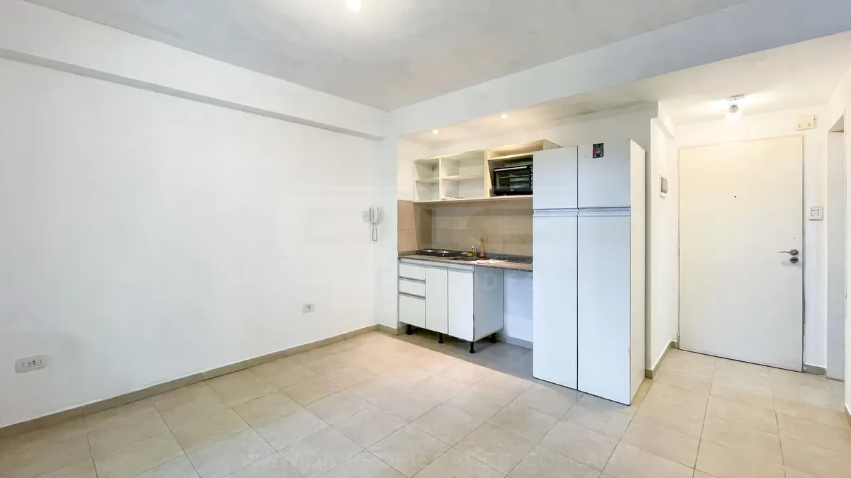 Studio apartment with a terrace-style balcony in Parque Chas. About 24 m² total area, in a modern building with laundry. The integrated kitchenette includes a countertop with under-counter storage and space for a fridge, with provision for an oven or hotplate; the bathroom has a shower and natural ventilation. Air conditioning is installed, with a storage space/wardrobe inside the main room; windows face the street. Close to public transport and Subte service, and near shops and banks.