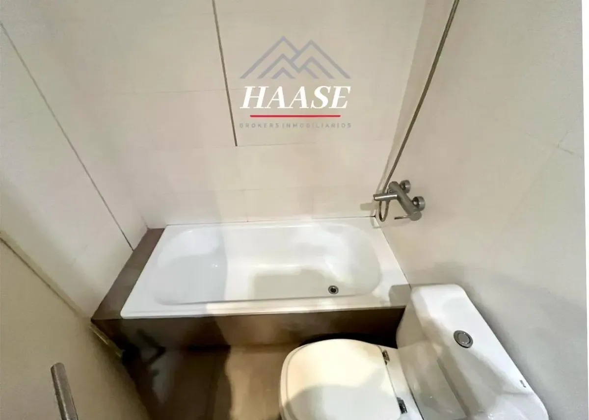 Studio apartment in Parque Chas with a front-facing balcony. 36 m² total, including 30 m² covered and 6 m² (3 x 2) balcony. Kitchen with integrated cabinetry, built-in oven and hot plate, full bathroom with bathtub, porcelain tile floors, and heating/cooling air conditioning.