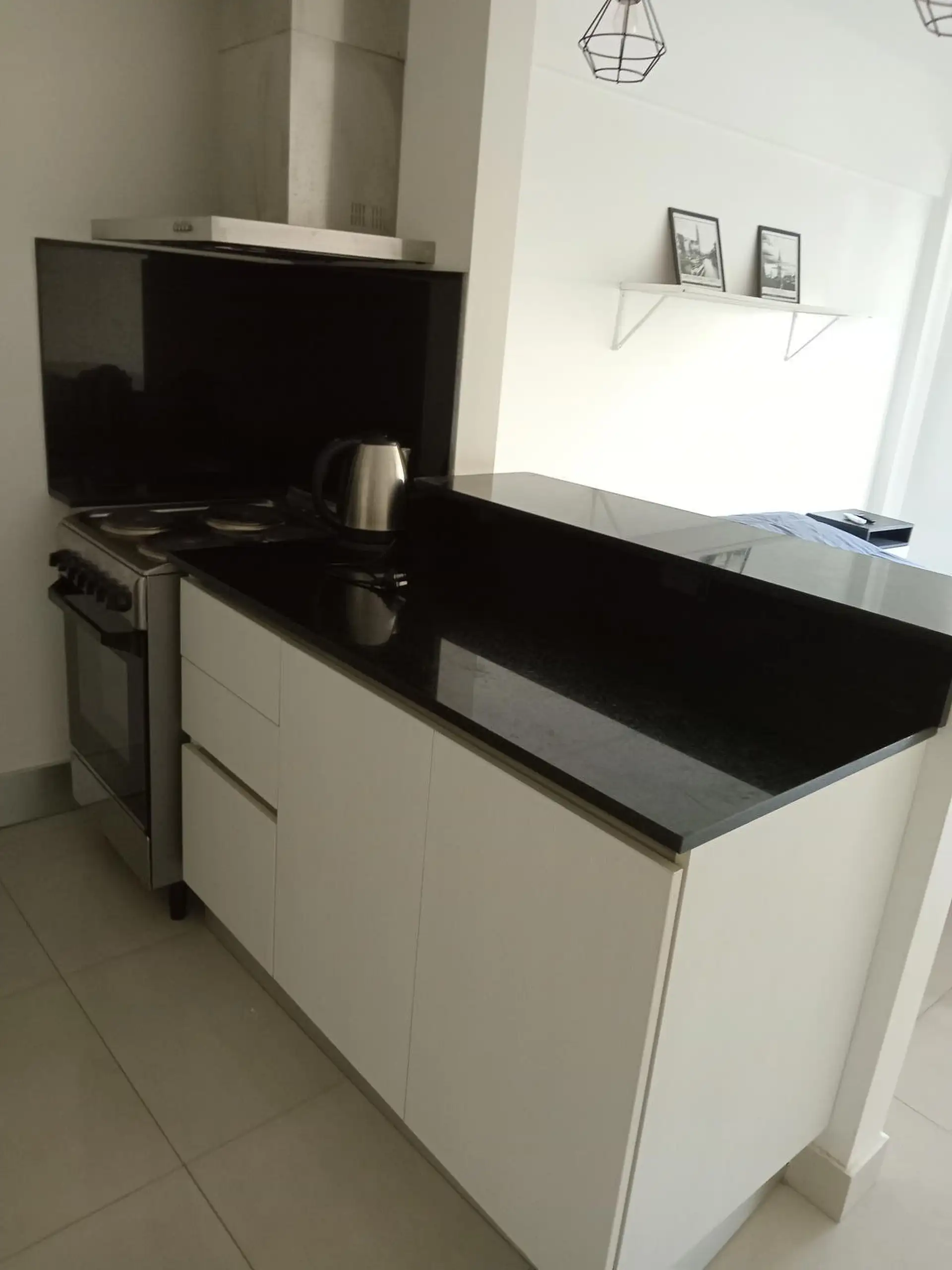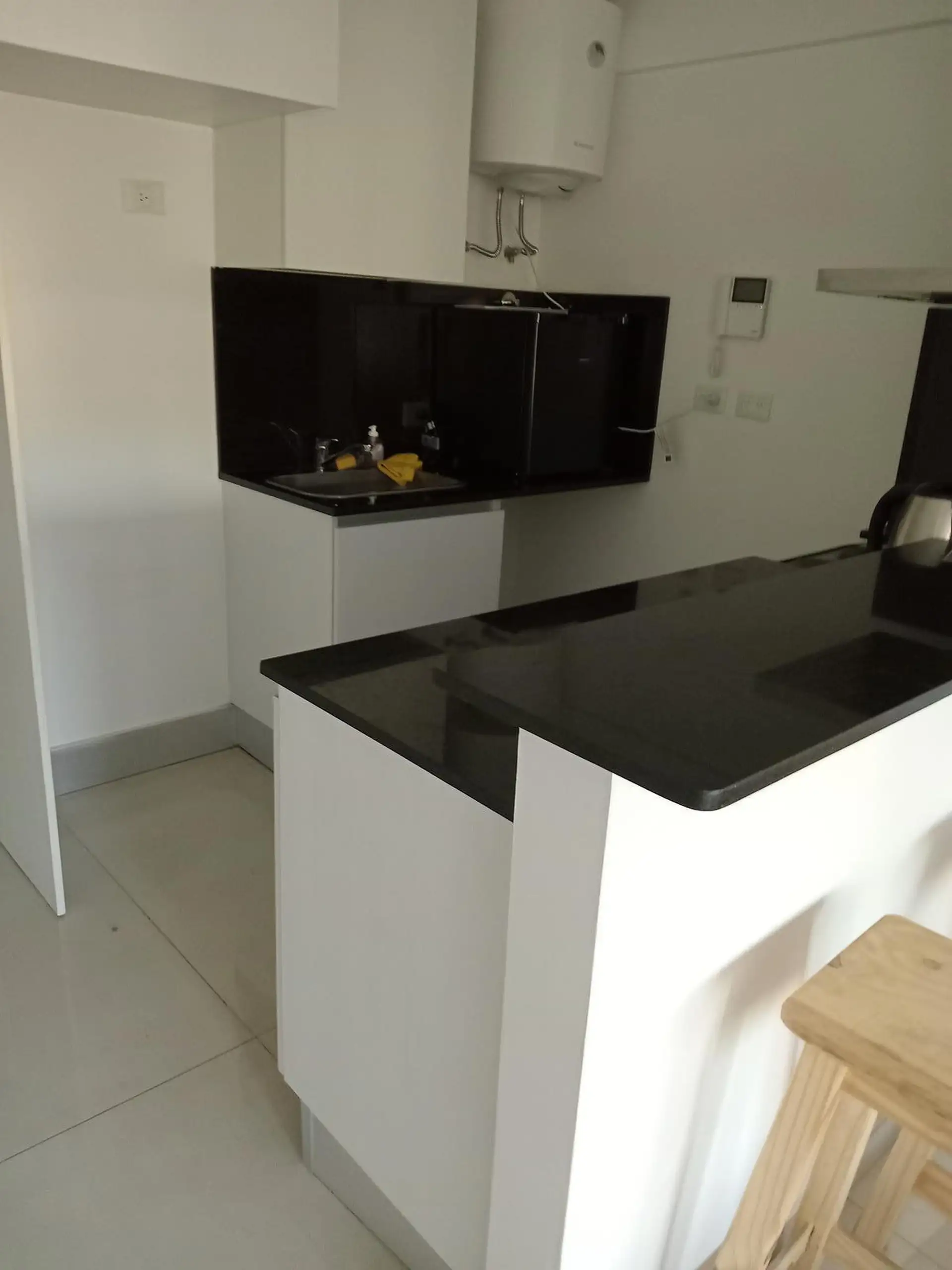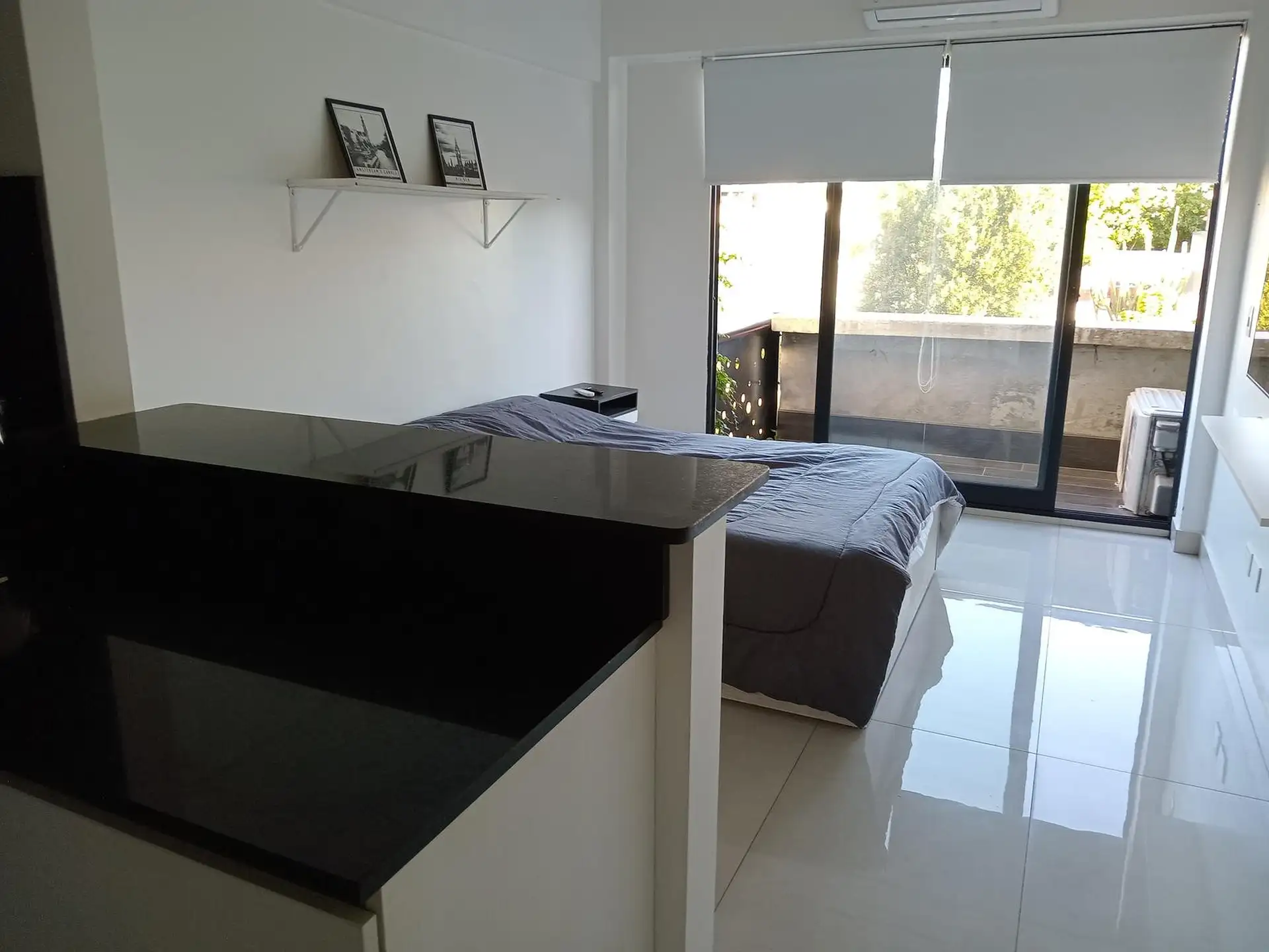Studio apartment with a balcony that faces the interior block courtyard in Parque Chas. Covered area 25.57 m², plus 2.77 m² balcony, for a total of 28.34 m². Integrated kitchen with black marble worktop, upper and lower cabinetry, and stainless-steel extractor hood; bathroom with a built-in shower cabin. Hot/cold air conditioning, fully electric appliances including Indesit, and an Ariston water heater; installed curtains and lighting. Building has a doorman with a viewer. Contract requires an i