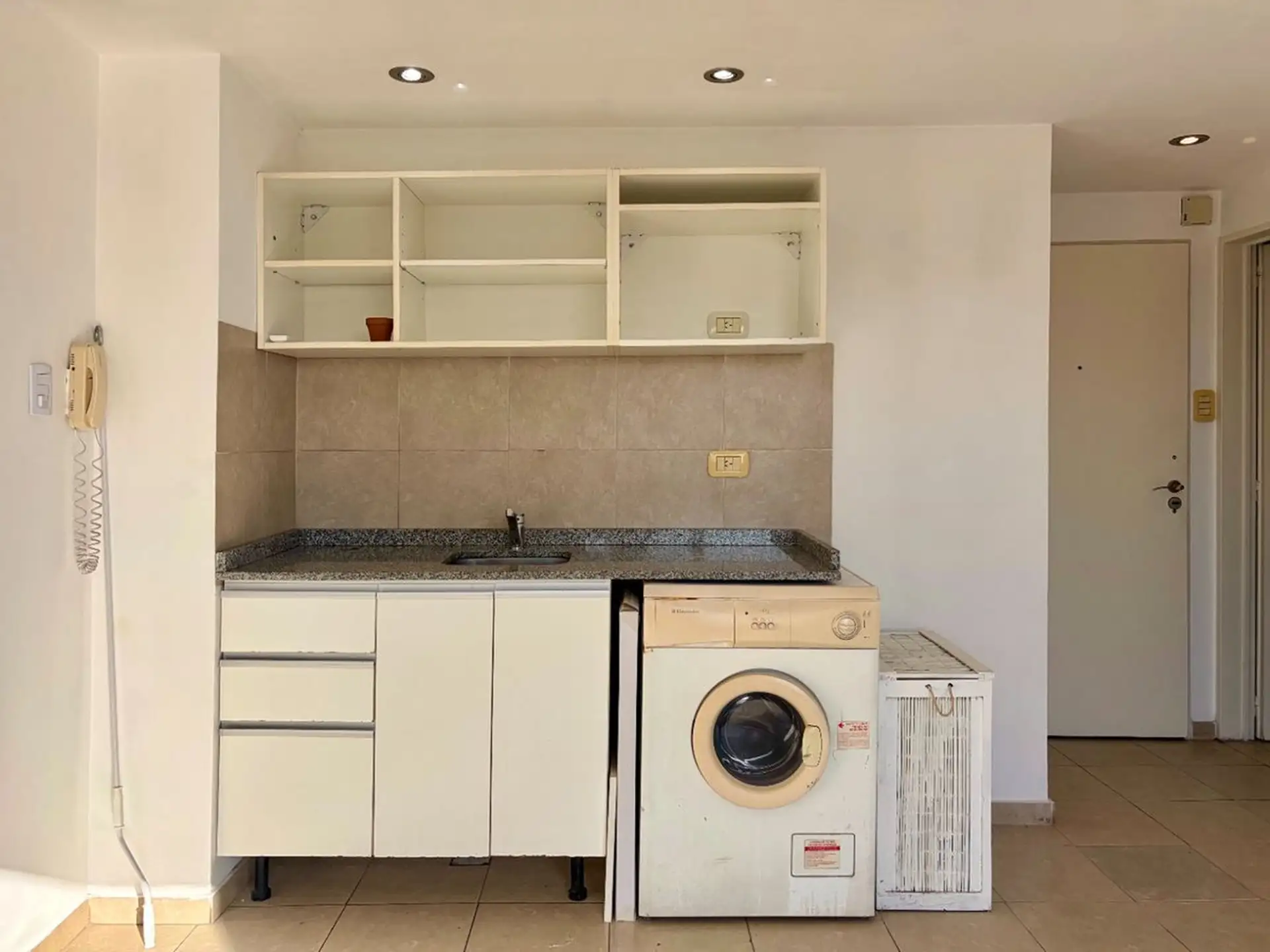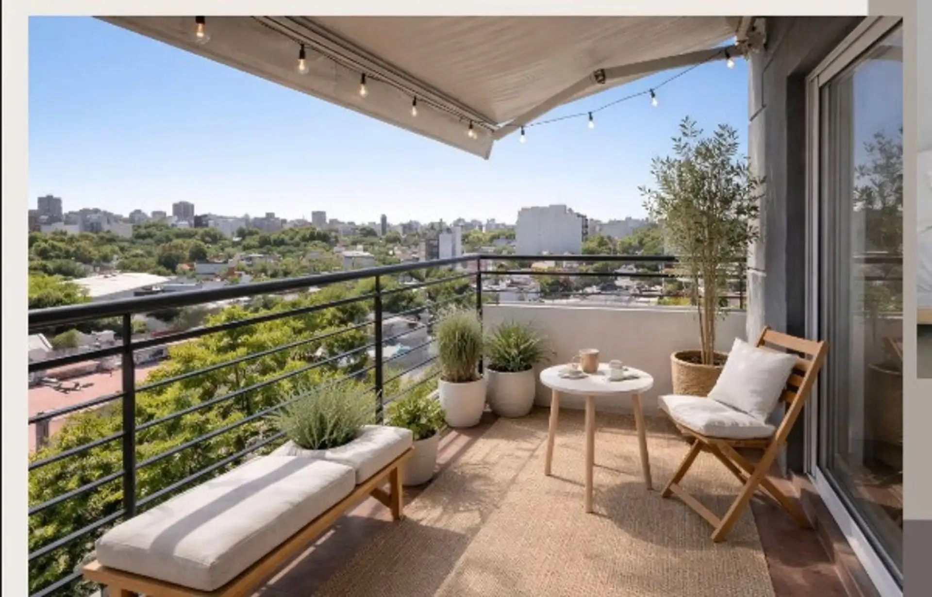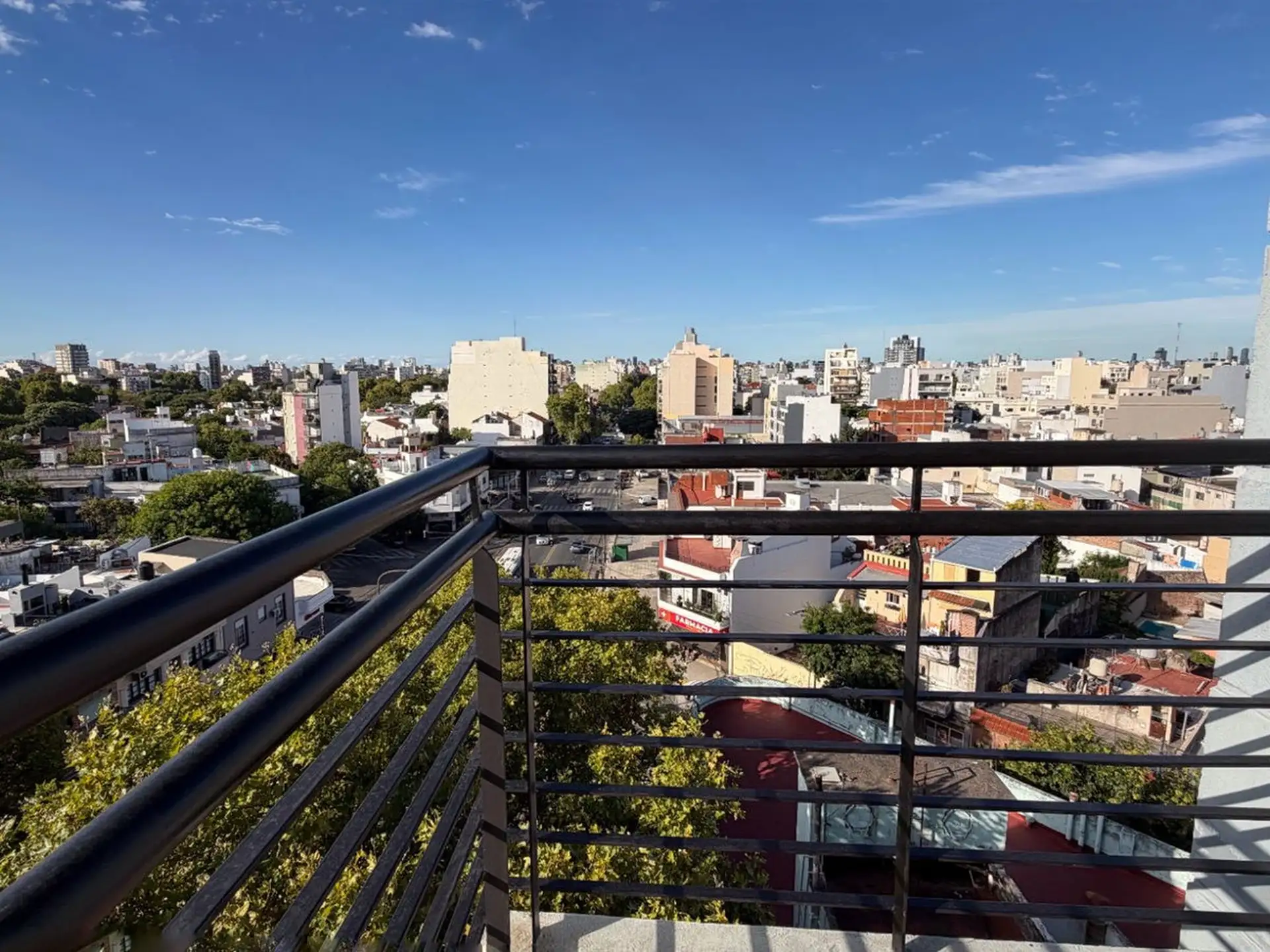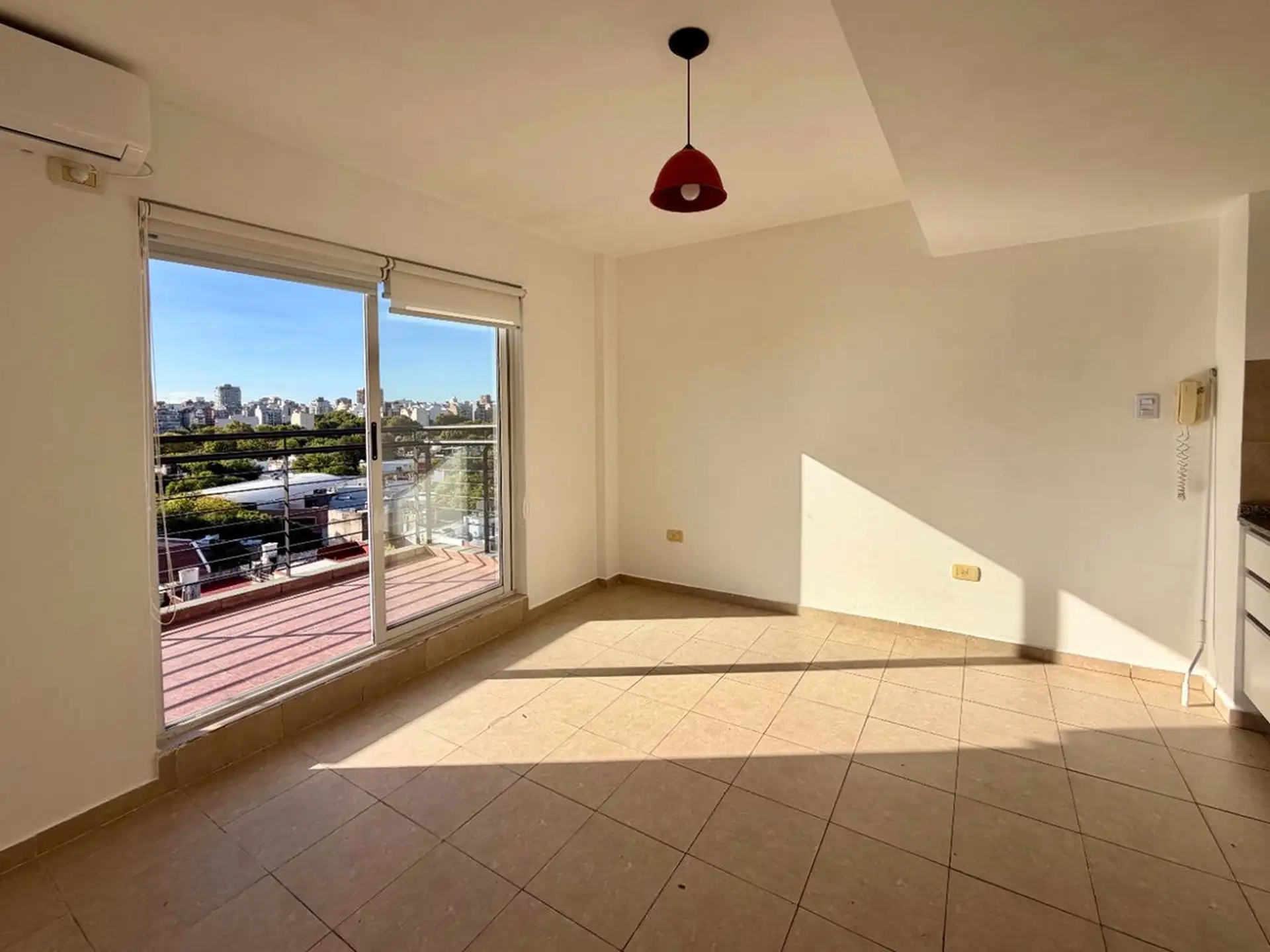 Studio apartment of 24 m² total on the 8th floor, street-facing in Parque Chas, Buenos Aires. Open-plan kitchen, full bathroom with bathtub, and a terrace-style balcony with a retractable vinyl awning. Air conditioning (hot/cold), roller curtains (blackout and sunscreen), and space for a washing machine and refrigerator. The building has low building fees and is about 5 blocks from the Subte. Lease: 2-year contract with quarterly rent increases tied to IPC.