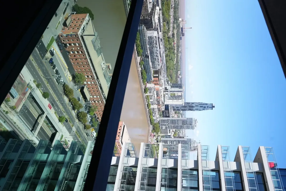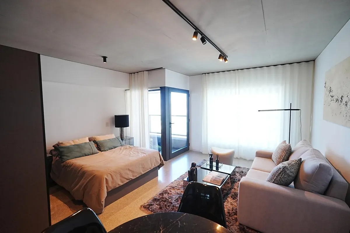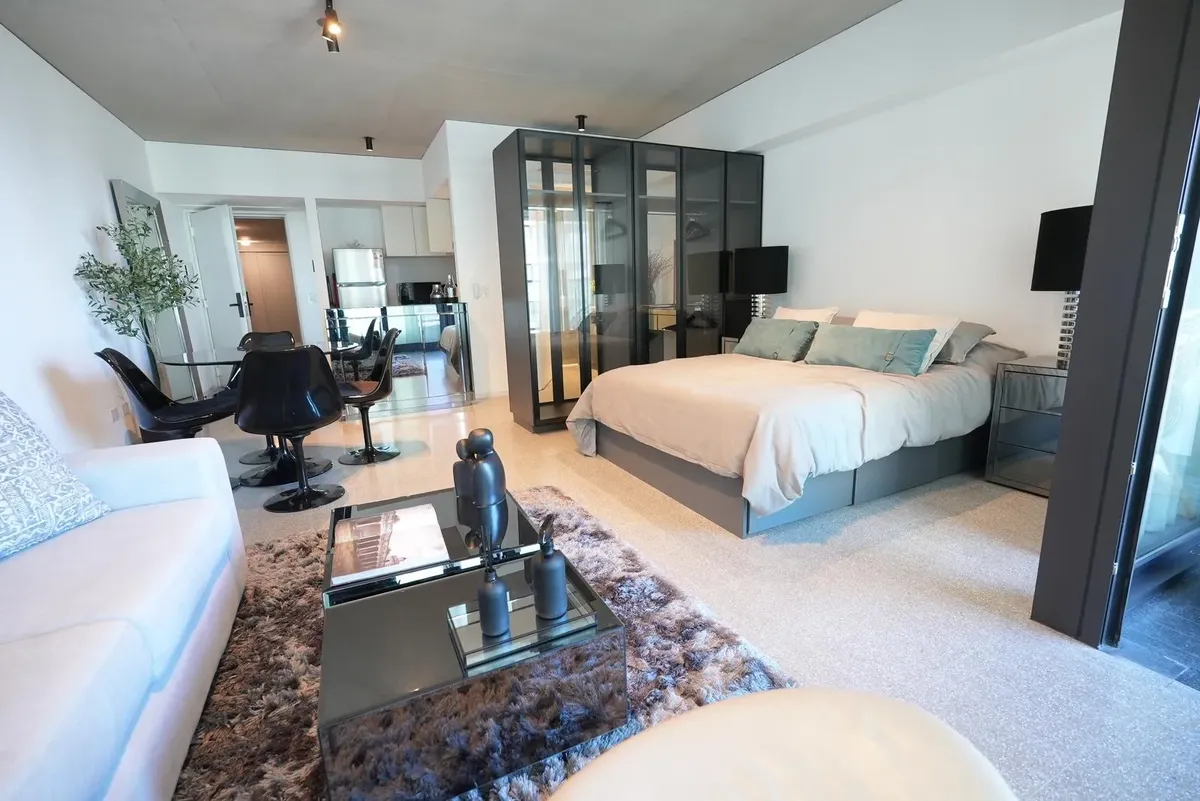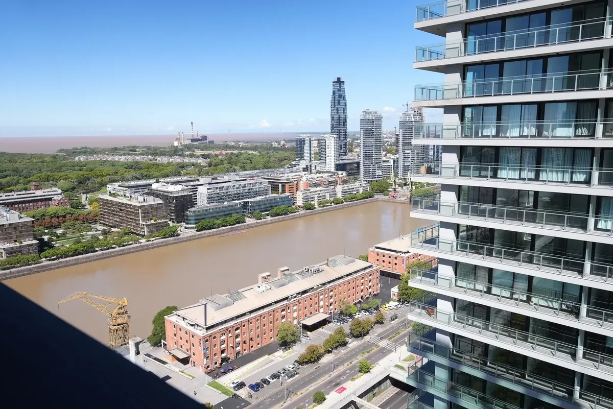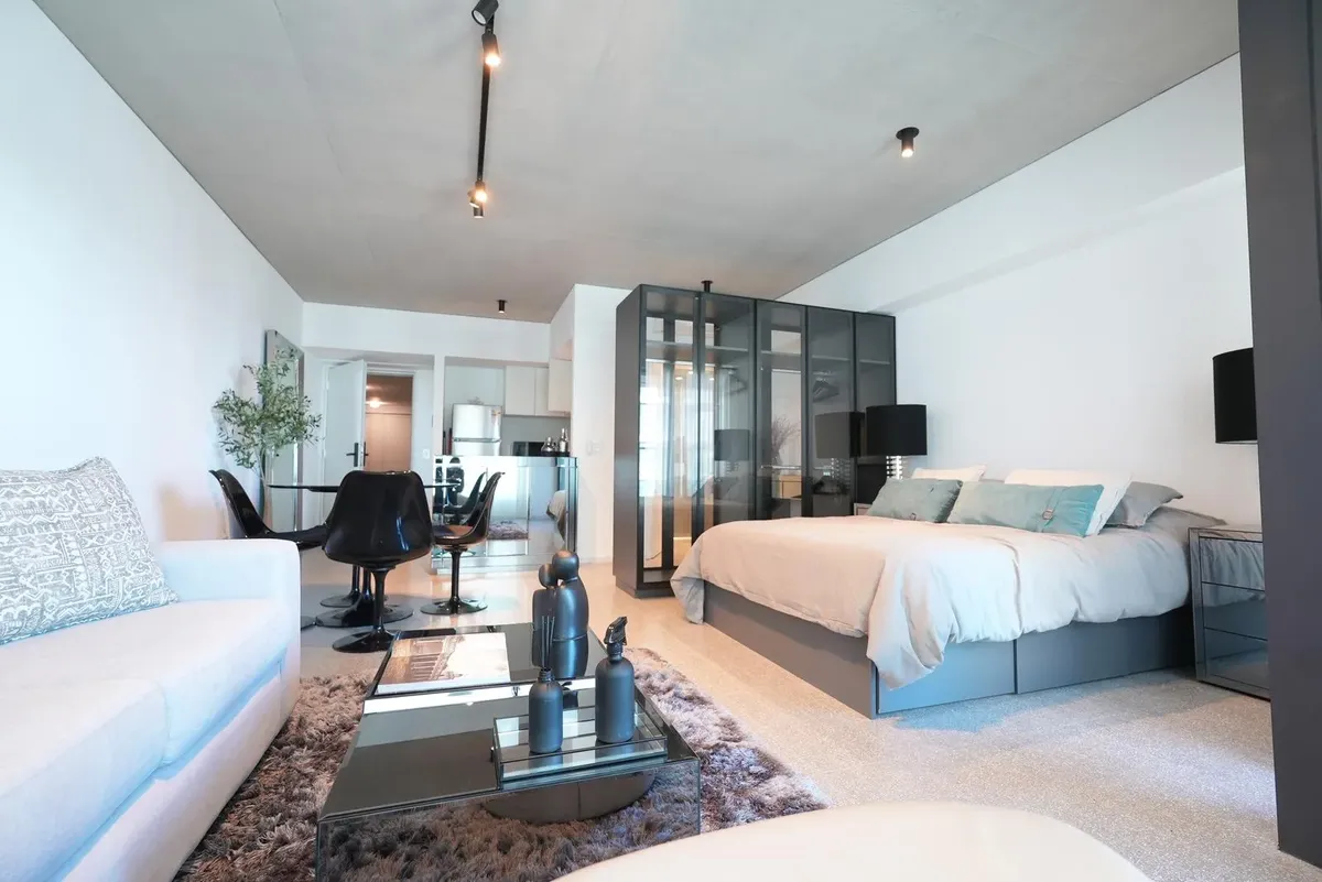 Furnished studio apartment for rent in Puerto Madero, with 42 m² total area. The layout separates the living, sleeping and dining areas. Located at Huergo 475, in an area with quick access to the city centre and nearby transport.