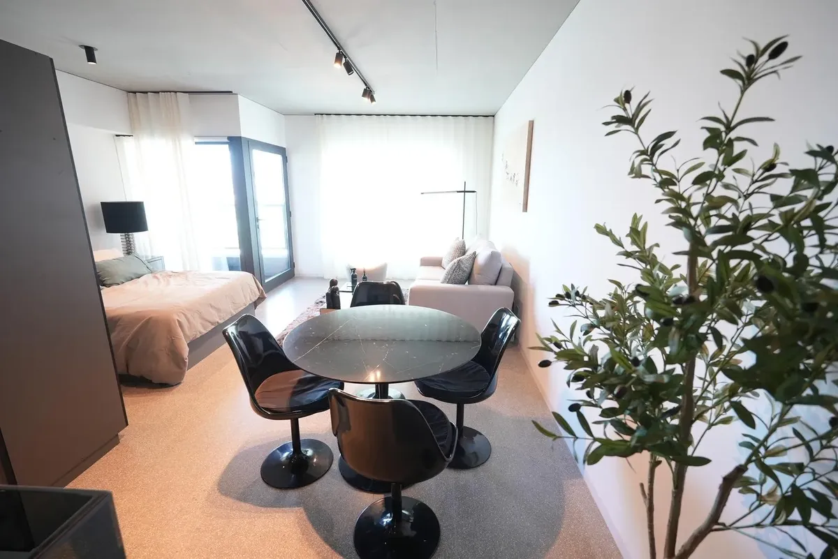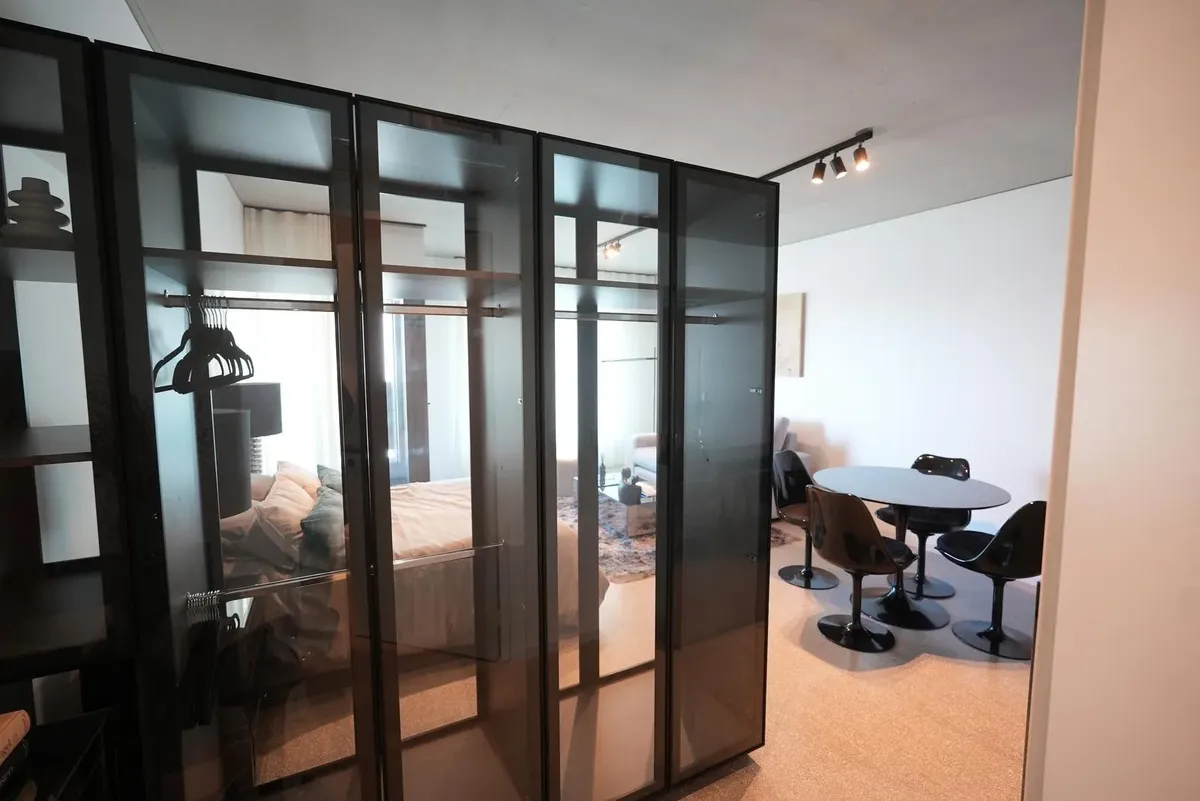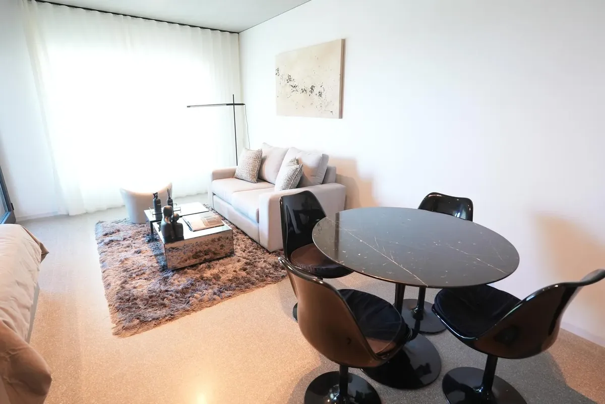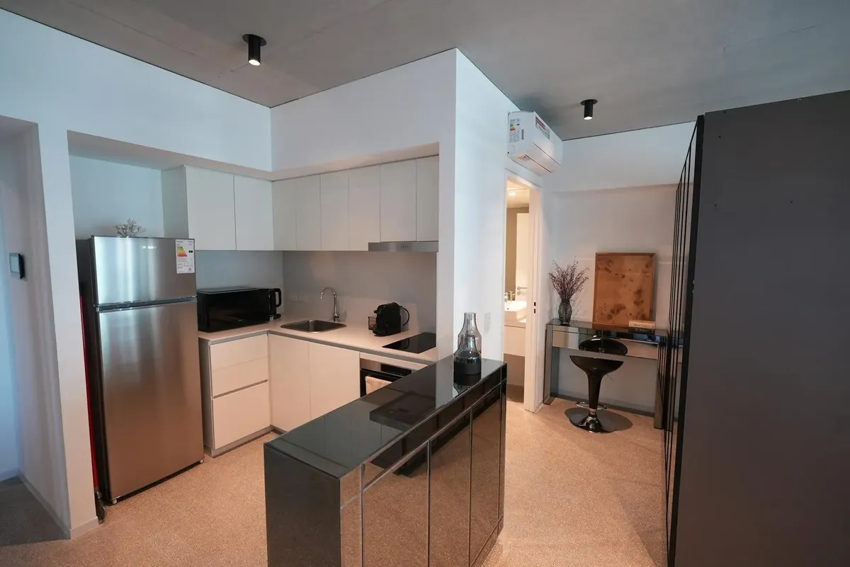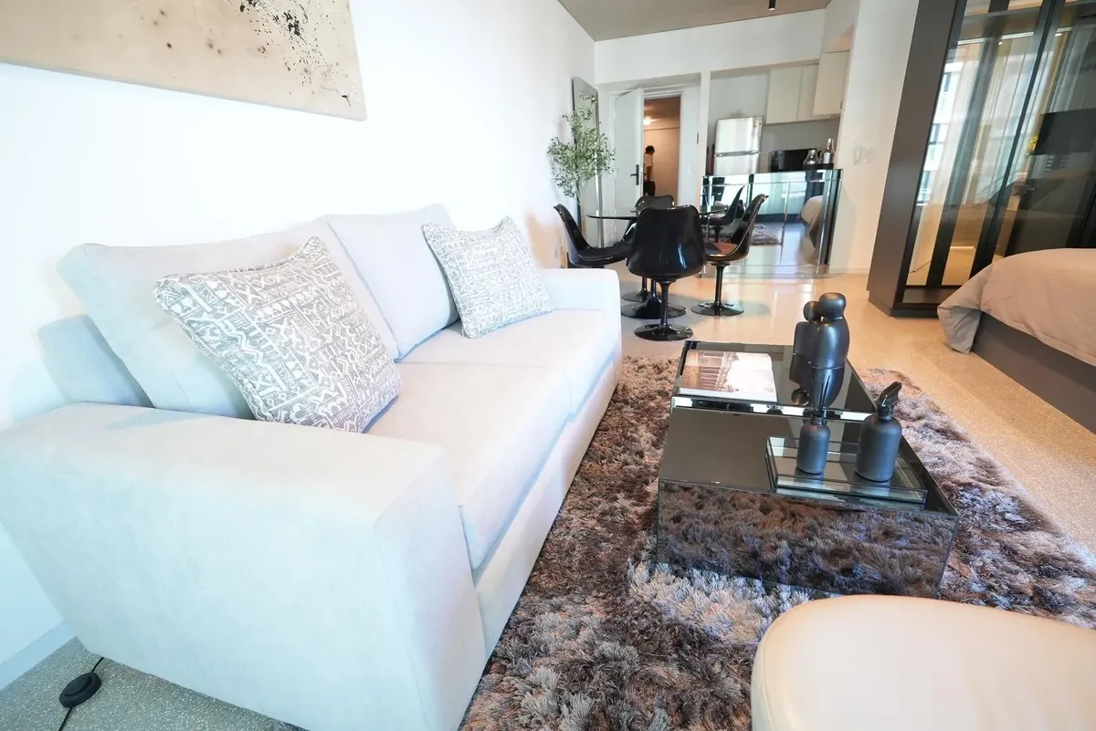 Furnished studio apartment for rent in Puerto Madero, with 42 m² total area. The layout separates the living, sleeping and dining areas. Located at Huergo 475, in an area with quick access to the city centre and nearby transport.