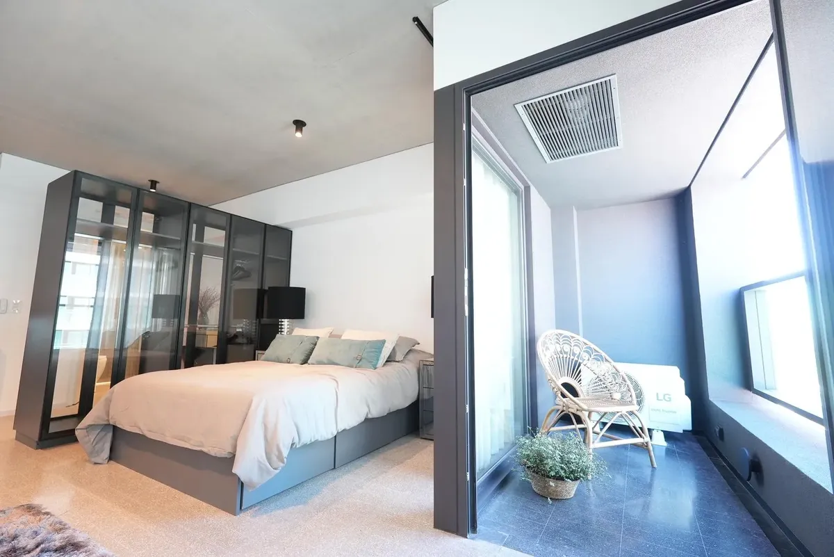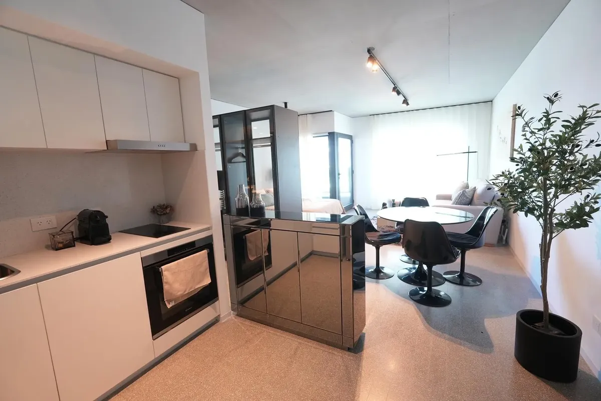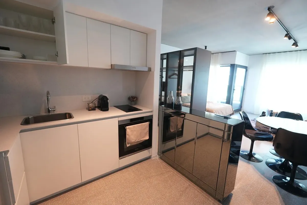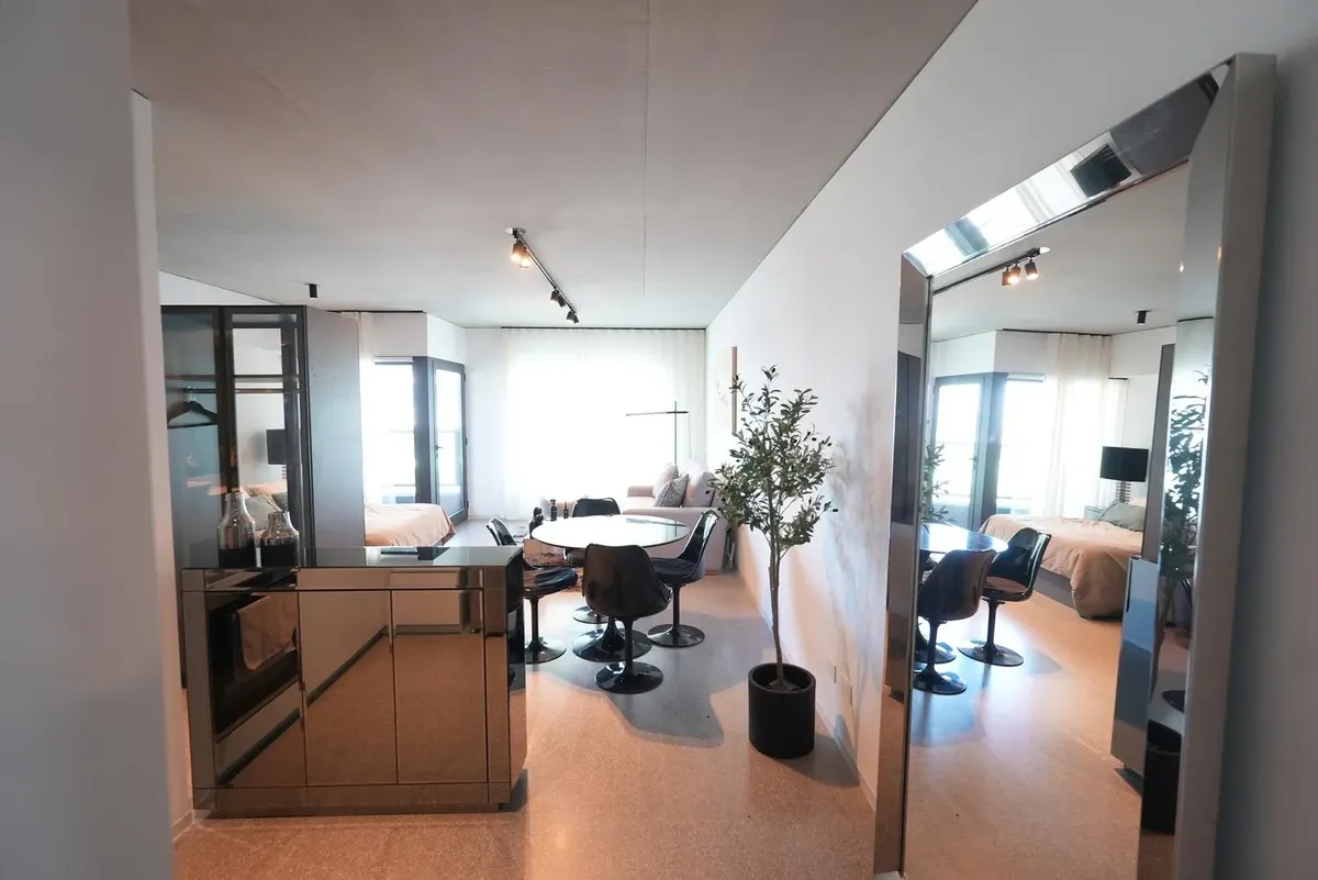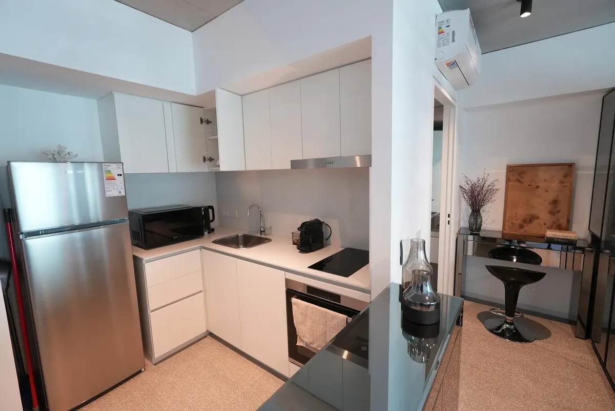 Furnished studio apartment for rent in Puerto Madero, with 42 m² total area. The layout separates the living, sleeping and dining areas. Located at Huergo 475, in an area with quick access to the city centre and nearby transport.