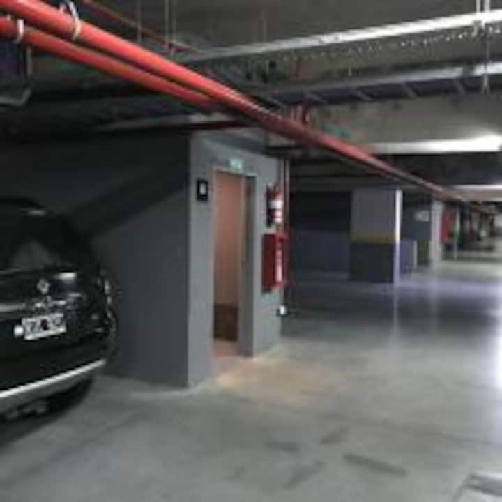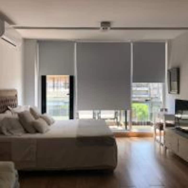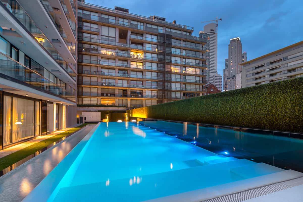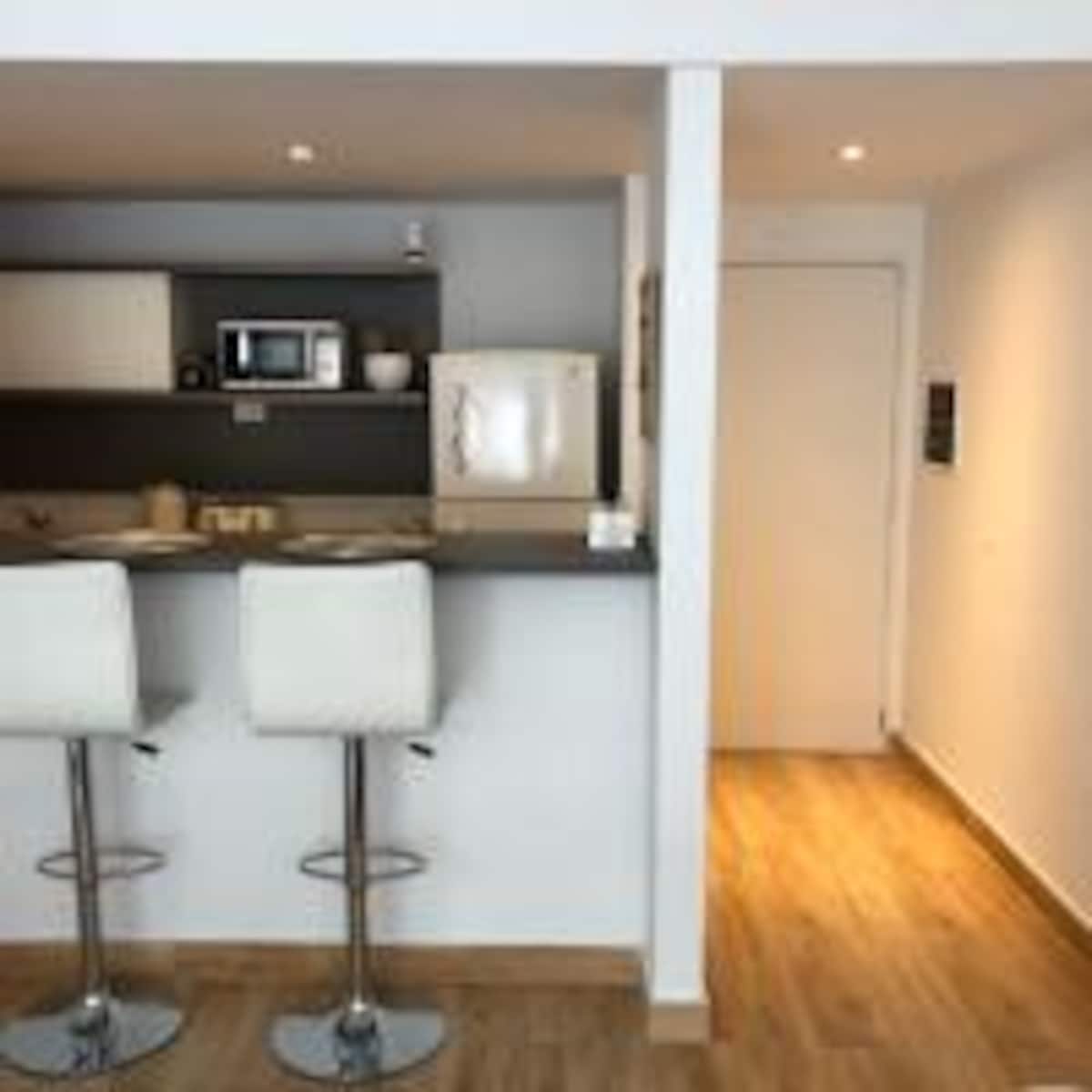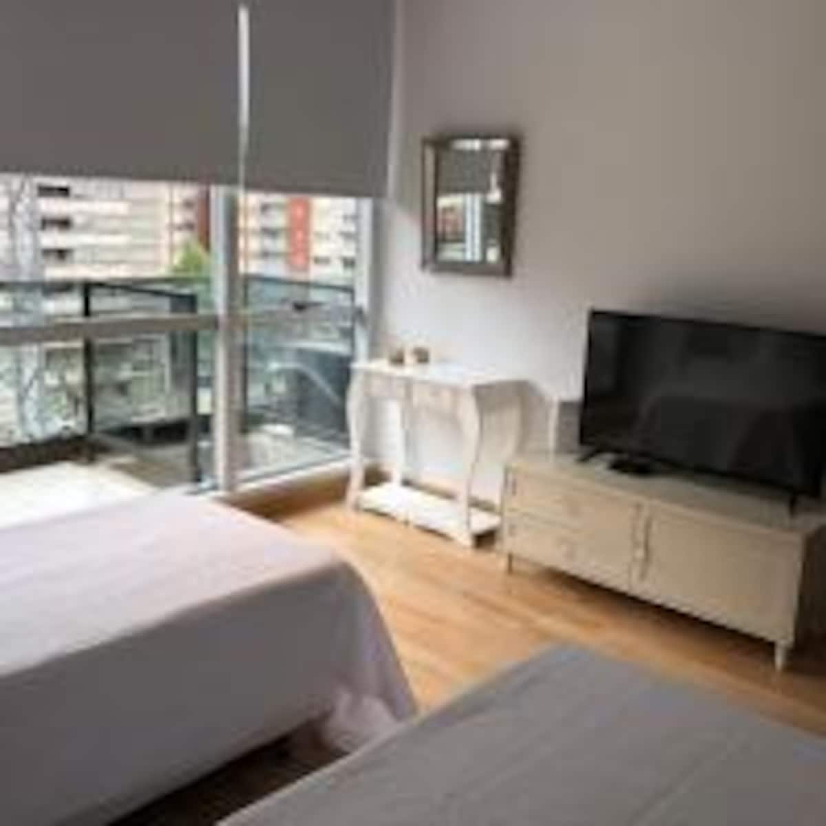 Studio apartment in Puerto Madero with views of the pool. The apartment includes a fully equipped kitchen with microwave, living area with sofa, flat-screen TV, dishwasher, washing machine, and a private bathroom with bidet and hair dryer. Facilities include an outdoor pool, fitness centre, shared lounge, garden, solarium, free WiFi, and private parking.