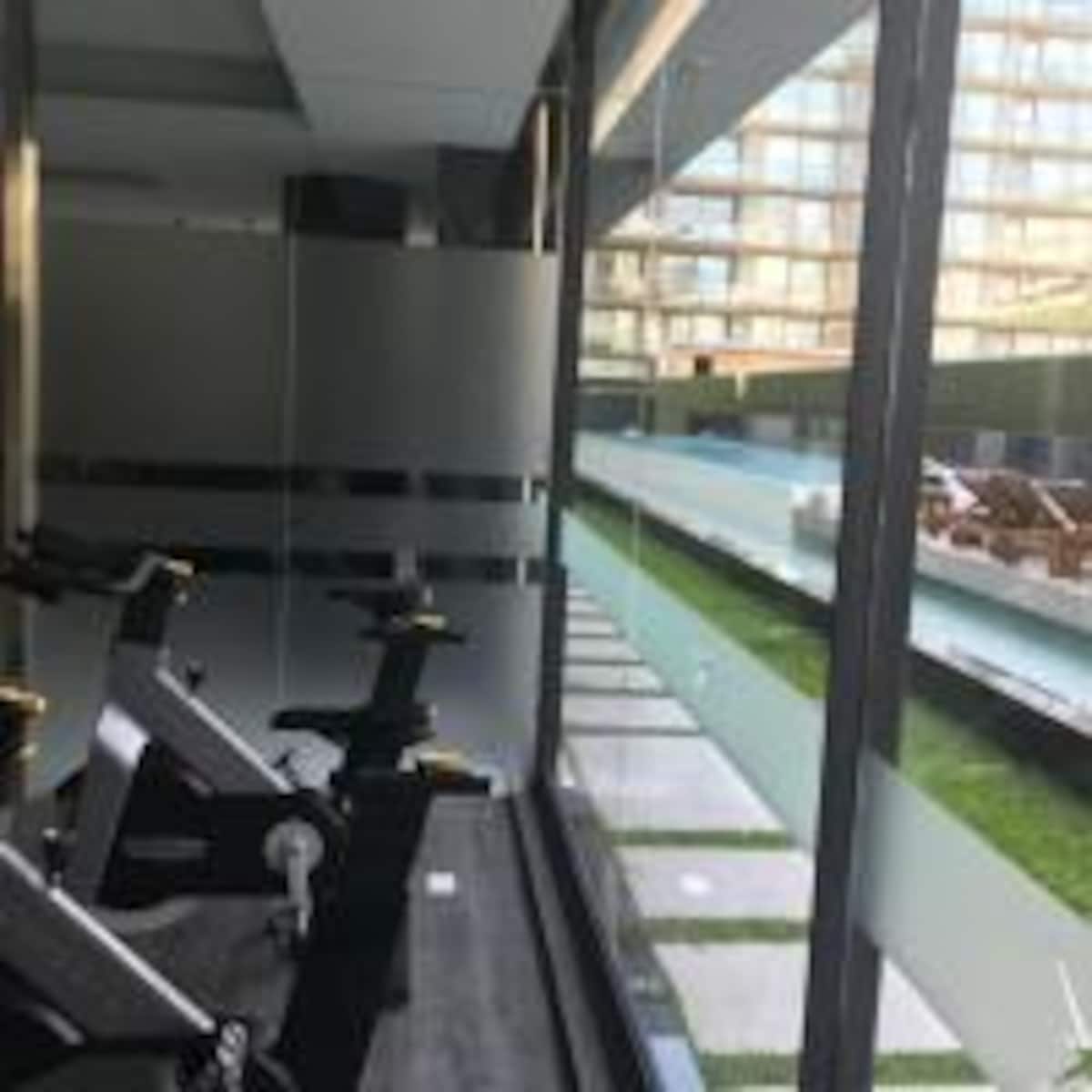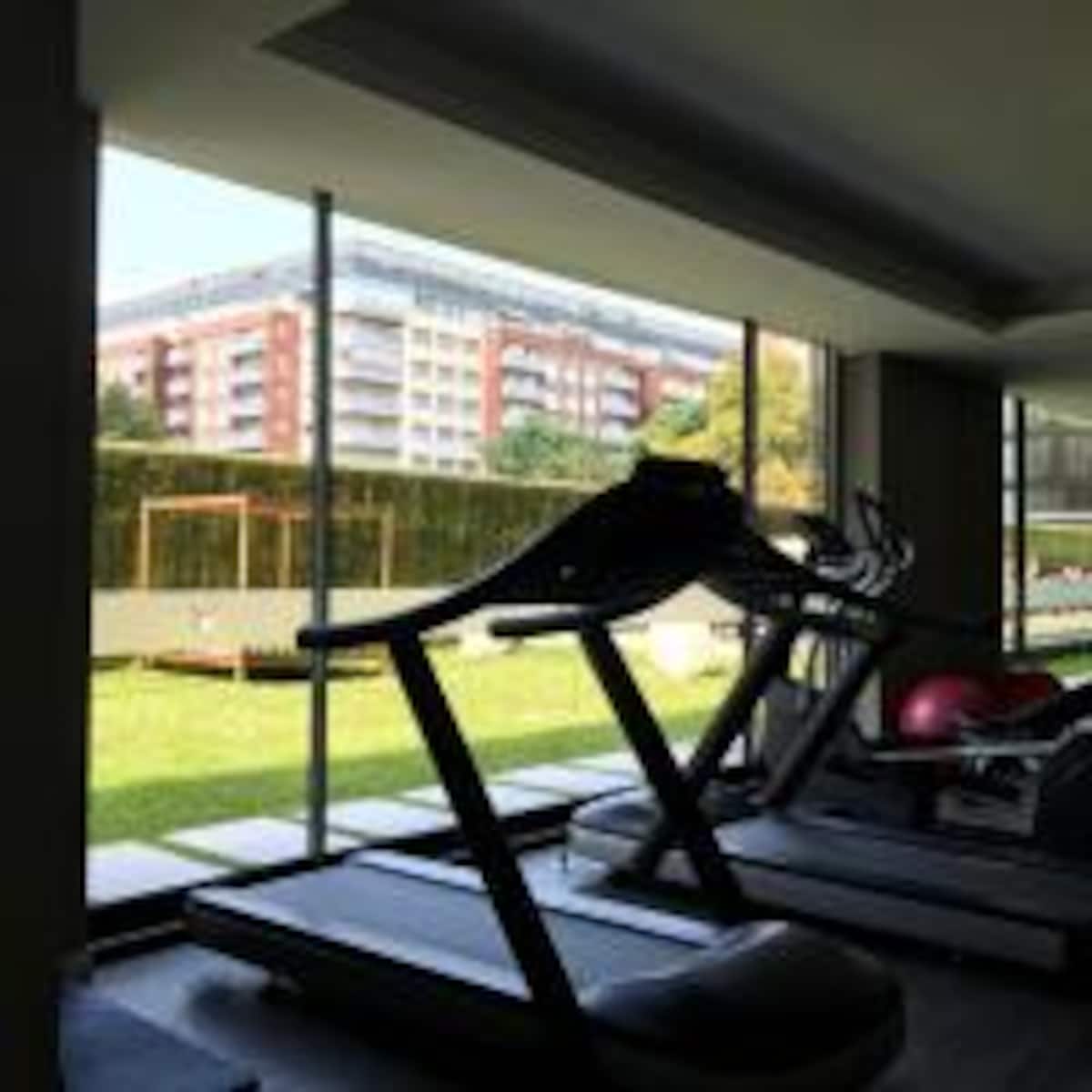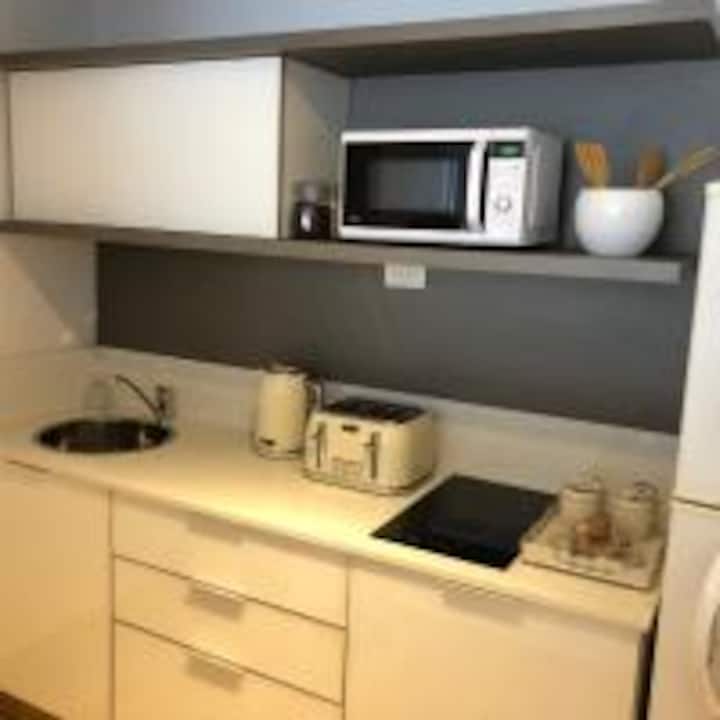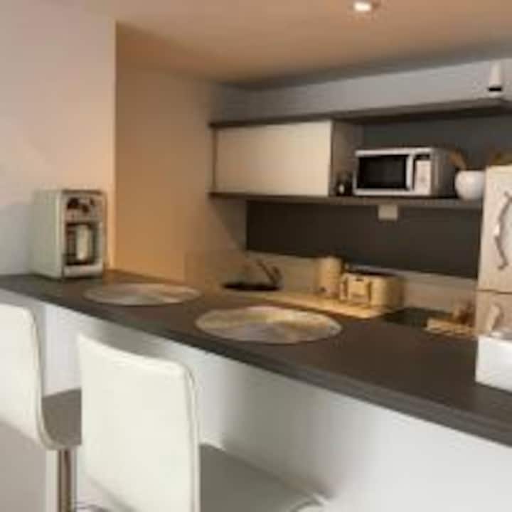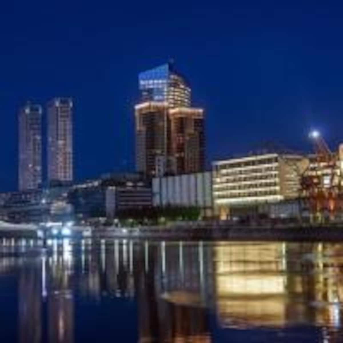 Studio apartment in Puerto Madero with views of the pool. The apartment includes a fully equipped kitchen with microwave, living area with sofa, flat-screen TV, dishwasher, washing machine, and a private bathroom with bidet and hair dryer. Facilities include an outdoor pool, fitness centre, shared lounge, garden, solarium, free WiFi, and private parking.