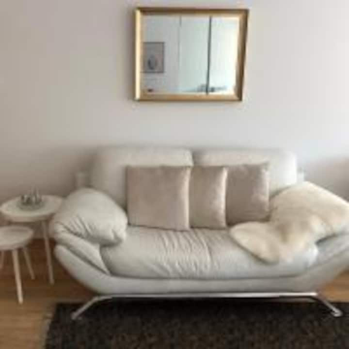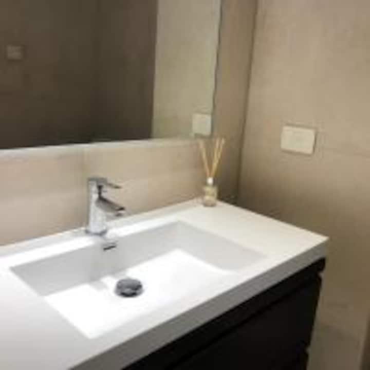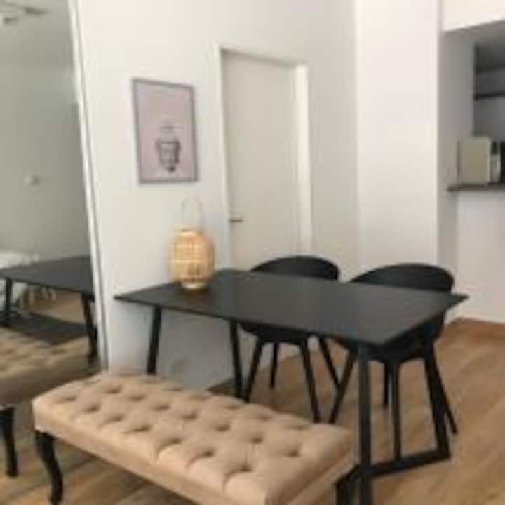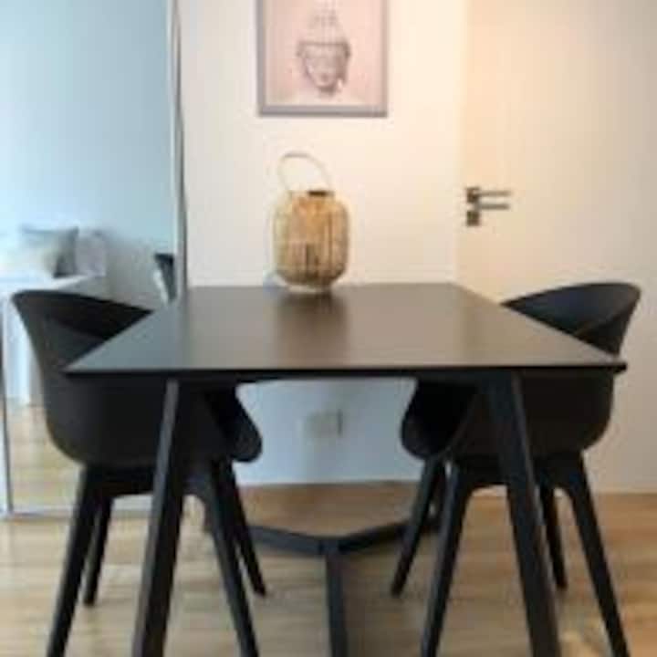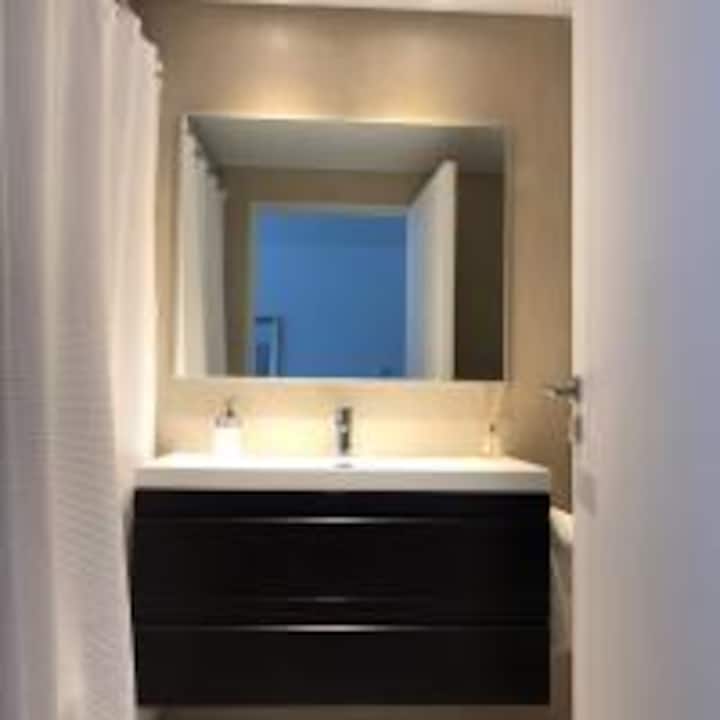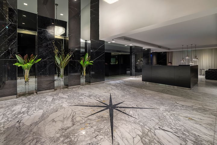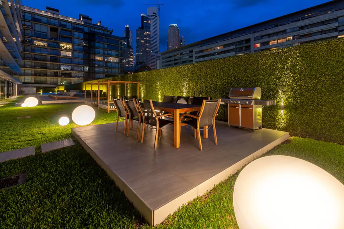 Studio apartment in Puerto Madero with views of the pool. The apartment includes a fully equipped kitchen with microwave, living area with sofa, flat-screen TV, dishwasher, washing machine, and a private bathroom with bidet and hair dryer. Facilities include an outdoor pool, fitness centre, shared lounge, garden, solarium, free WiFi, and private parking.