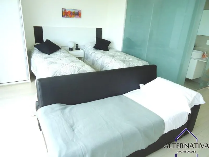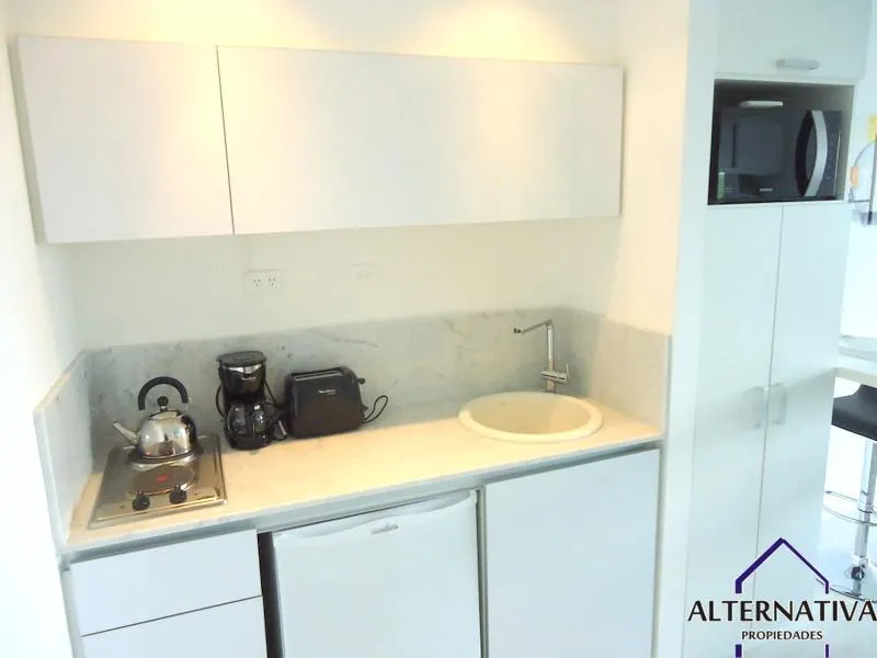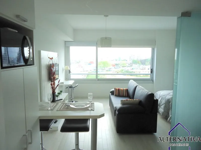 Studio apartment in Puerto Madero, available for short-term monthly rental for a minimum of 3 months up to 1 year (renewable). Newly built, with cable TV connection, sofa bed, and air conditioning. American-style kitchen with under-counter fridge, electric cooktop, microwave, tableware, and a breakfast bar. The unit includes two single beds for up to 3 people and a full bathroom. Building amenities include 24-hour security, solarium, residents’ lounge, gym, heated swimming pool, sauna, spa, laun
