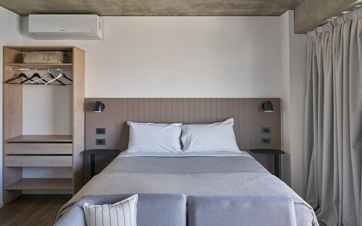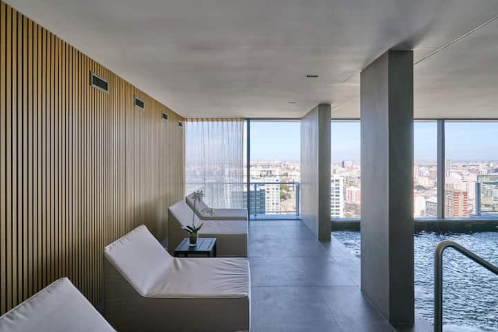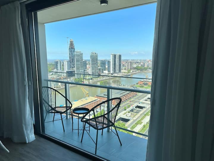 Brand-new studio apartment in Puerto Madero on a high floor with views of the river and the city skyline. There is a private balcony and a fully equipped kitchen with modern appliances. The bathroom is full, and the building offers 24-hour security, an outdoor pool, a jacuzzi, a sauna and a fully equipped gym. The indoor pool/jacuzzi is out of service until further notice.