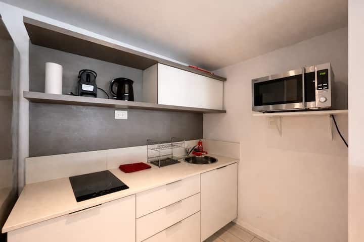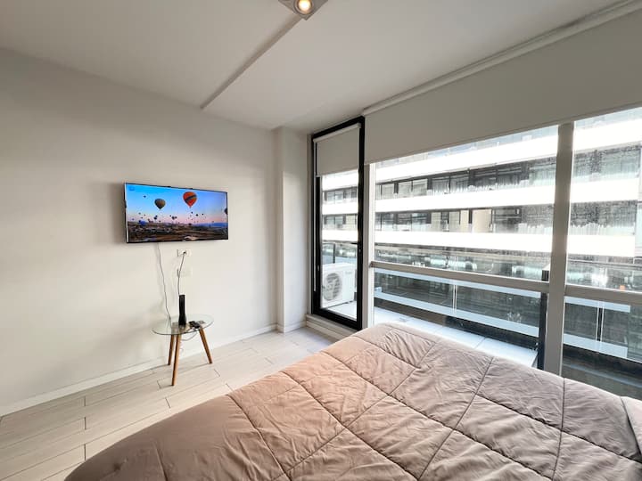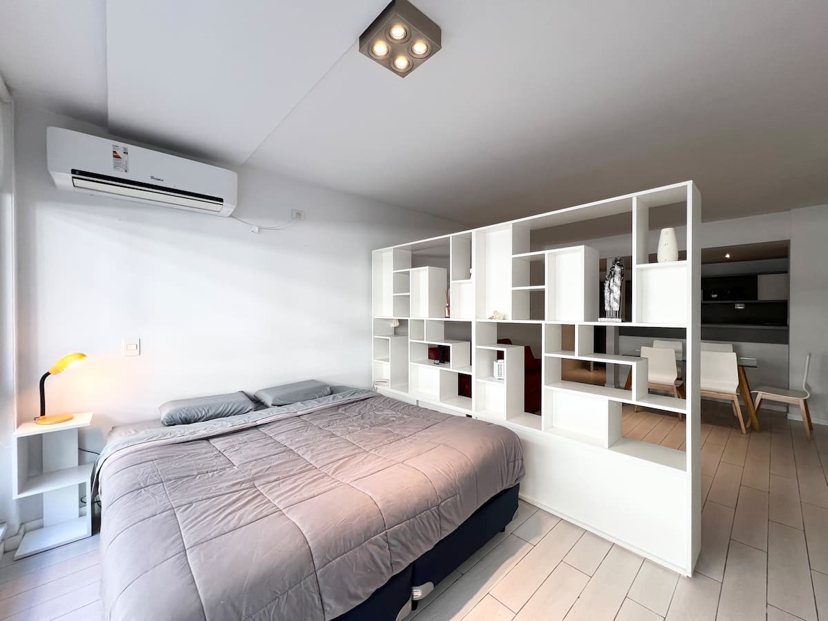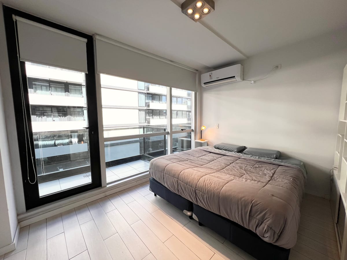 Studio apartment in Puerto Madero, fully equipped. Features include a king-size bed, 100% electric setup, air conditioning with heating, hot water, and a full kitchen with utensils. Includes high-speed TV and internet.