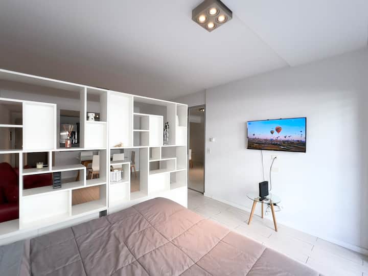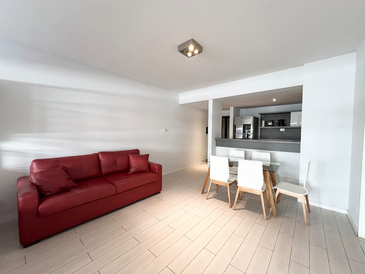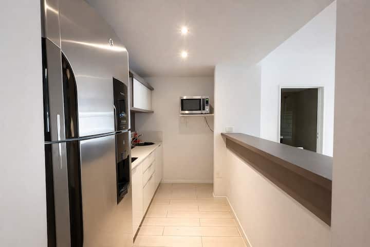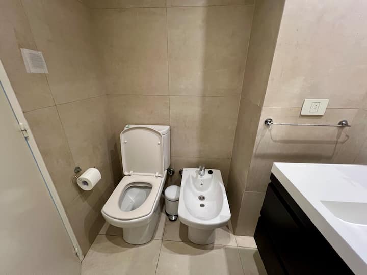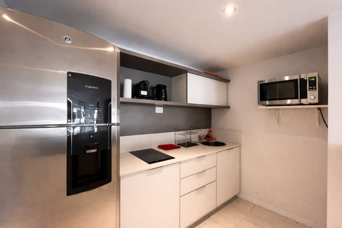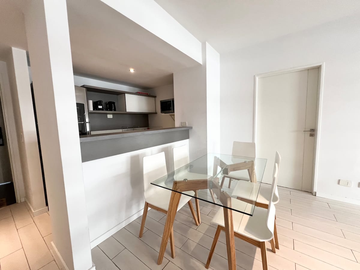 Studio apartment in Puerto Madero, fully equipped. Features include a king-size bed, 100% electric setup, air conditioning with heating, hot water, and a full kitchen with utensils. Includes high-speed TV and internet.