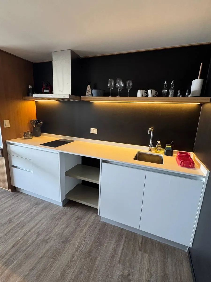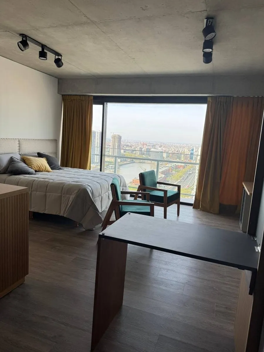Furnished studio apartment on the 33rd floor of a Puerto Madero tower, southeast-facing. It includes a single room with an incorporated kitchen and a balcony. The project has amenities on the top two floors, including residents' lounges, a gym, changing rooms, a spa with hot tubs, saunas and a Finnish sauna, and an outdoor pool with a solarium, plus covered BBQ areas with grills on the 36th floor. The complex is planned with two twin towers, communal underground levels with assigned parking and