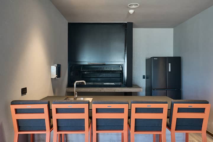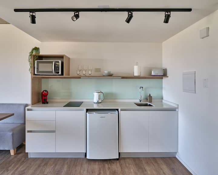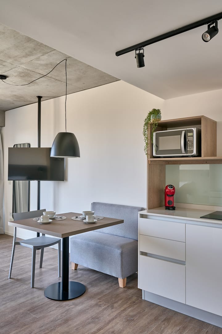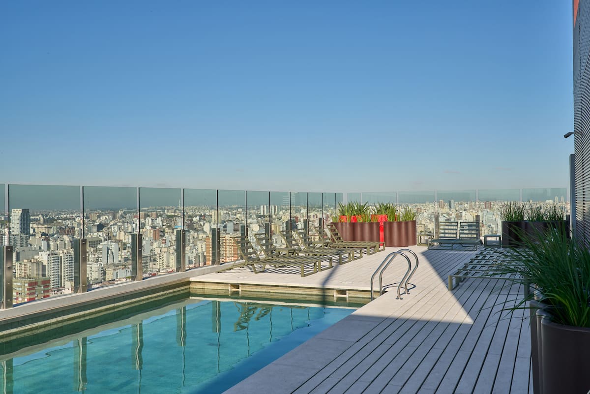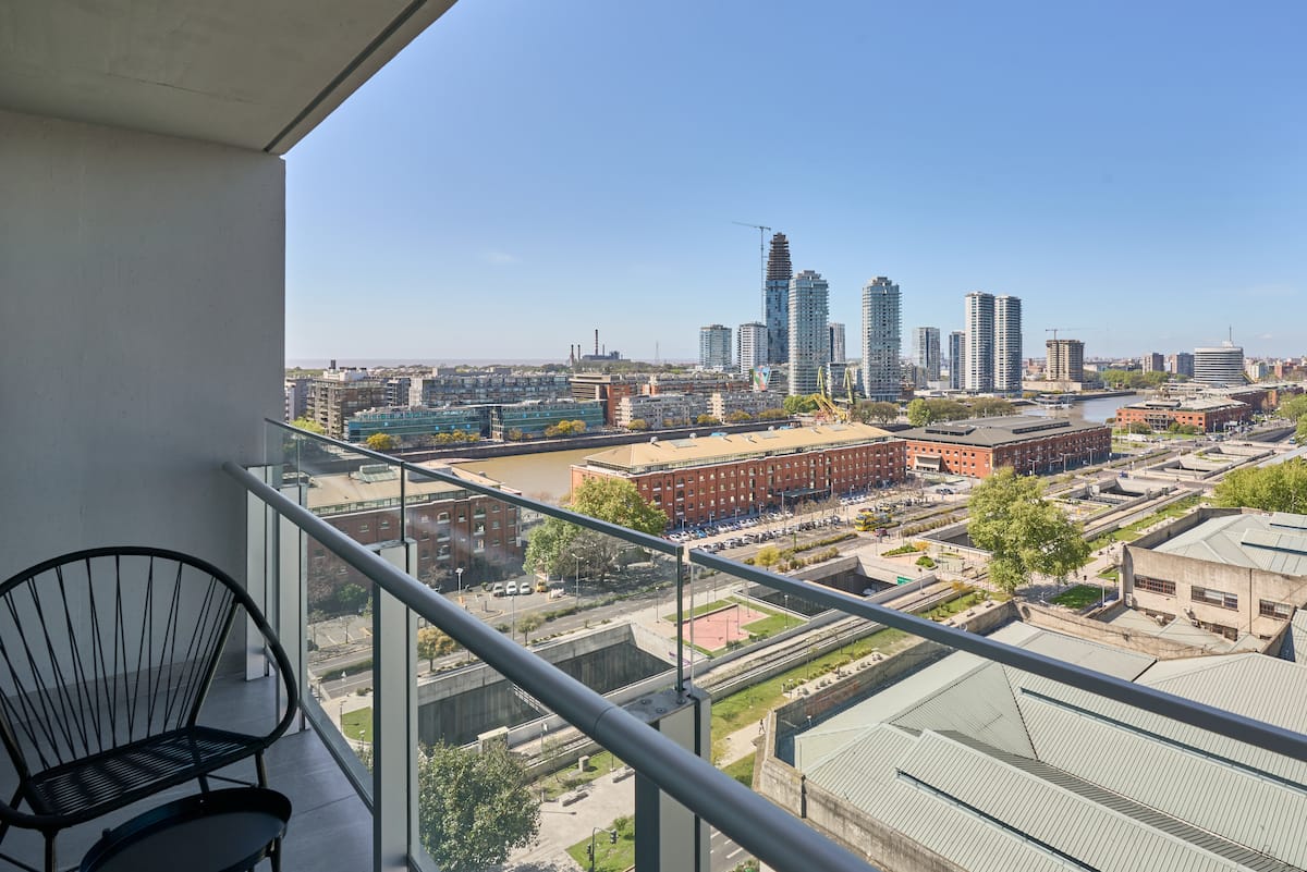 Brand new studio apartment in Puerto Madero with private balcony and views of the river and the city skyline. The studio has a fully equipped kitchen and a full bathroom. The building includes 24-hour security, an outdoor pool, a jacuzzi, a sauna and a gym; the indoor pool/jacuzzi is out of service until further notice.