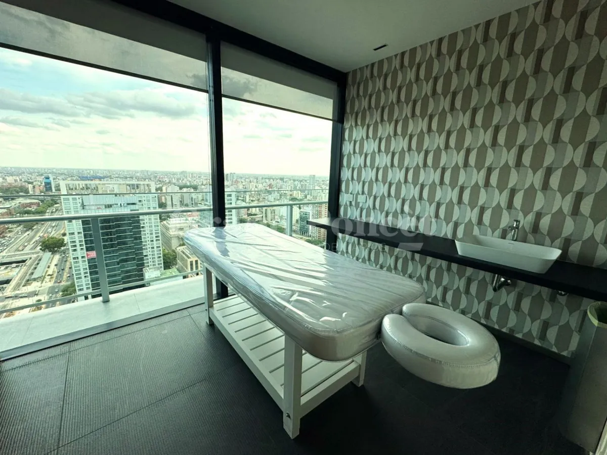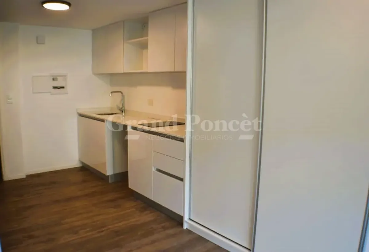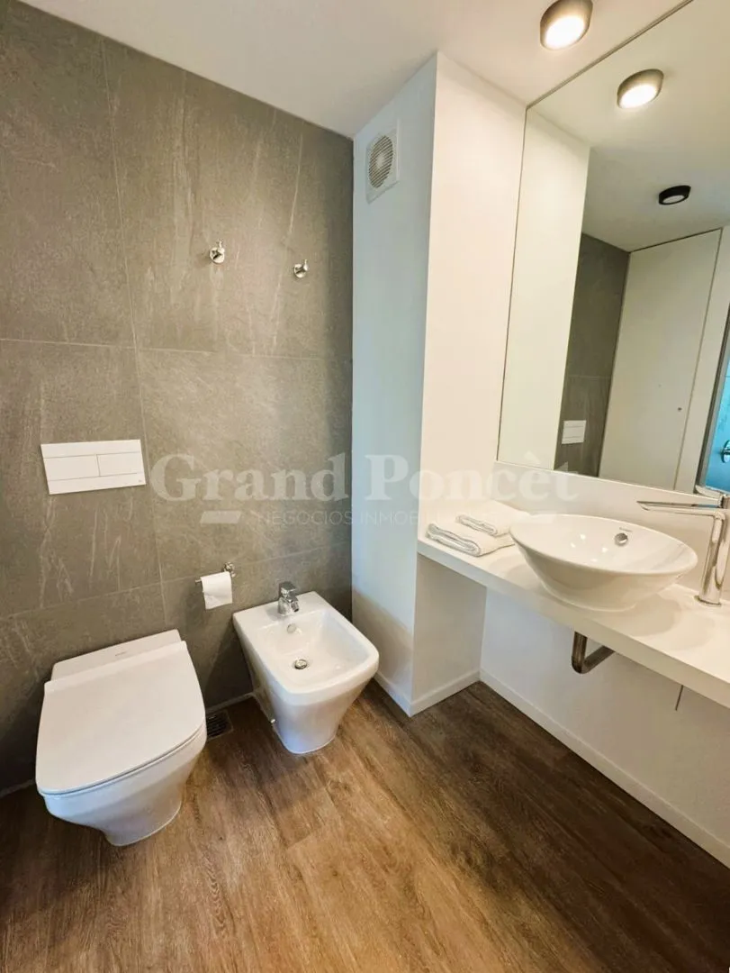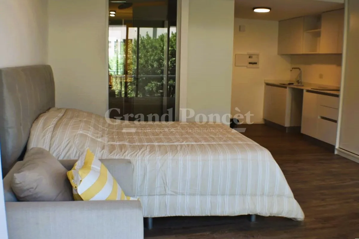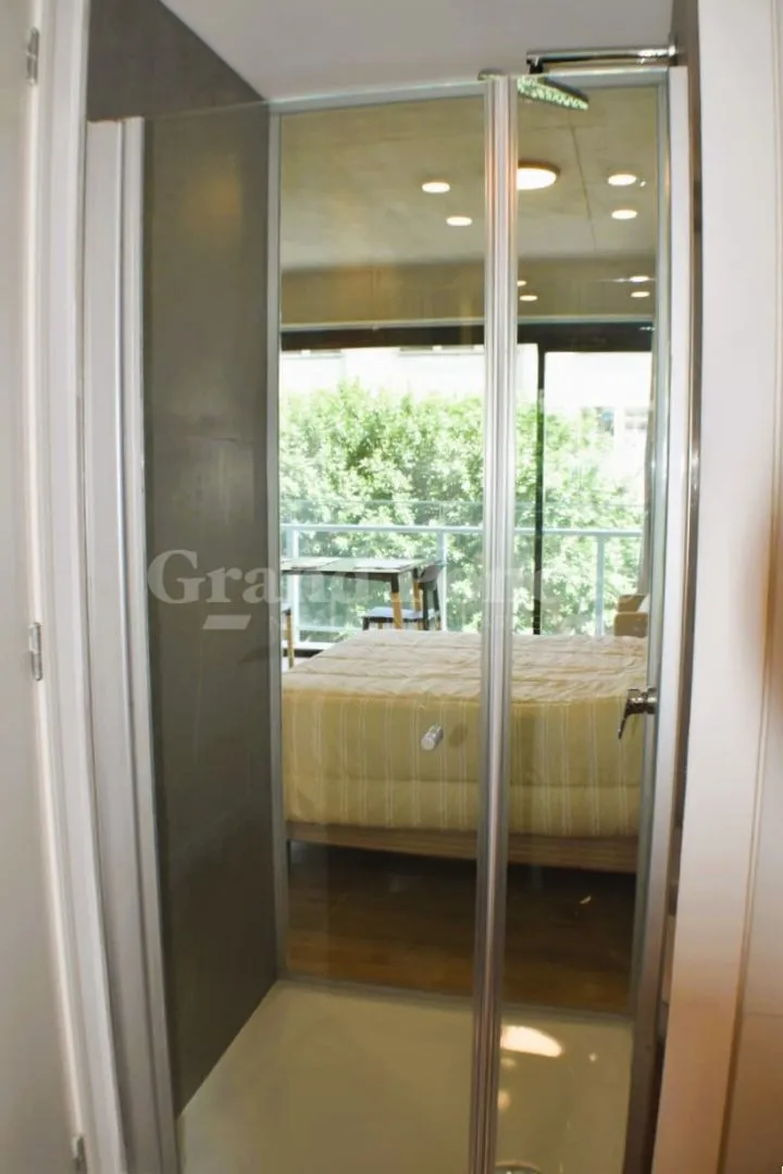 Studio apartment with a balcony in Quartier del Bajo, a complex on the new Paseo del Bajo. Located on the 4th floor of the Torre Rio, southeast-facing, with an open-plan layout including an integrated kitchen, a balcony with an open view, and a shower bathroom. Building amenities are set across the top floors, including a gym, changing rooms, spa with hydromassage, sauna and Finnish baths, an outdoor pool with solarium, and covered BBQ areas with a grill. The complex also includes commercial uni