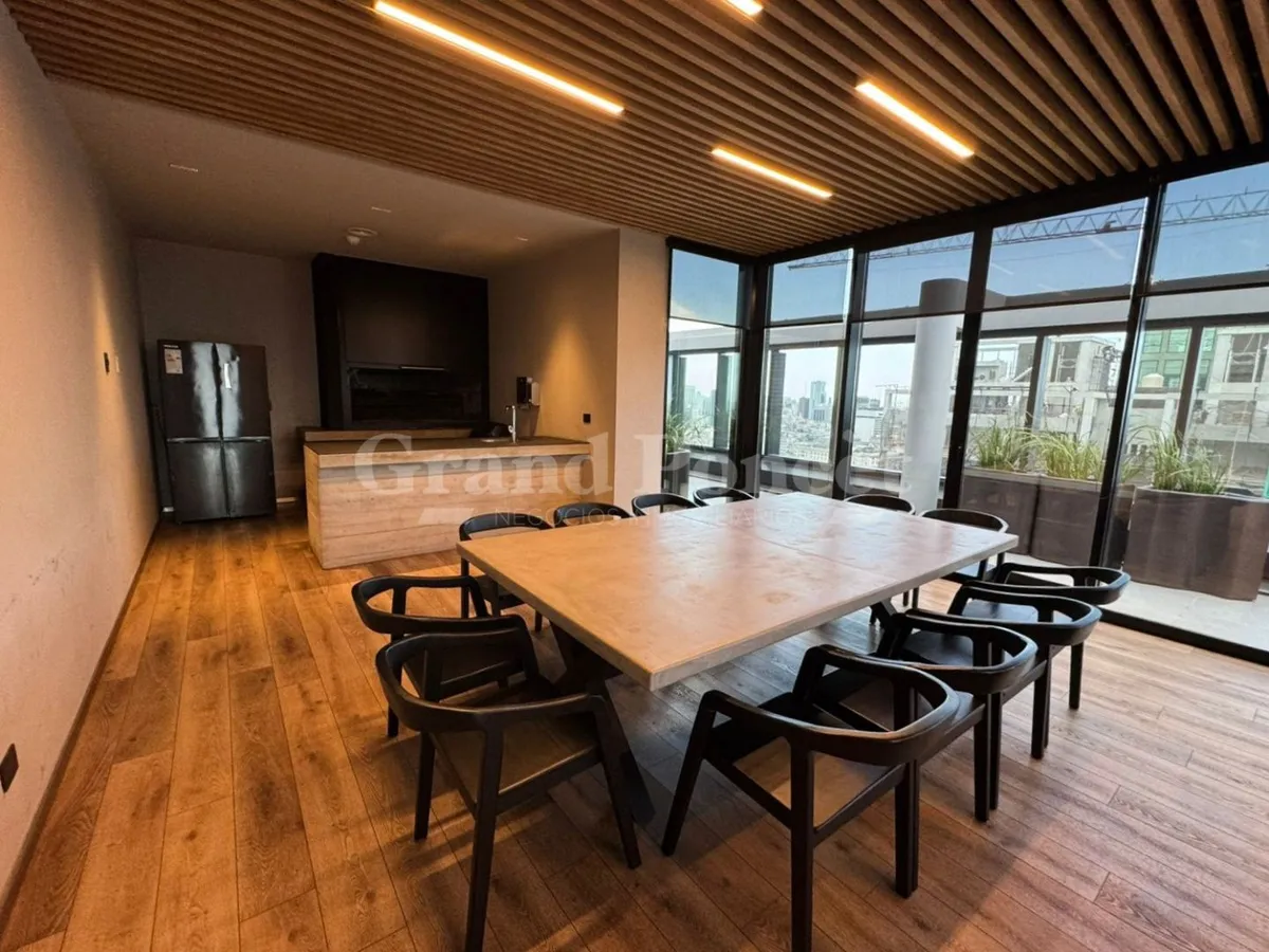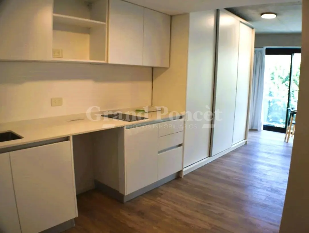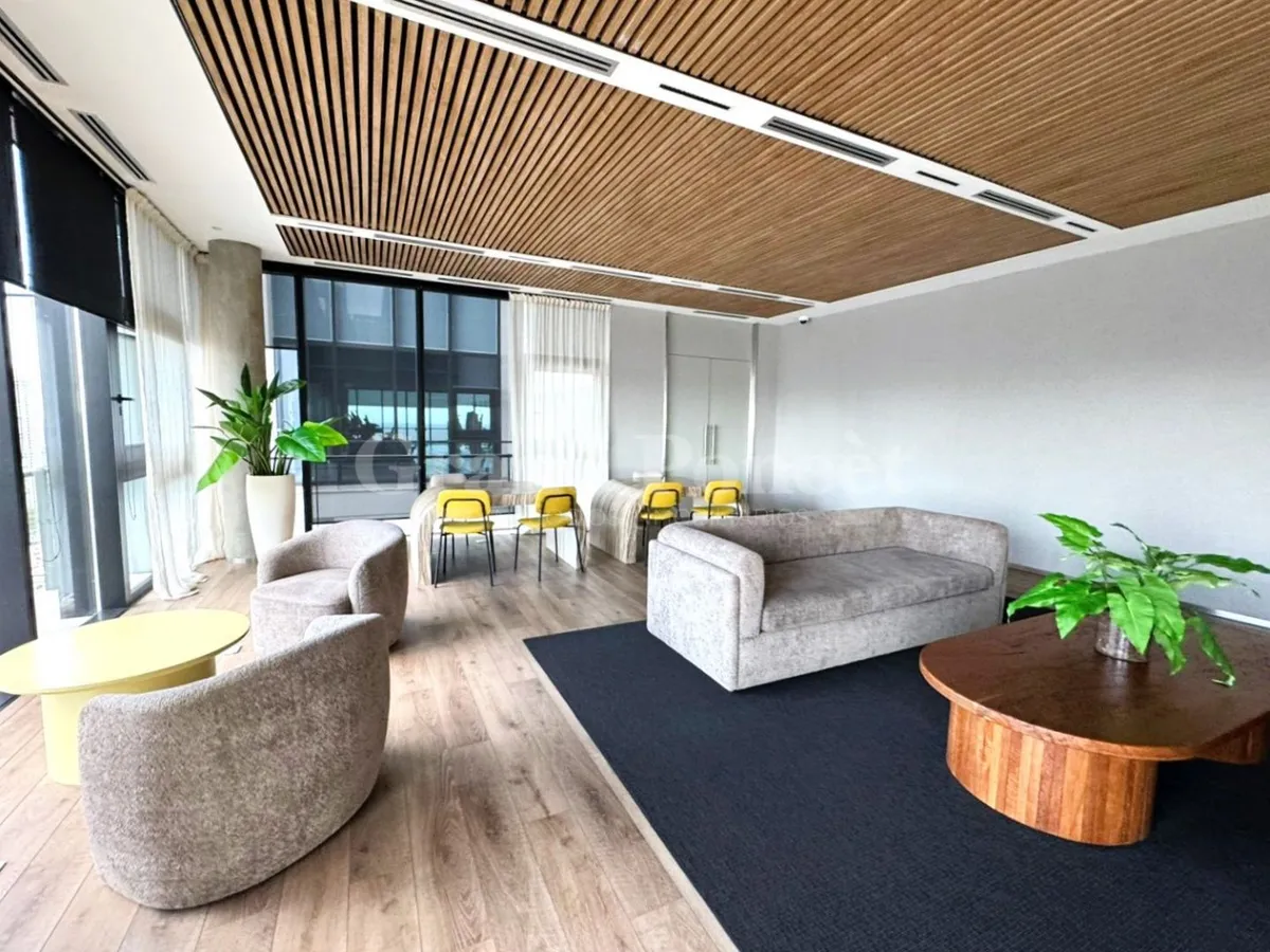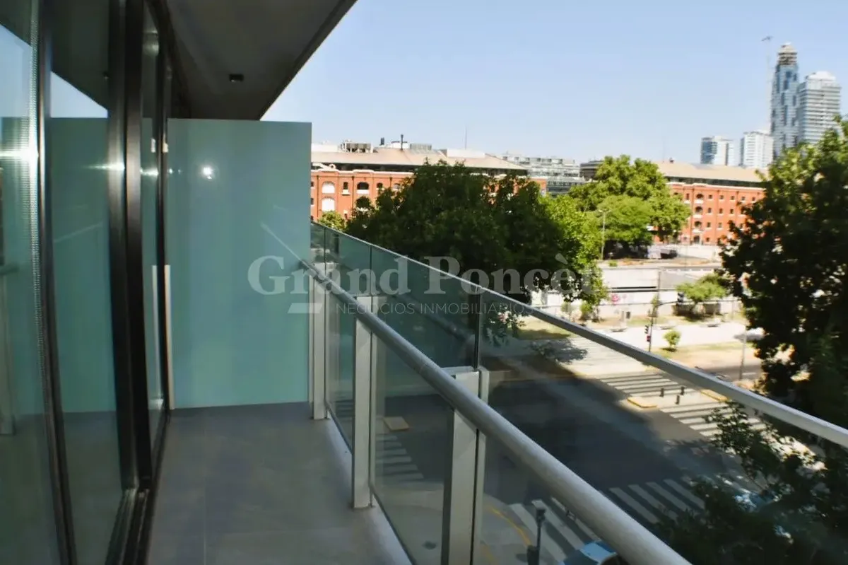 Studio apartment with a balcony in Quartier del Bajo, a complex on the new Paseo del Bajo. Located on the 4th floor of the Torre Rio, southeast-facing, with an open-plan layout including an integrated kitchen, a balcony with an open view, and a shower bathroom. Building amenities are set across the top floors, including a gym, changing rooms, spa with hydromassage, sauna and Finnish baths, an outdoor pool with solarium, and covered BBQ areas with a grill. The complex also includes commercial uni